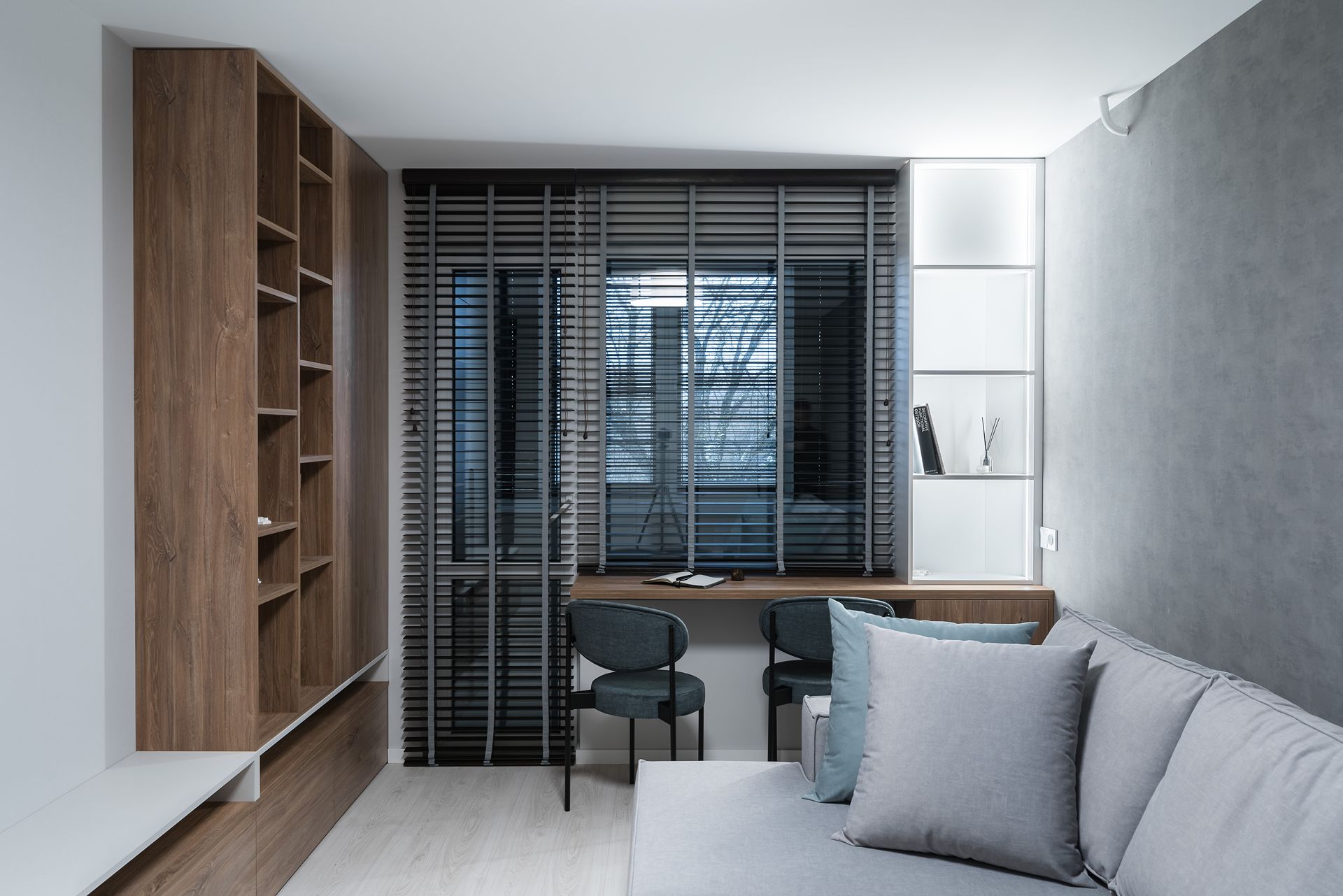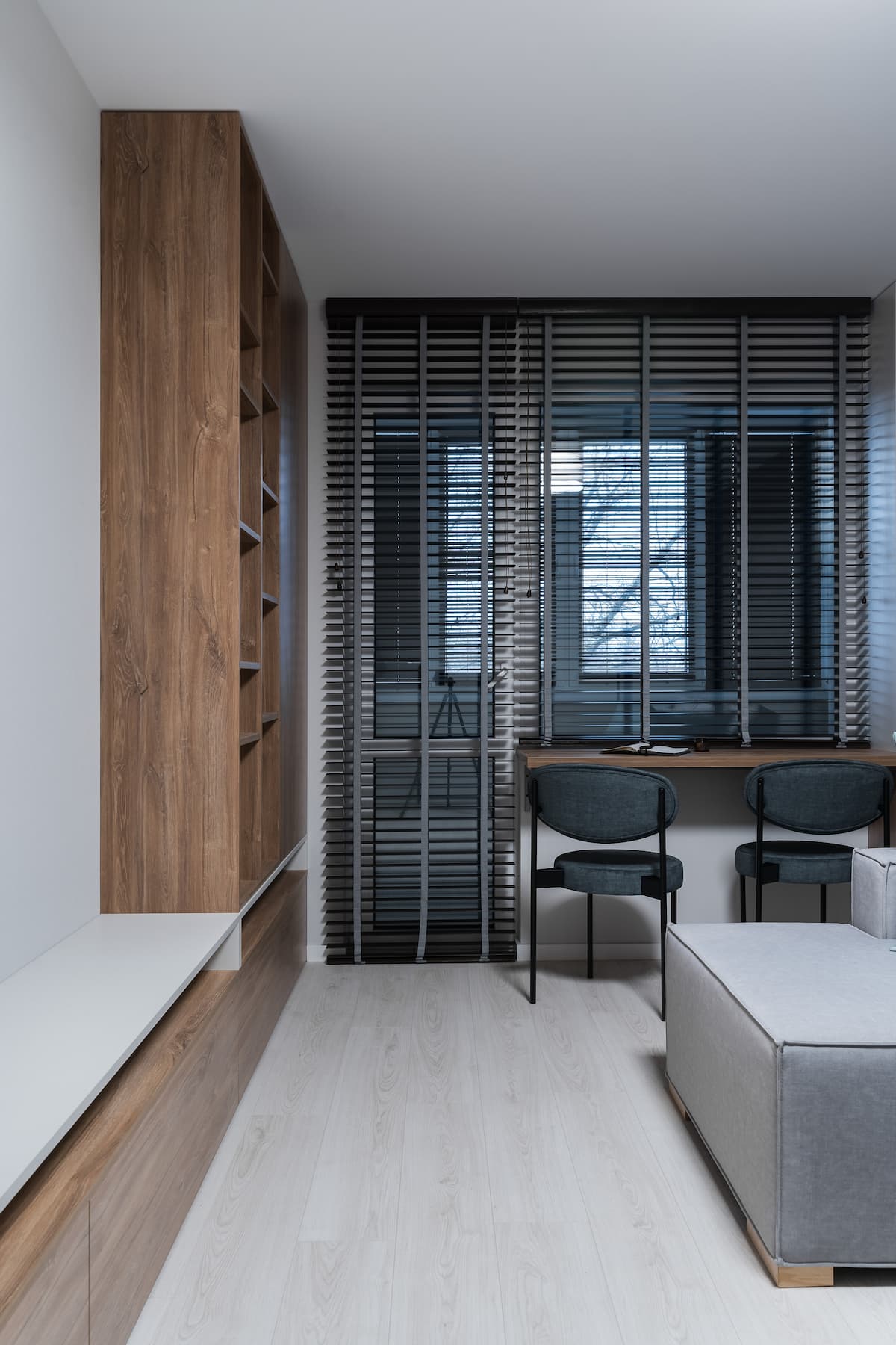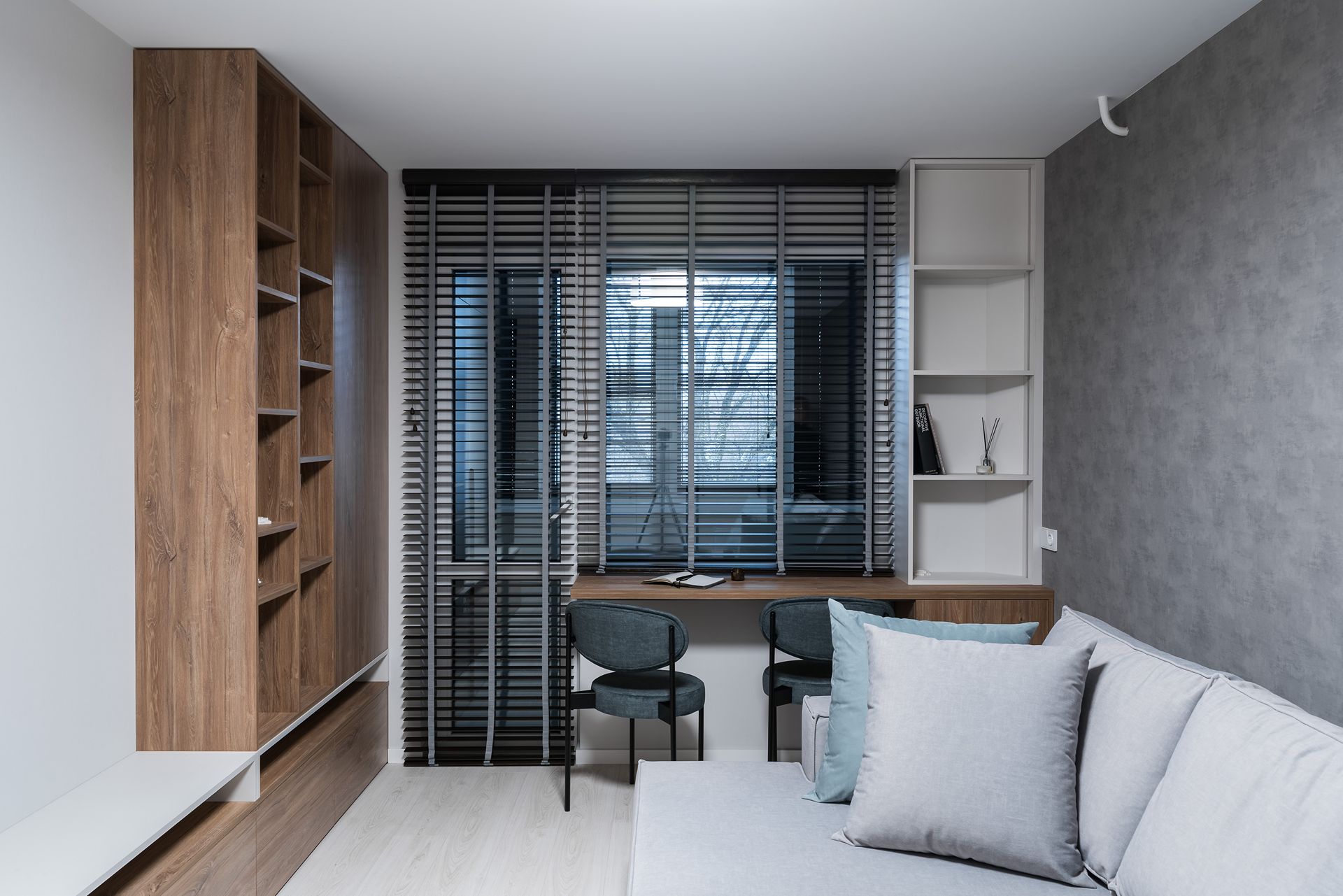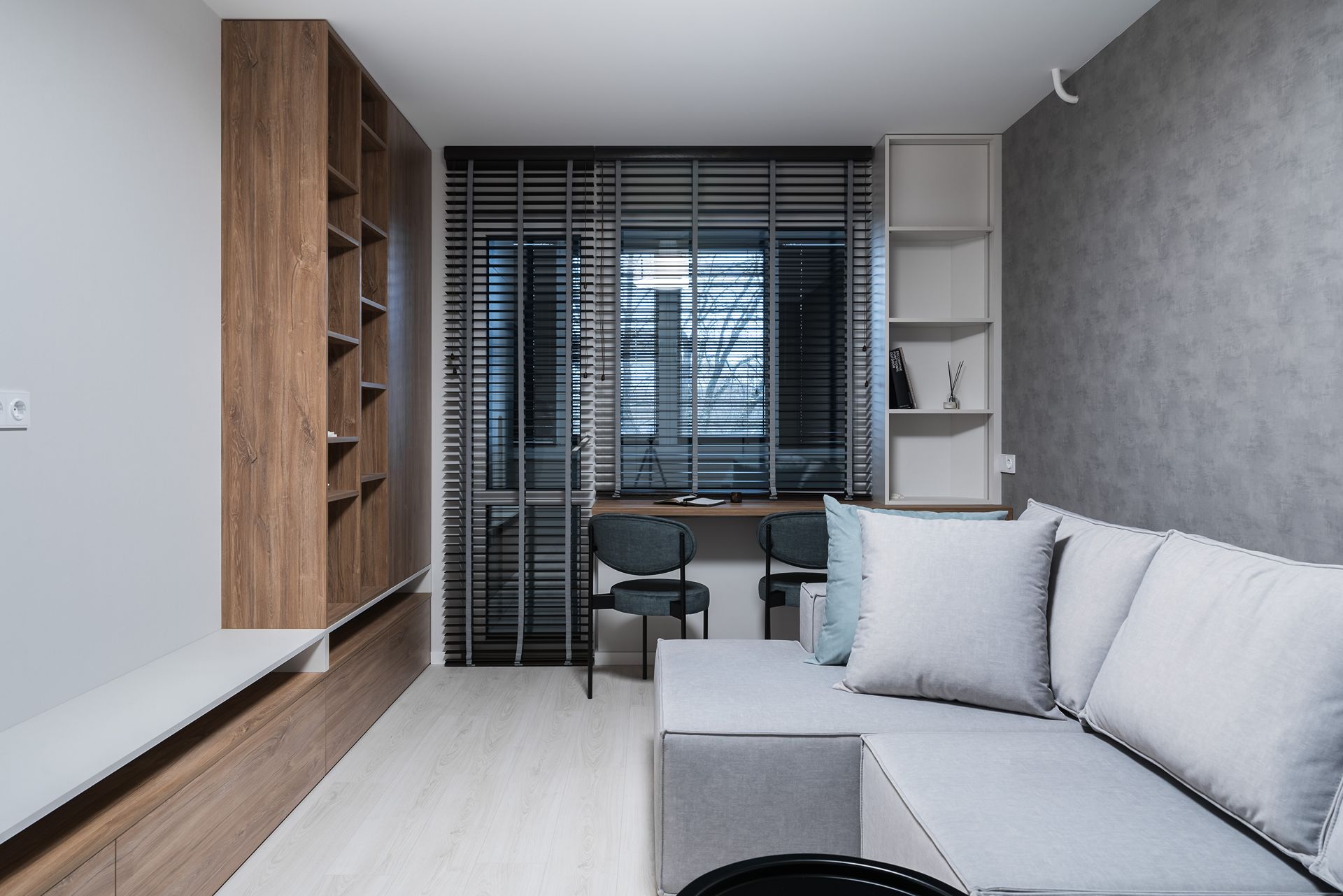 К нам обратились с готовым дизайн-проектом от студии «Ателит», в котором был заложен современный, лаконичный стиль с акцентом на натуральные текстуры и чёткие линии. Наша задача — воплотить задумку в жизнь, учитывая сложную конфигурацию стен и сохраняя гармонию интерьера.