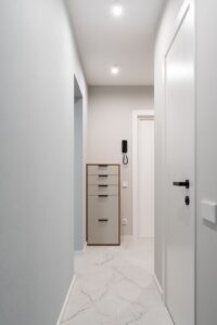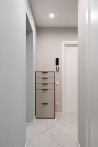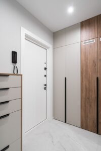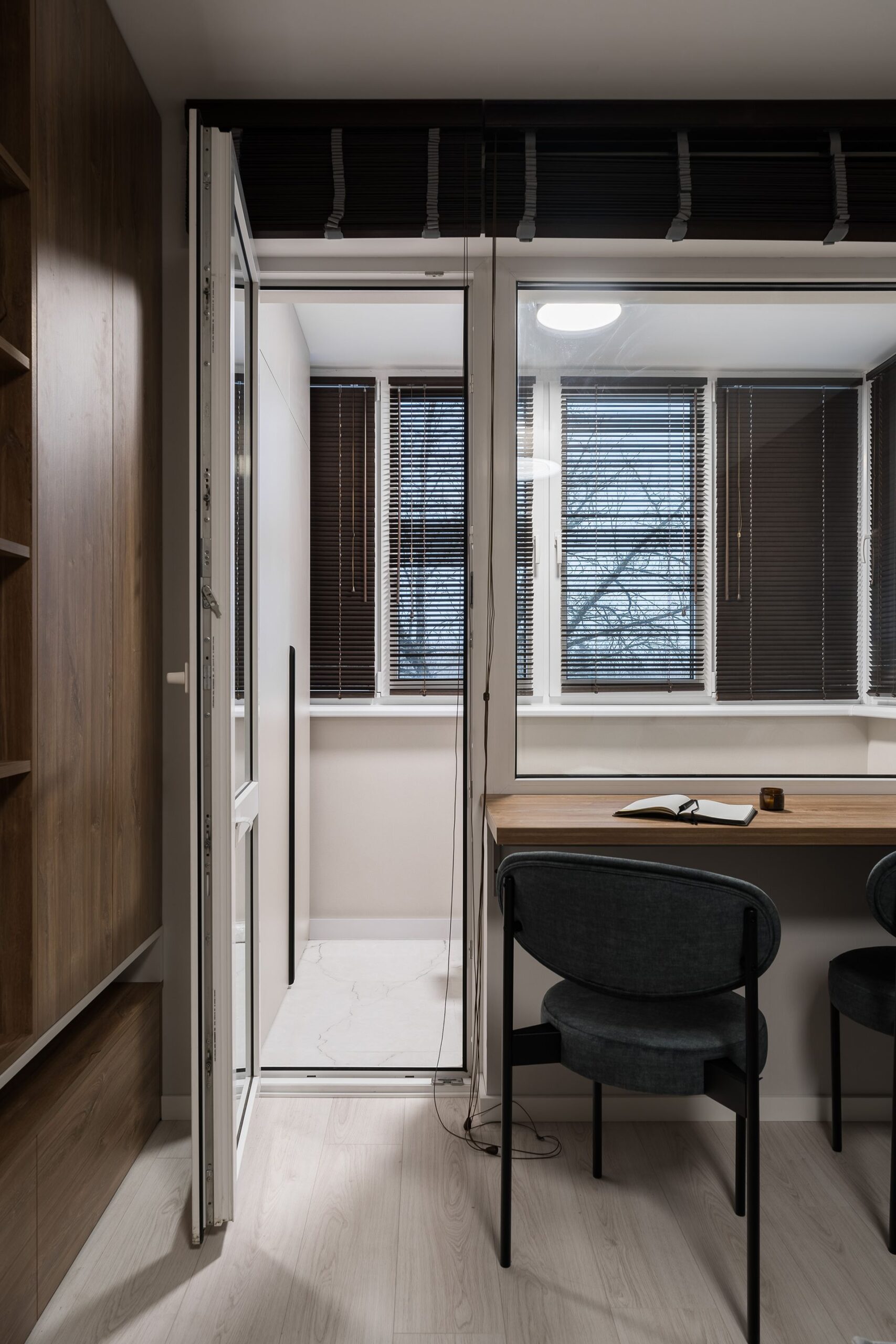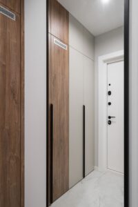 Эта квартира — не просто жильё, а архитектурная особенность: она находится в угловом подъезде, а значит, имеет нестандартную трапециевидную геометрию помещений. Такие планировки требуют особого подхода: точных замеров, индивидуального проектирования и безупречного мастерства при производстве и монтаже.
