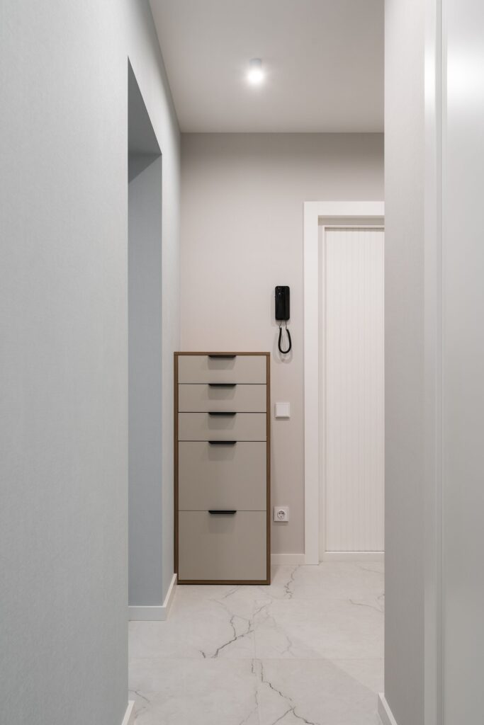 - Системы хранения в прихожей и спальне с учётом наклонных стен