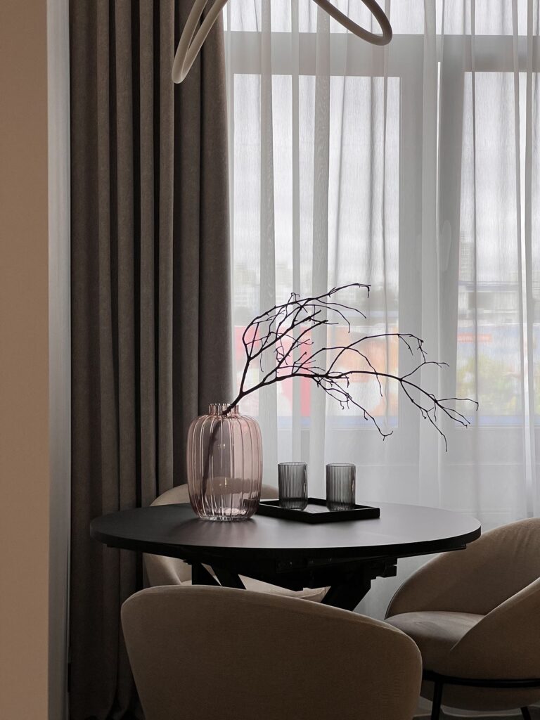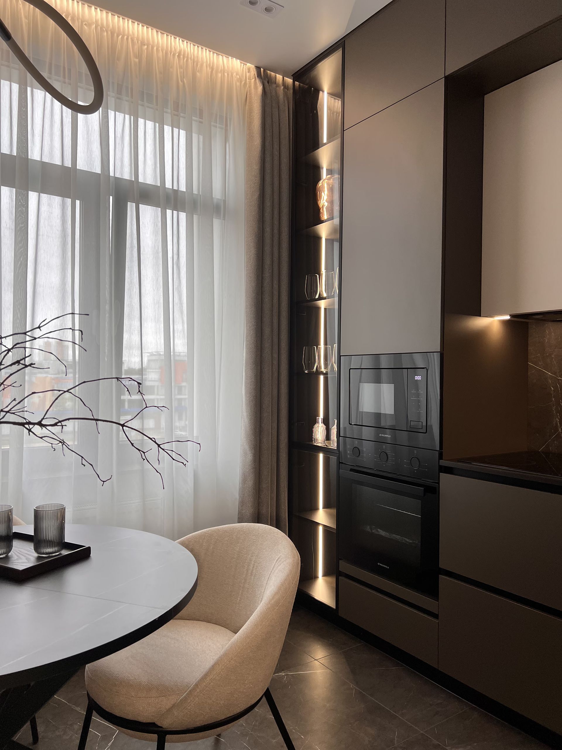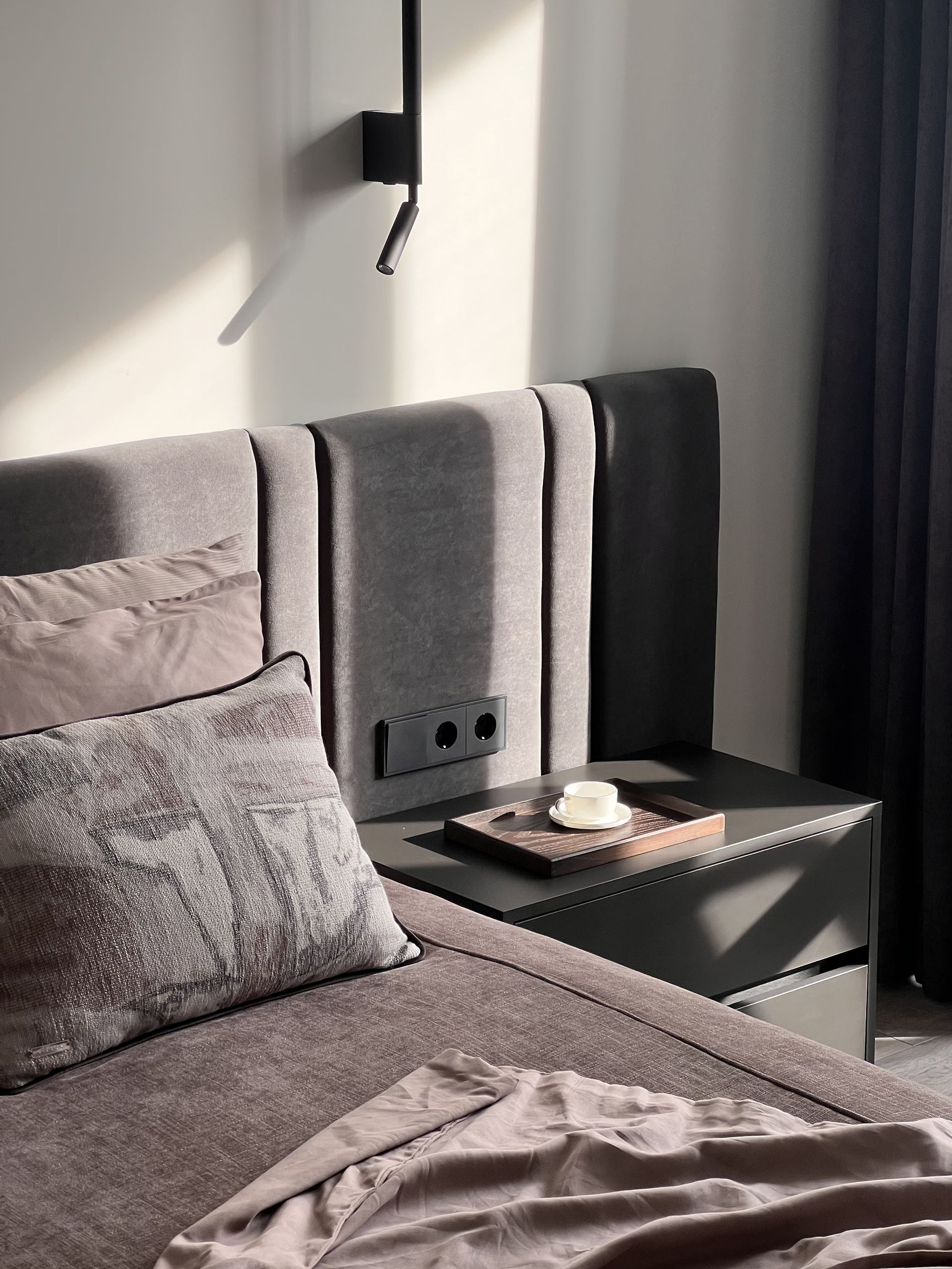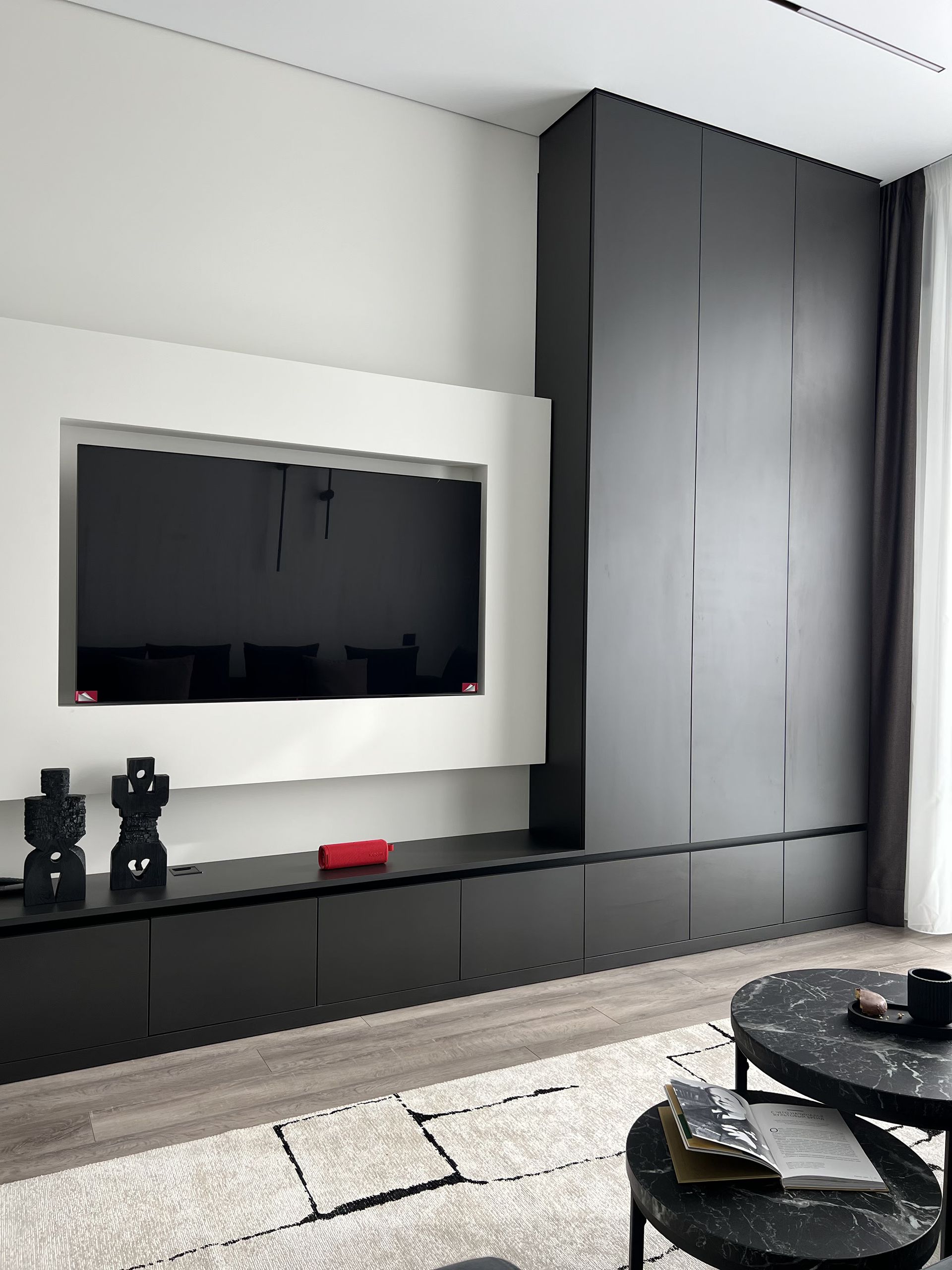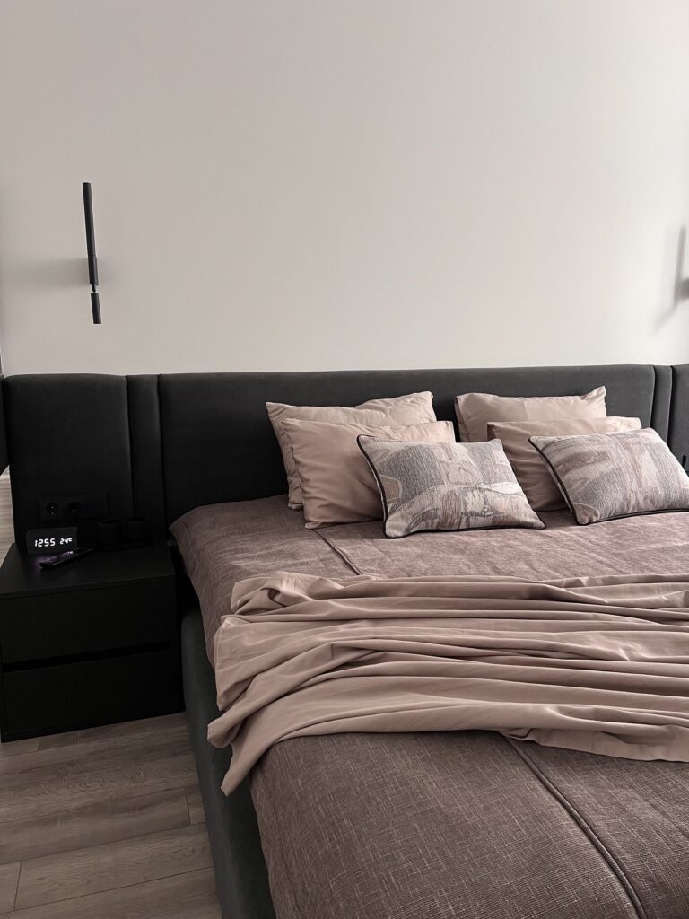 От контрольного замера до финальной сборки прошло около 3 месяцев. В результате получился интерьер в стиле «тихой роскоши»: глубокие тёмные акценты, мягкие текстуры, натуральное дерево, лаконичные формы и продуманное освещение. Здесь нет лишнего декора — каждая деталь работает на ощущение уюта, спокойствия и визуальной целостности.