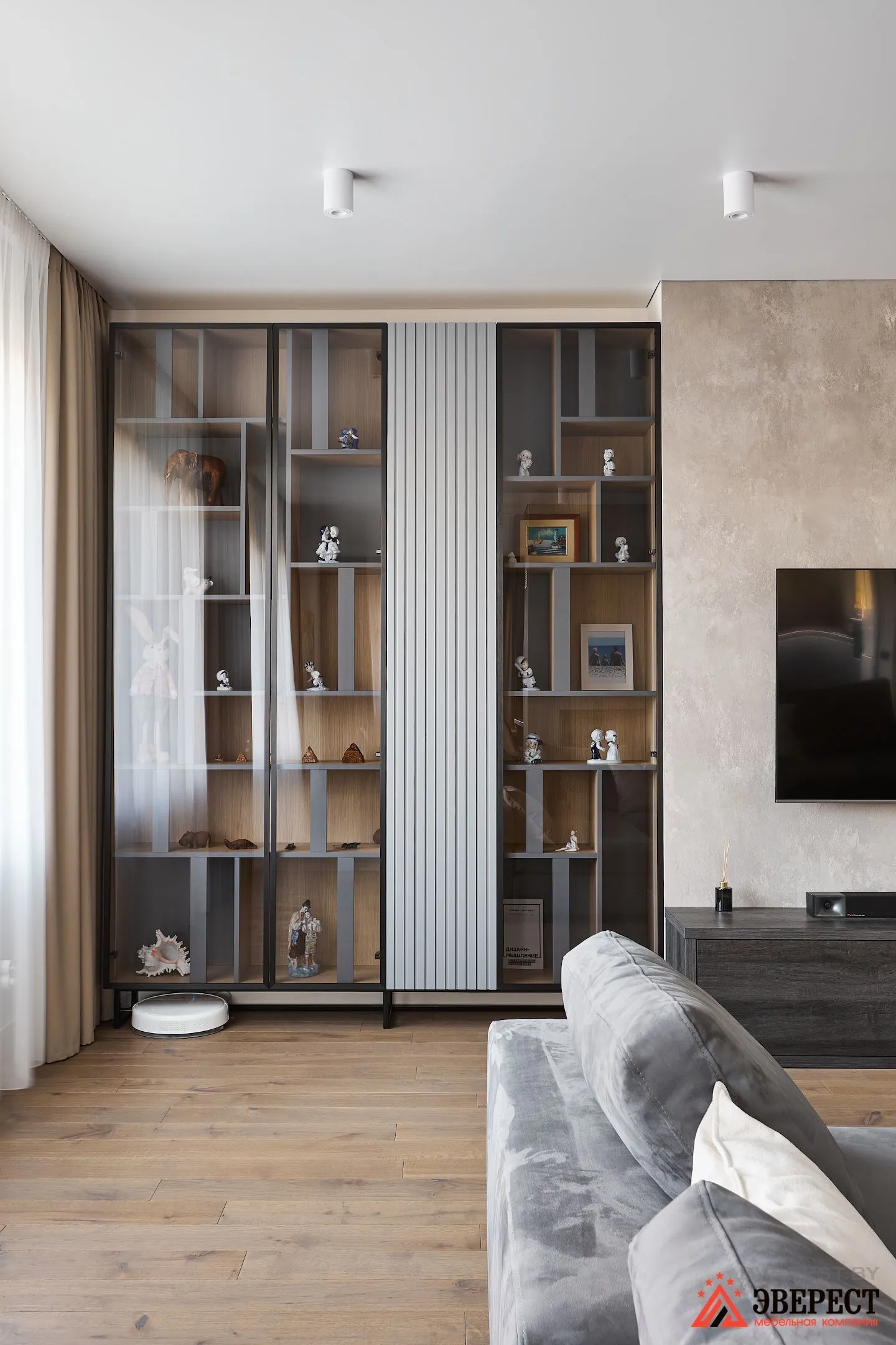 Крупные предметы мебели в сочетании с мелкими деталями и стеклянными витринами привлекают внимание, но не перегружают общую картину.