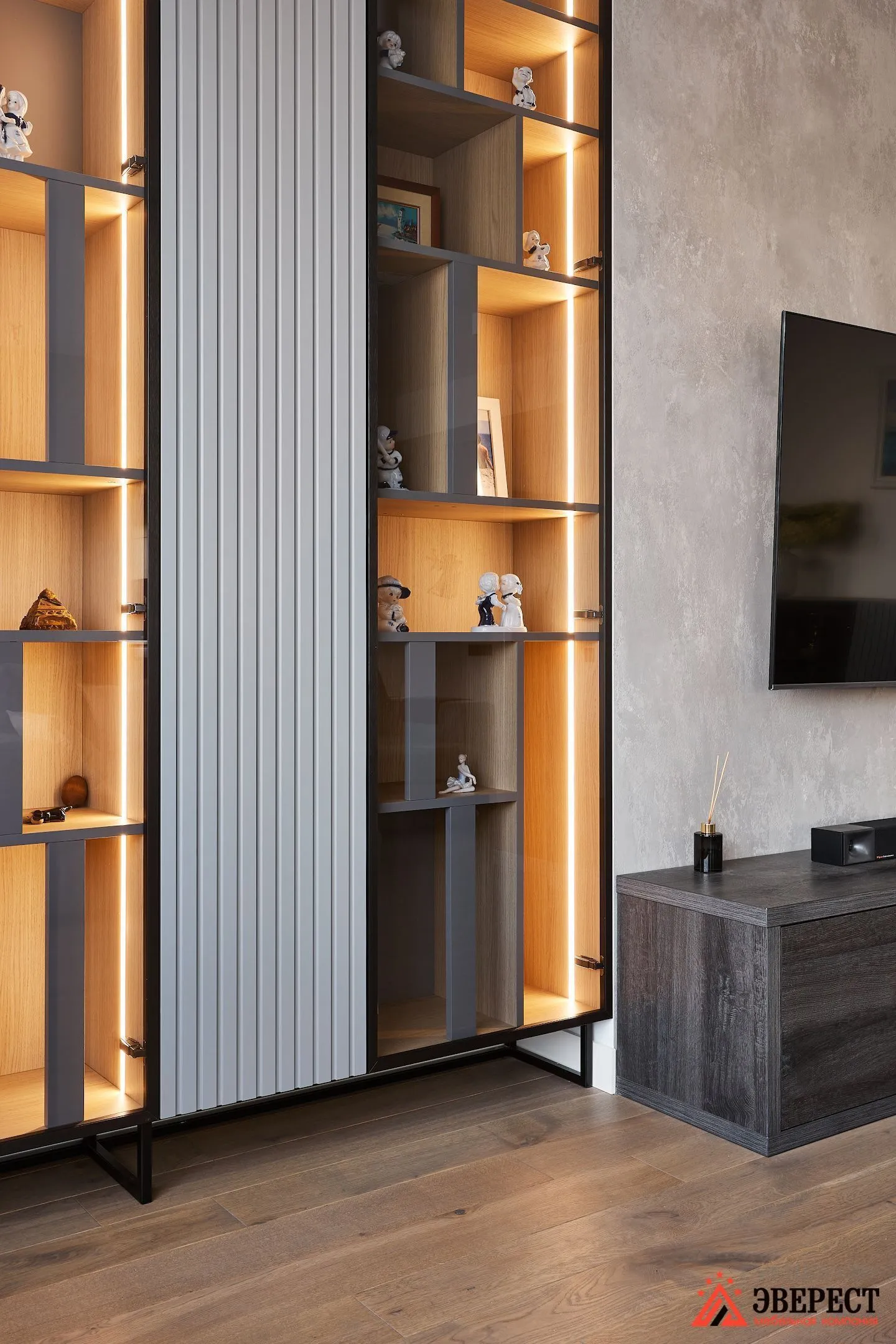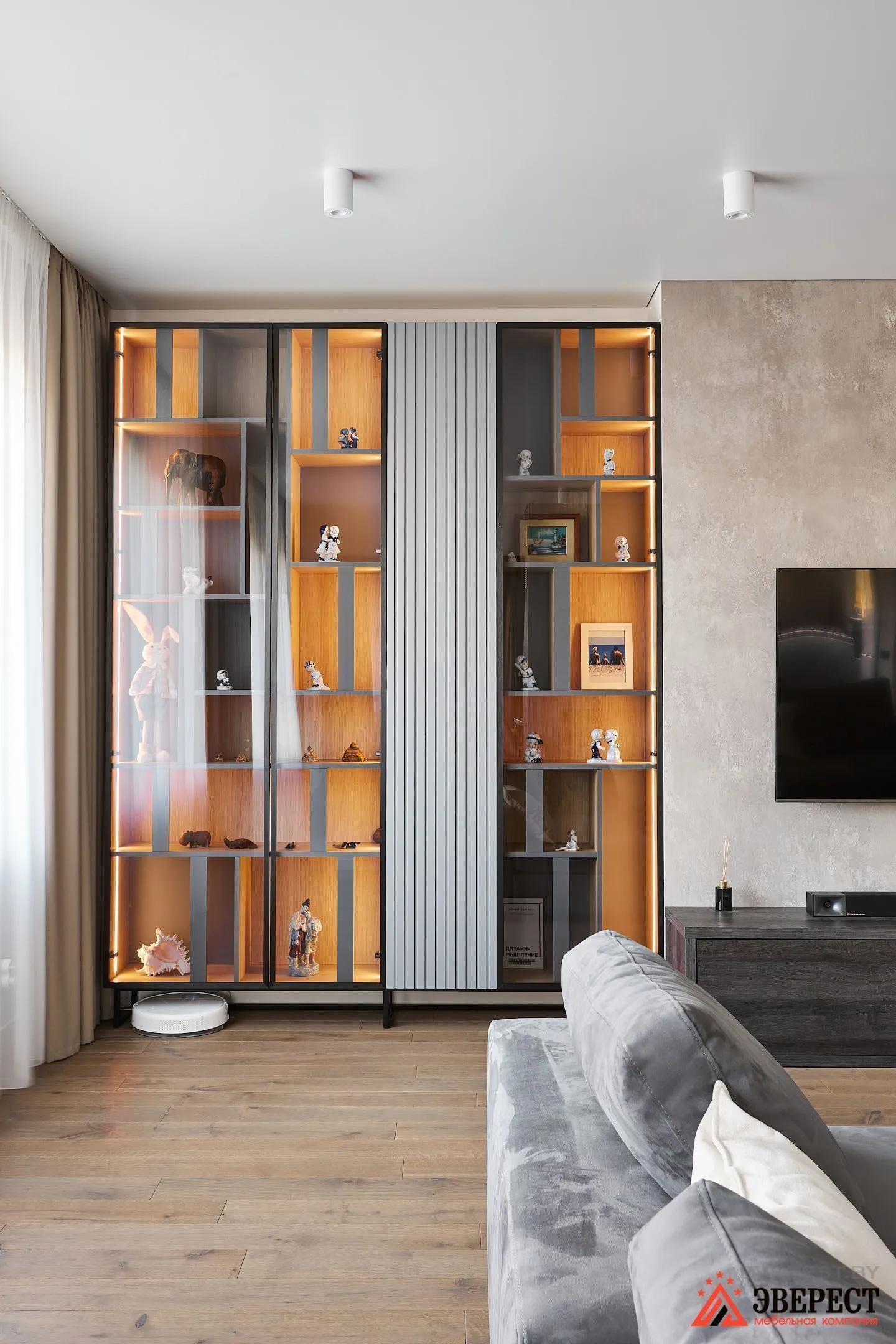Врезное освещение в витринах шкафа с теплым светом.
