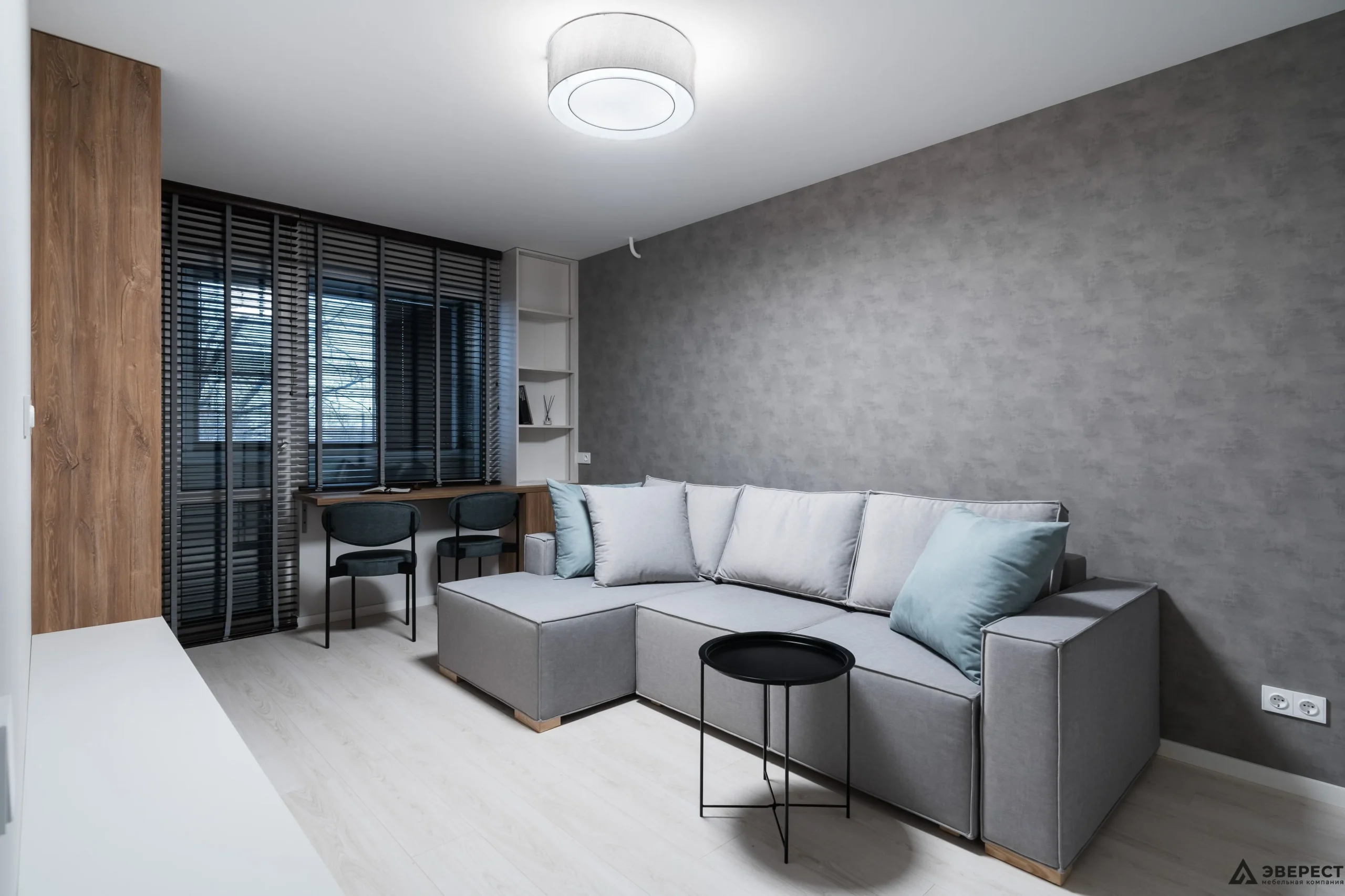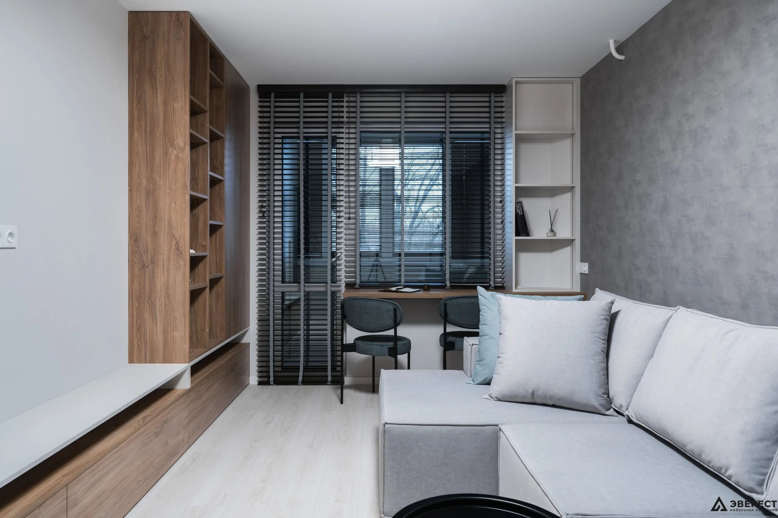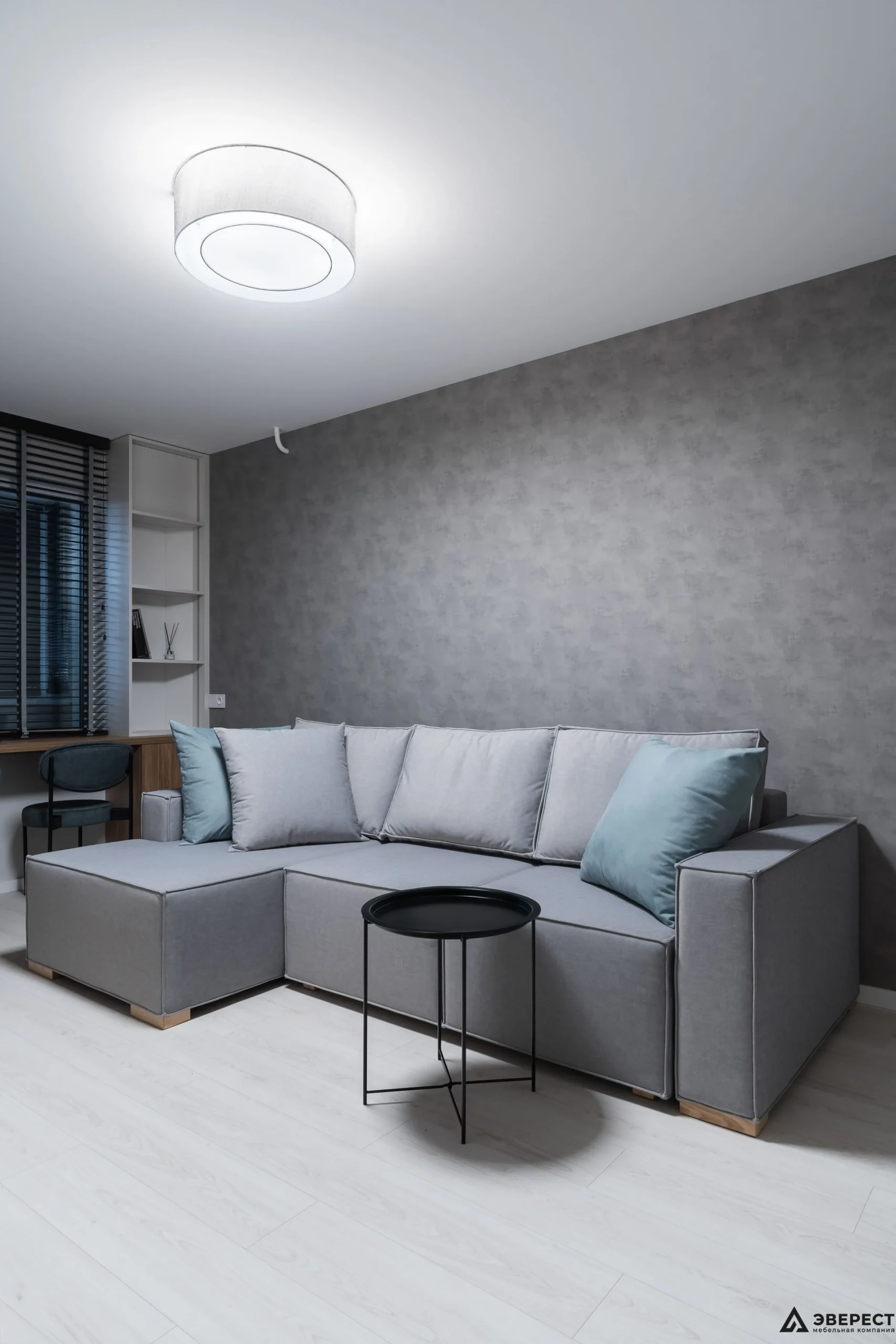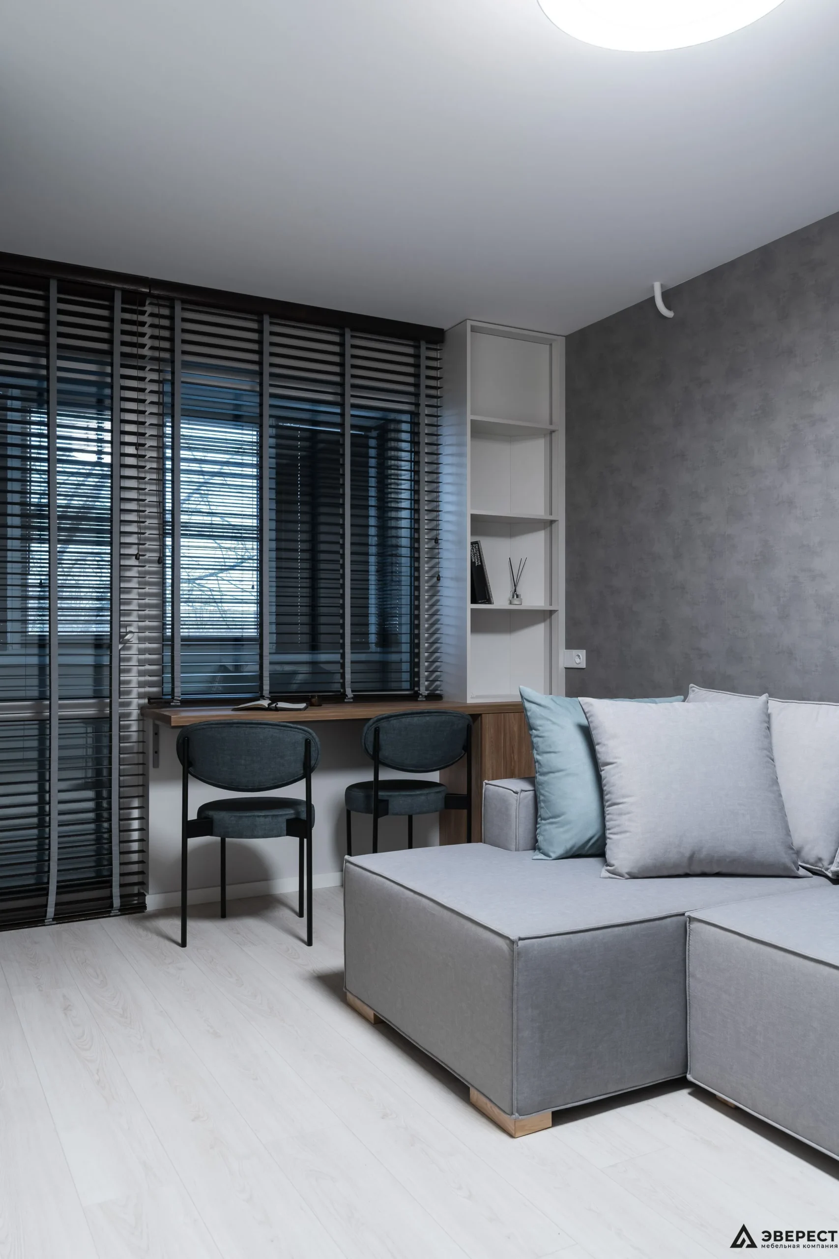 Эта гостиная объединяет в себе всё, что нужно для современного дома: комфорт для отдыха, удобство для работы и стильный дизайн, который радует глаз.