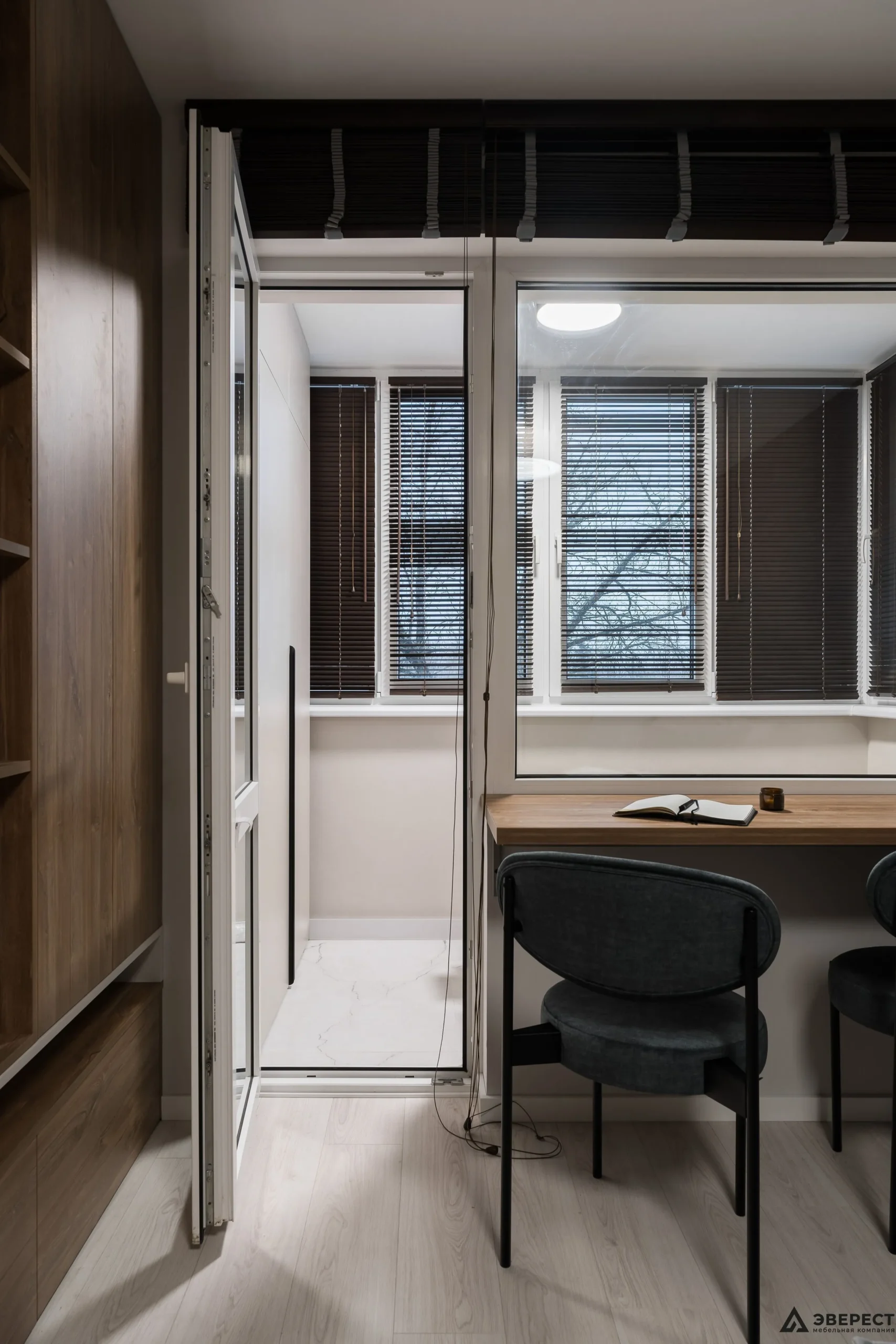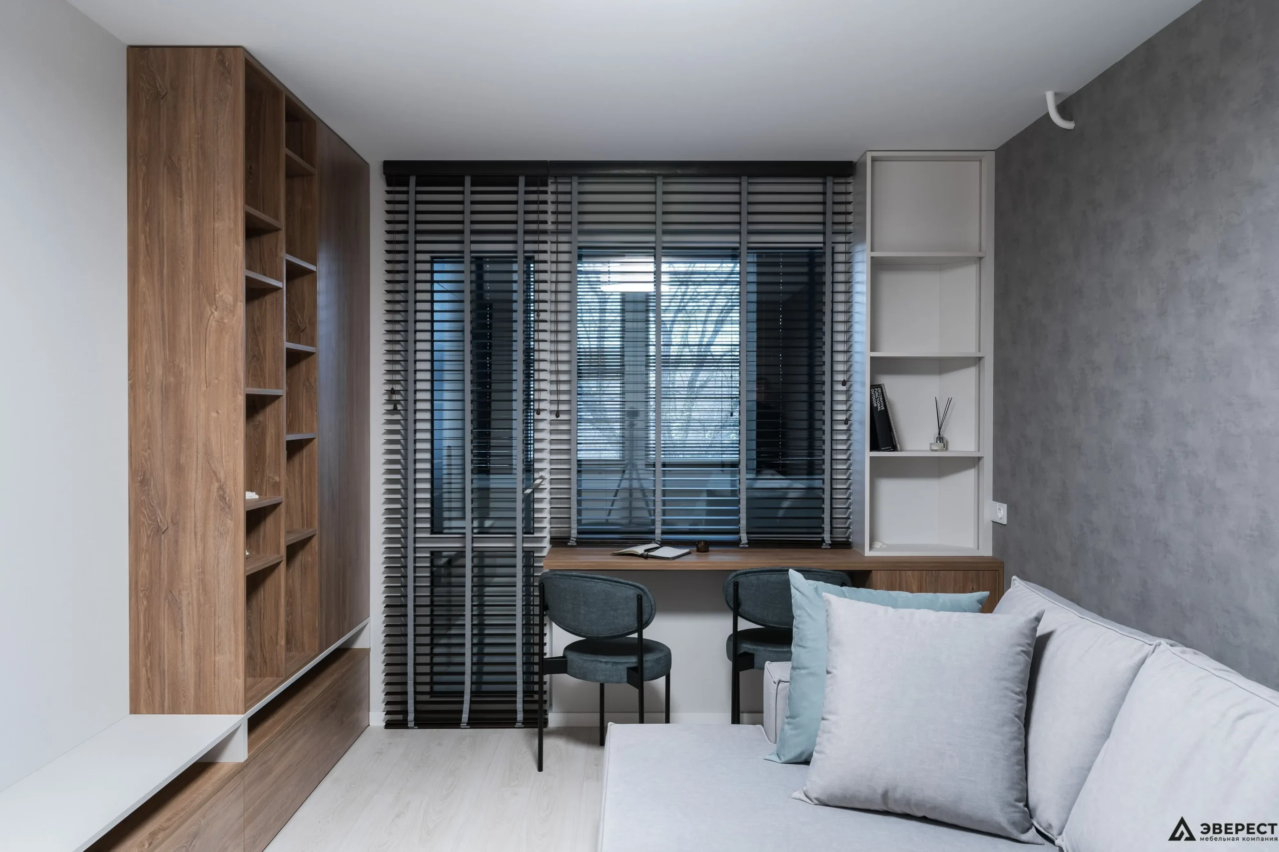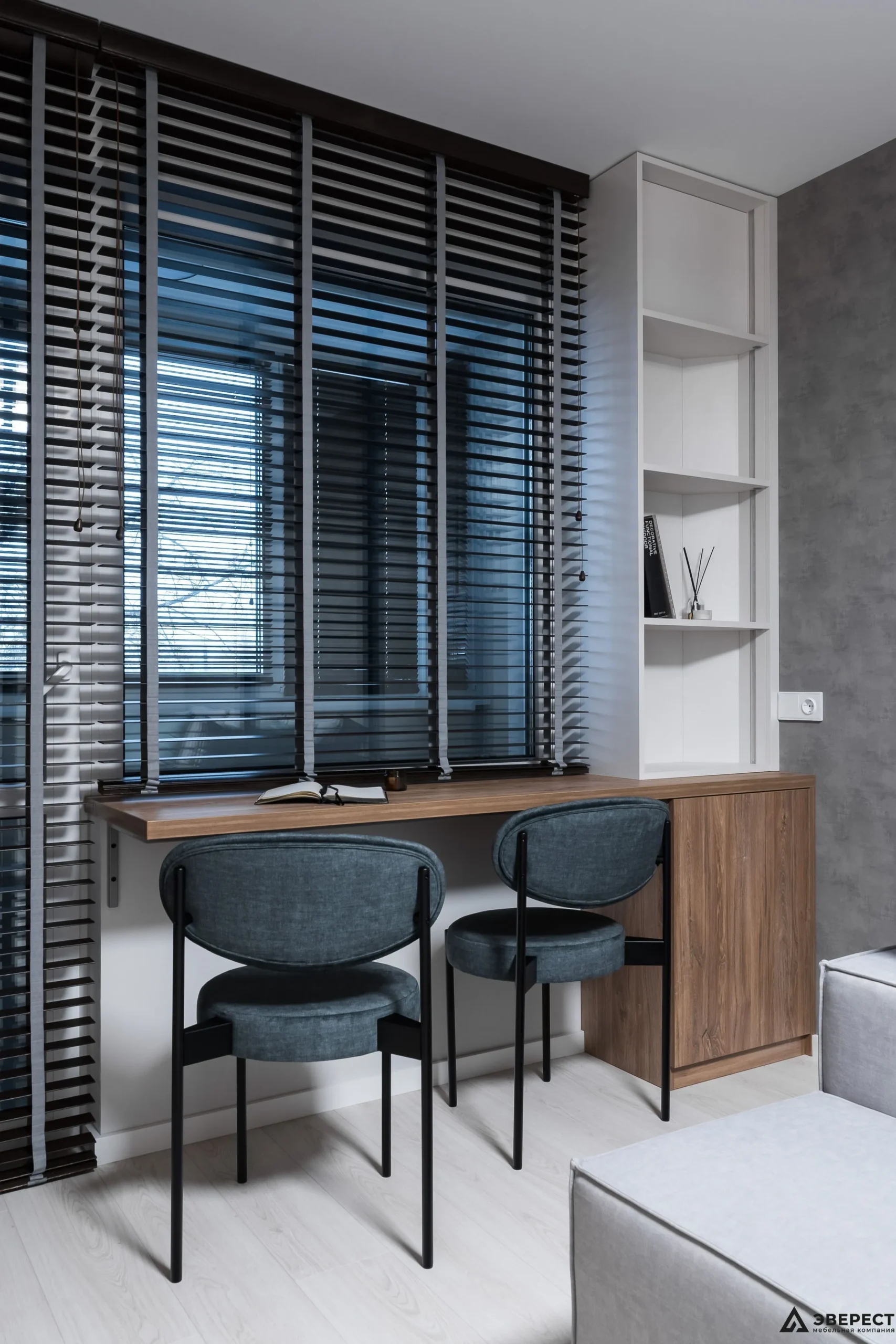 Рабочая зона расположилась у окна и стала настоящей изюминкой этой комнаты. Мы демонтировали подоконник, чтобы установить столешницу прямо под окно — теперь здесь максимально естественное освещение.