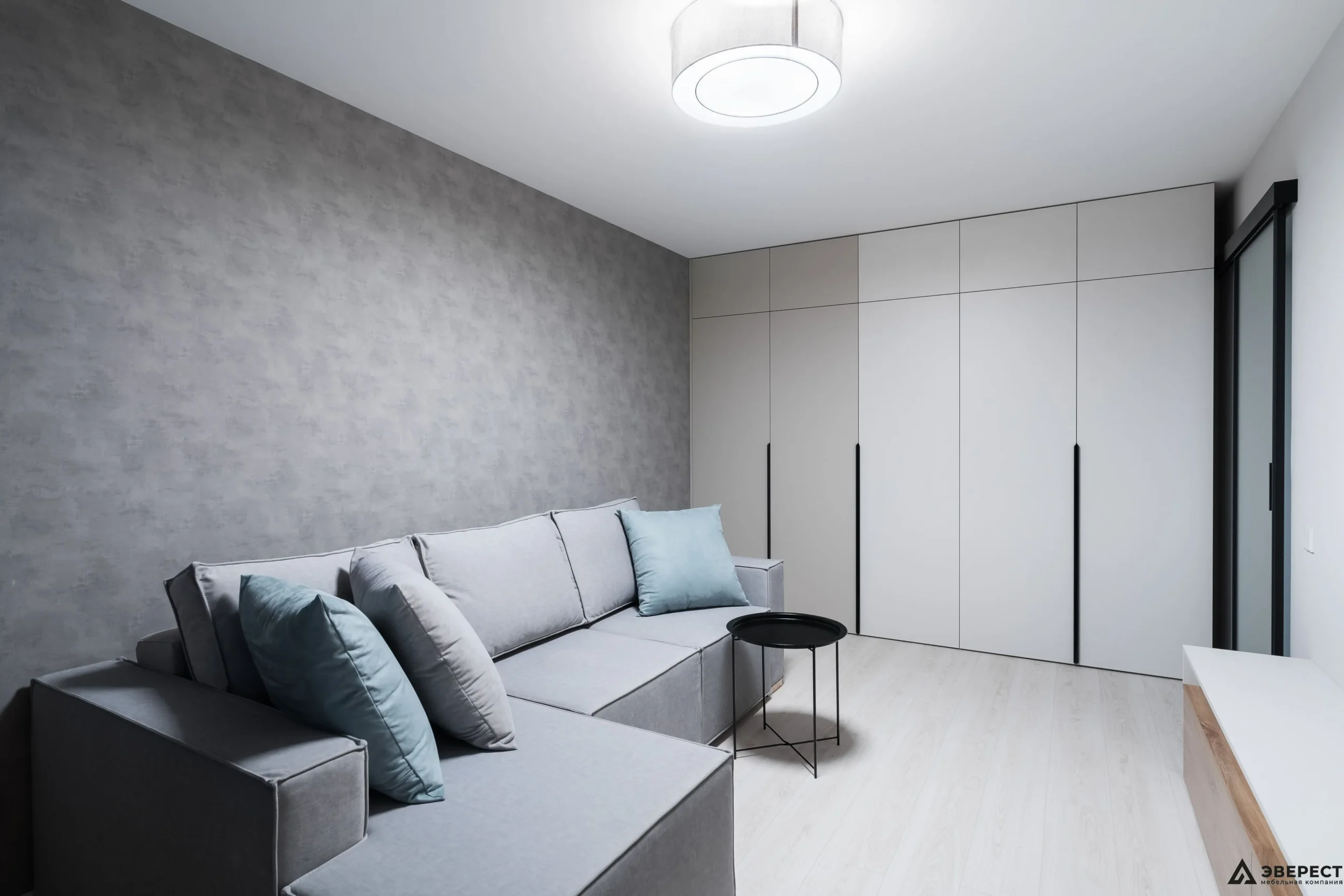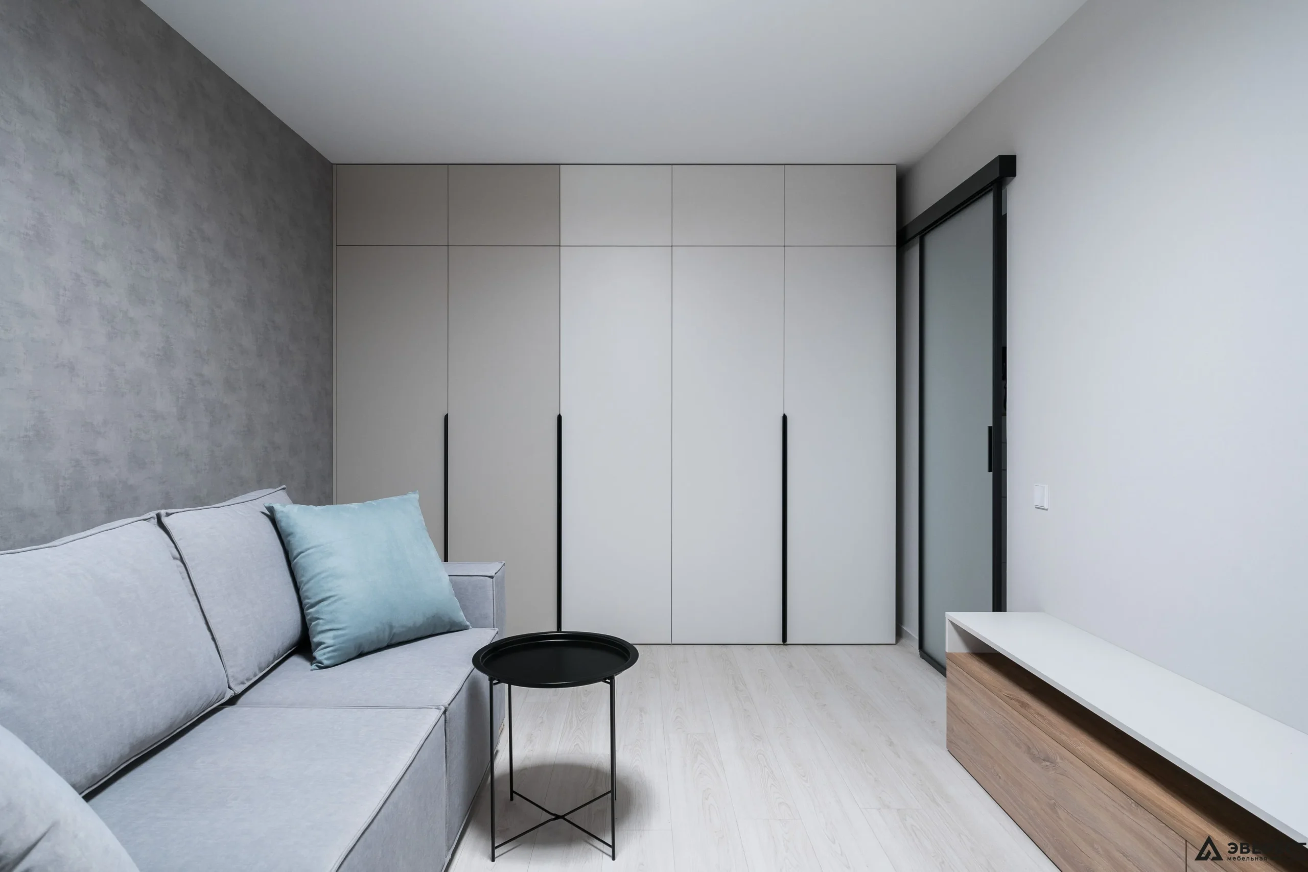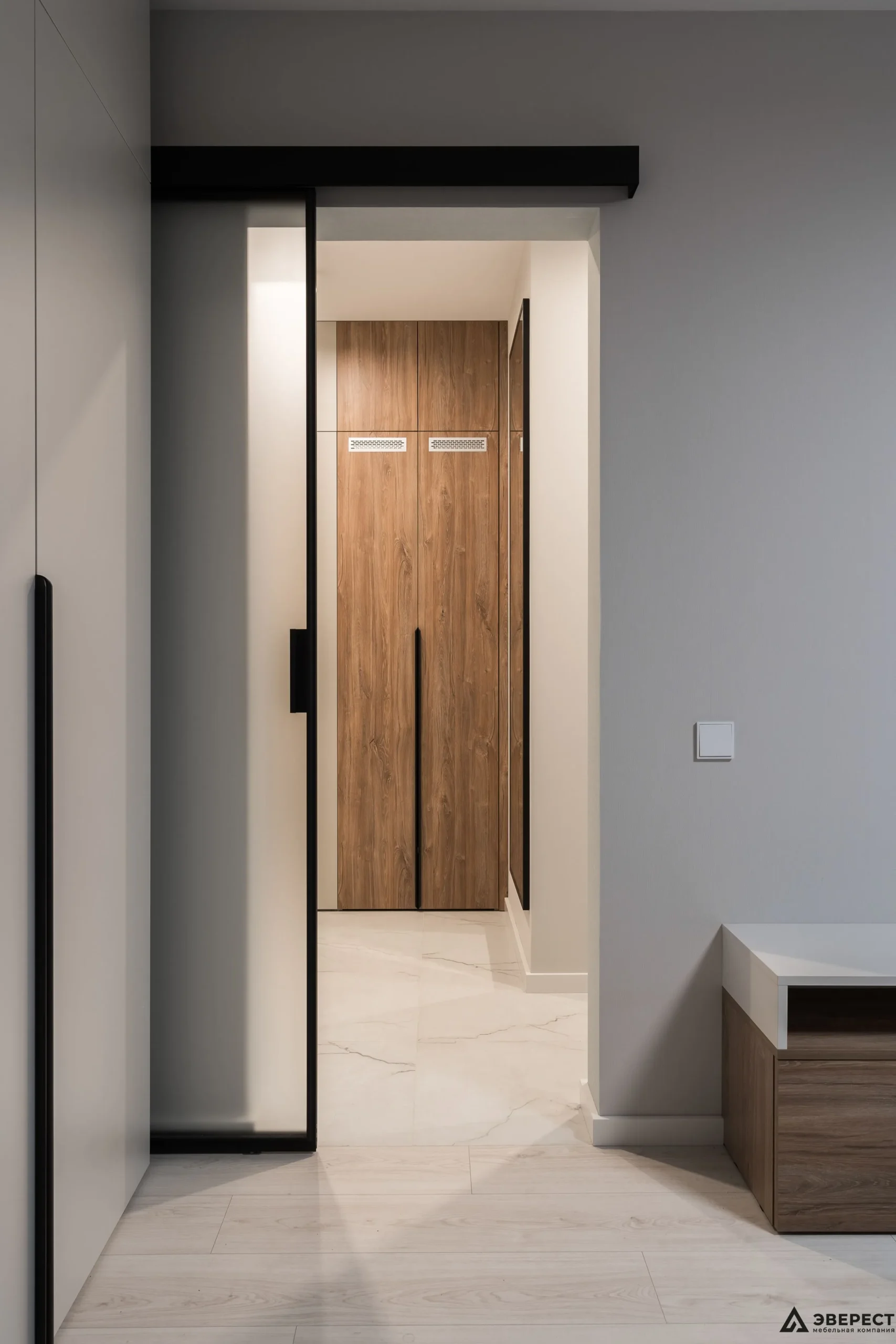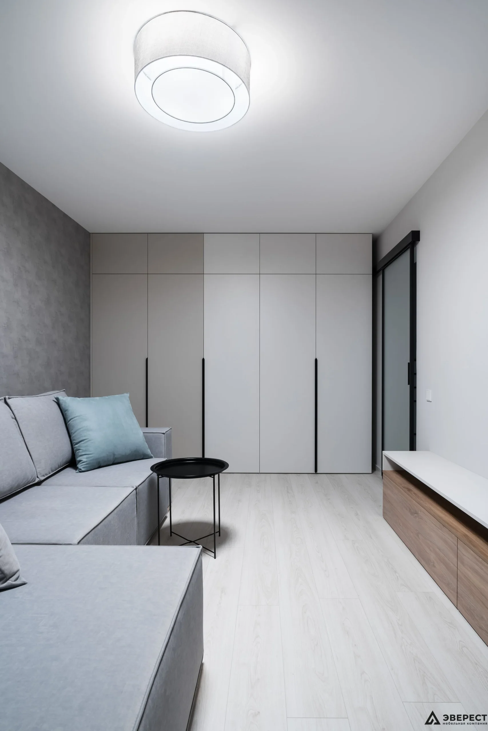 Вместительный шкаф для одежды занял противоположную стену и стал примером гармонии в деталях. Он визуально делится на две части благодаря оттенкам фасадов, которые перекликаются с цветами стен: светло-серый с одной стороны и белый с другой. Завершают композицию длинные чёрные матовые ручки, которые подчёркивают современный характер интерьера.