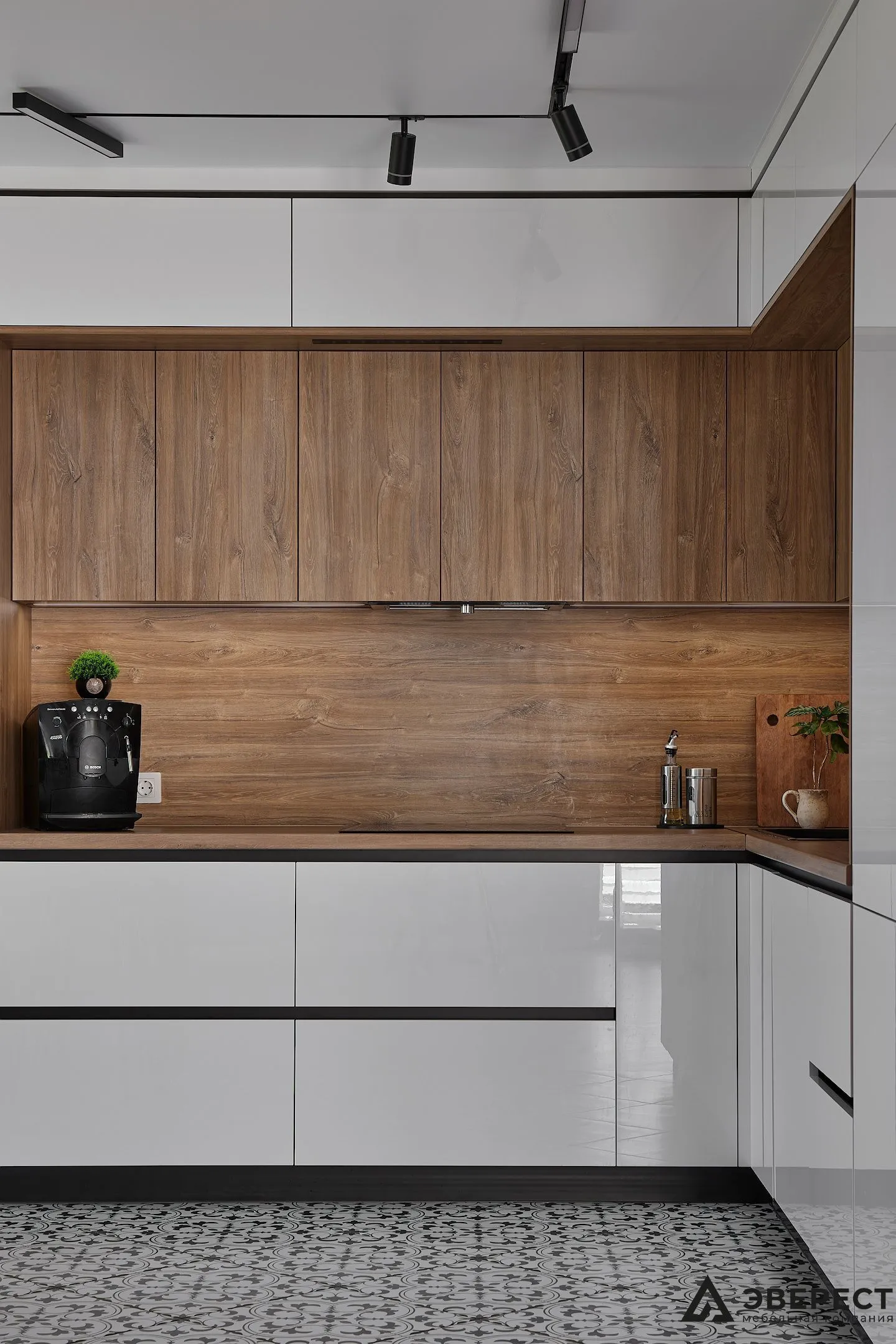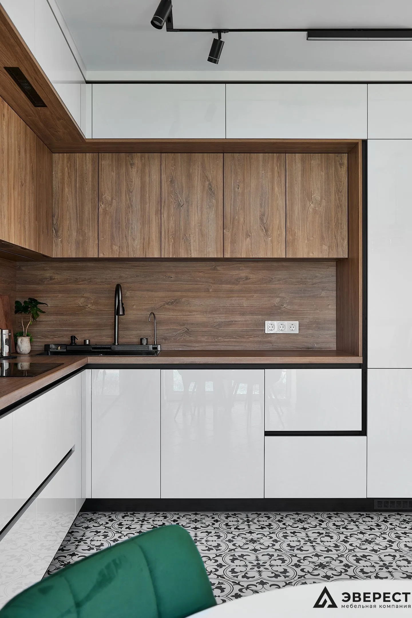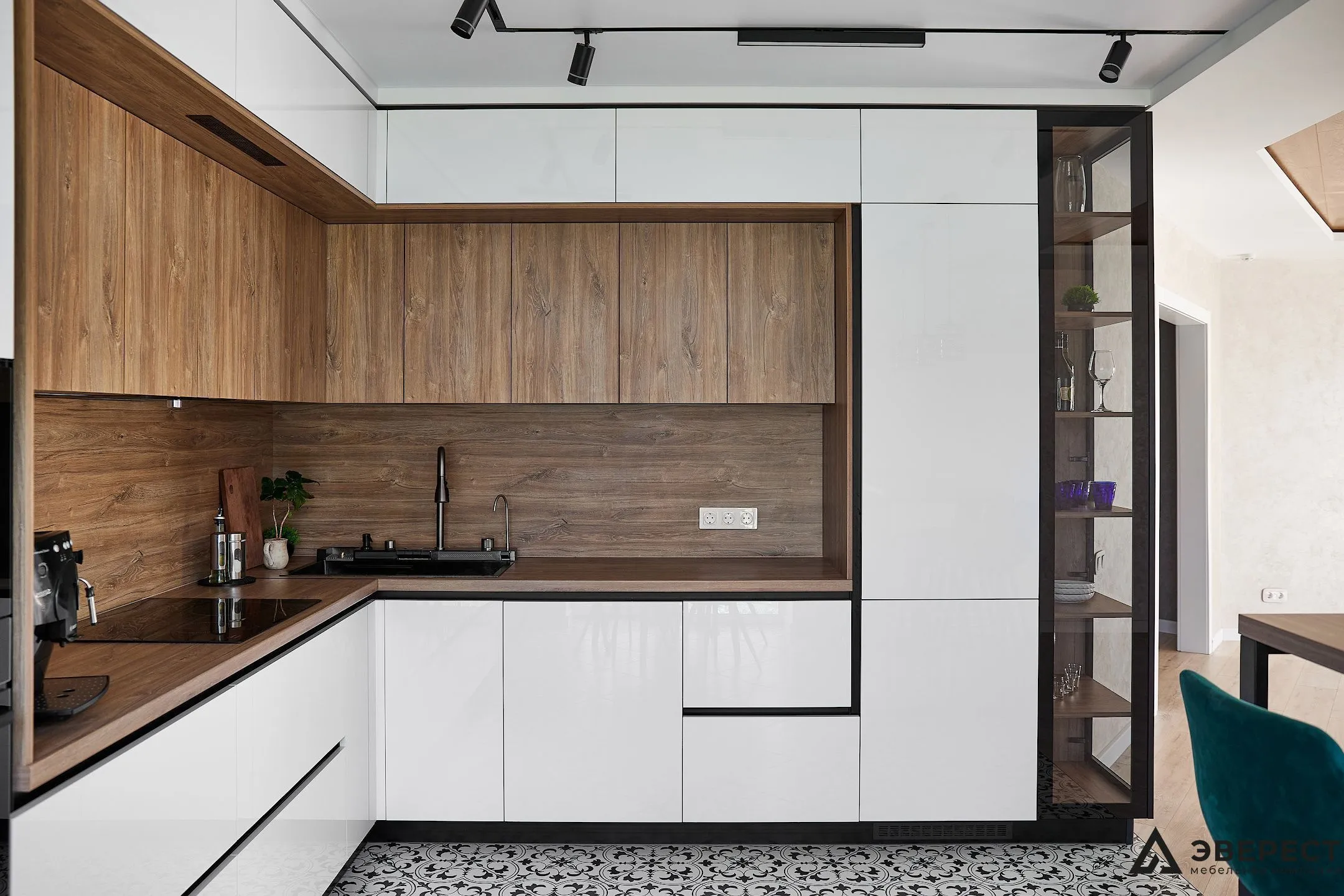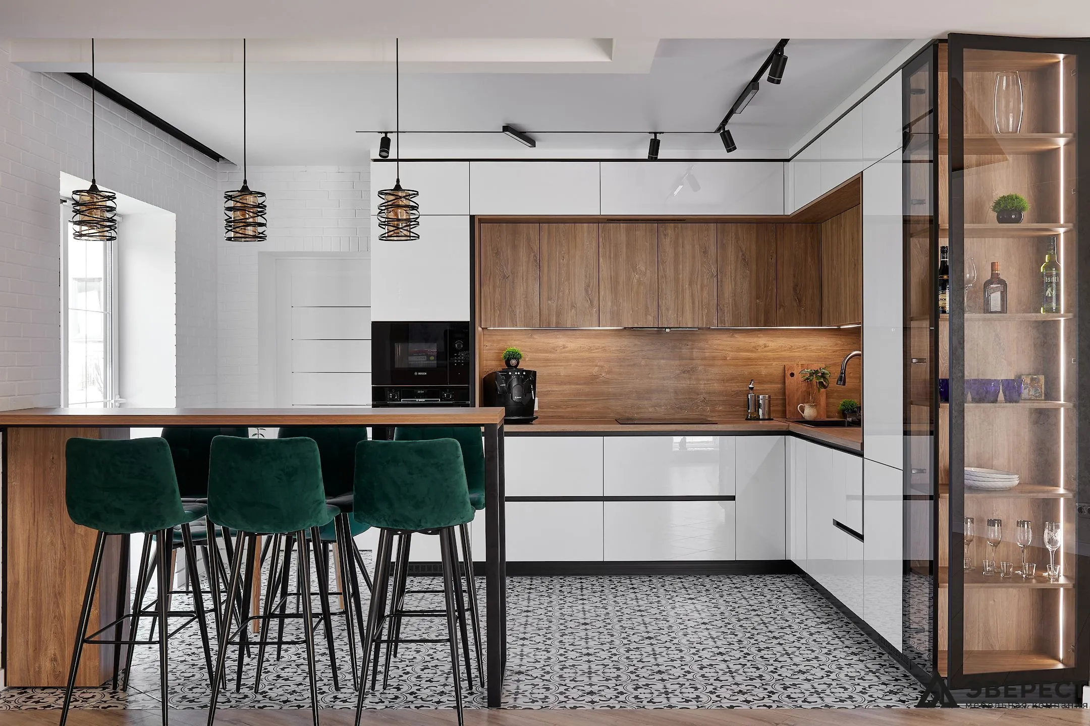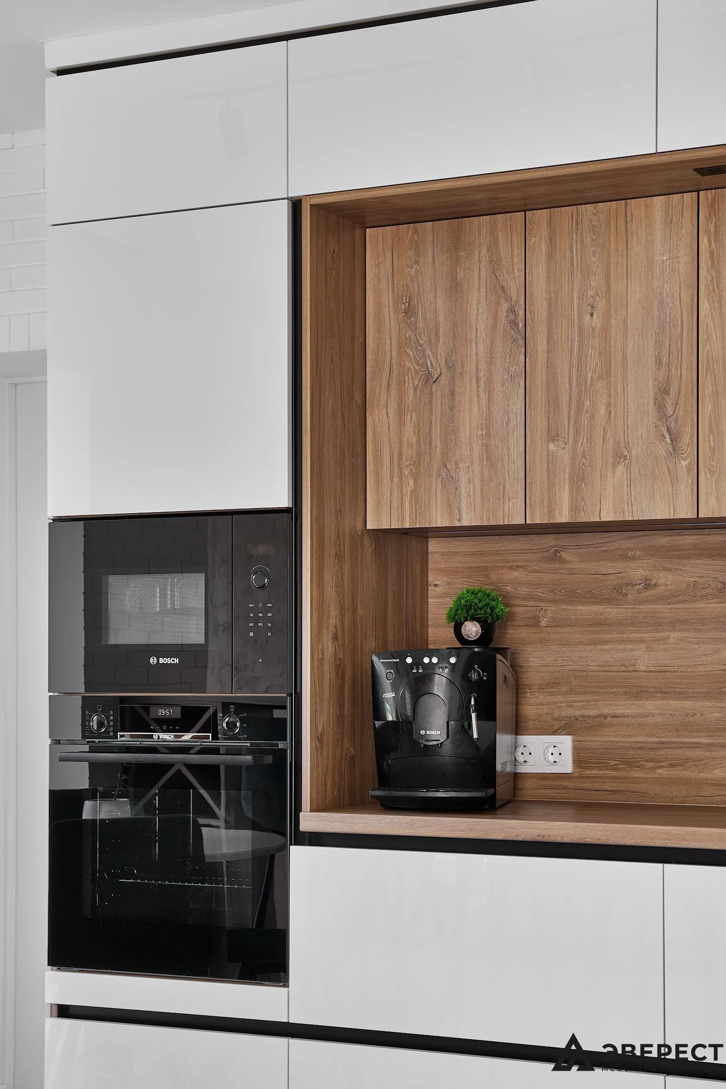 Встроенные современные приборы гармонично вписываются в общий дизайн, а продуманные решения для хранения помогают поддерживать порядок.
