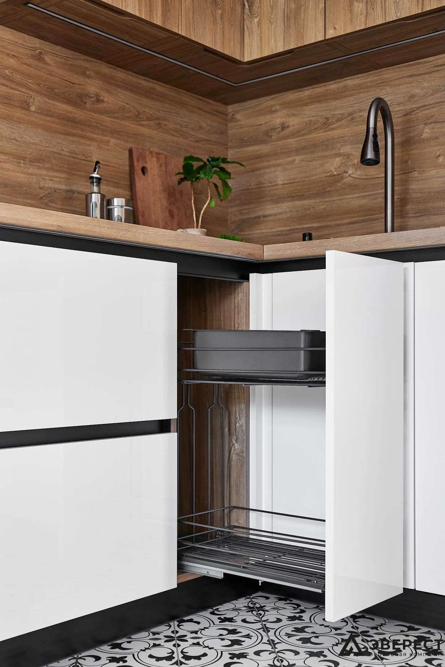 Угловая компоновка позволяет максимально эффективно использовать пространство, обеспечивая удобный доступ ко всем элементам кухни.