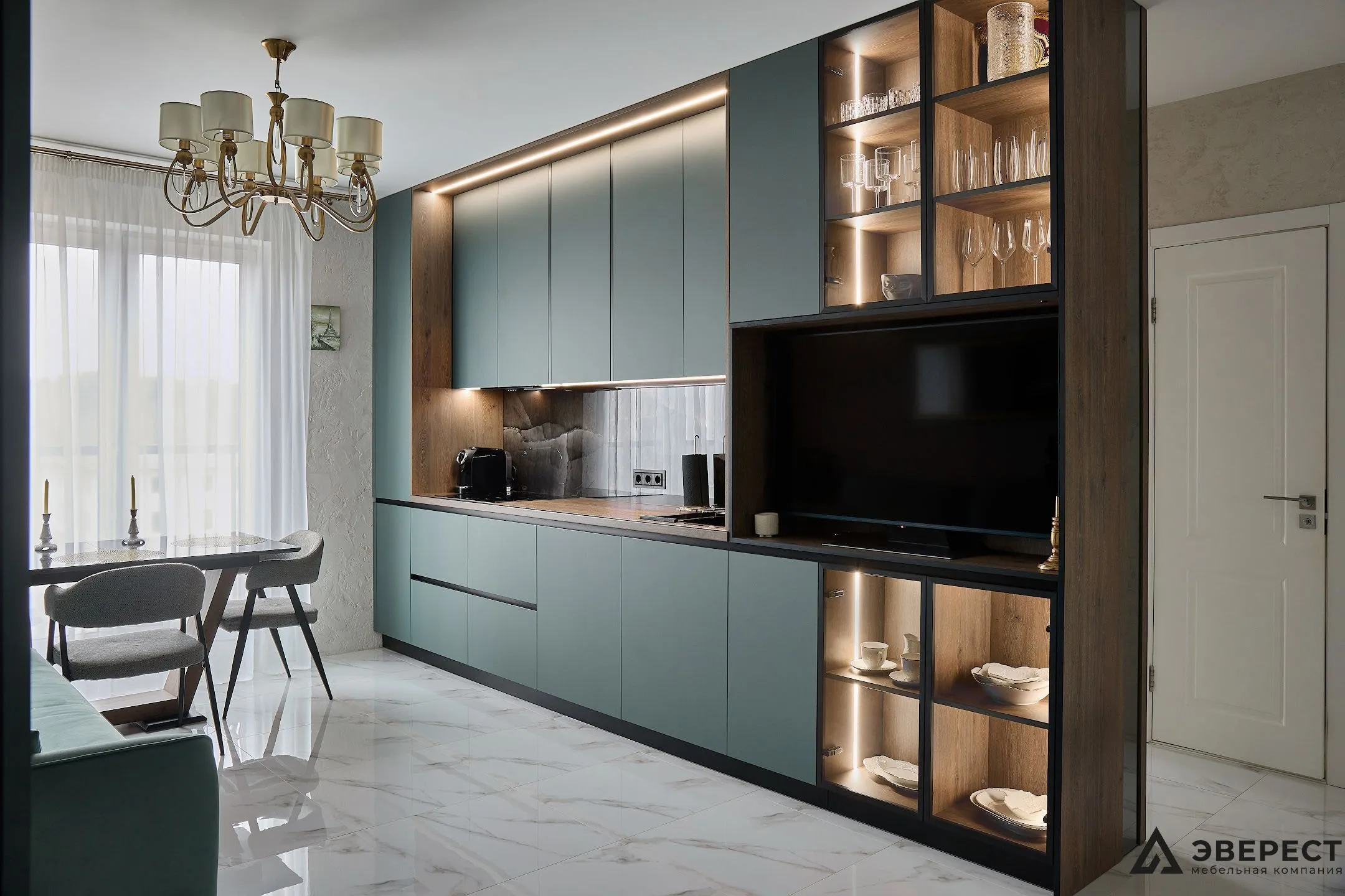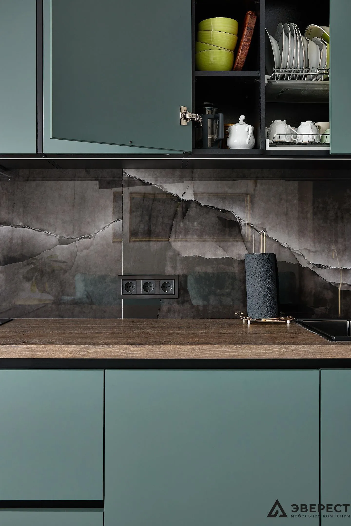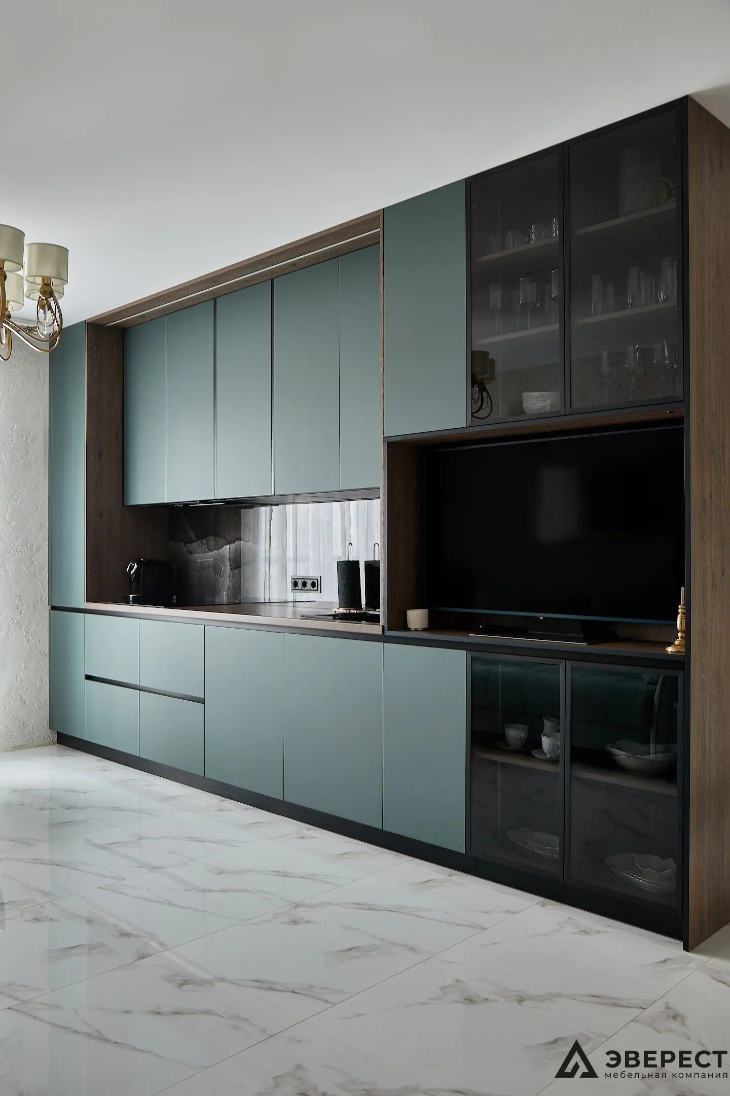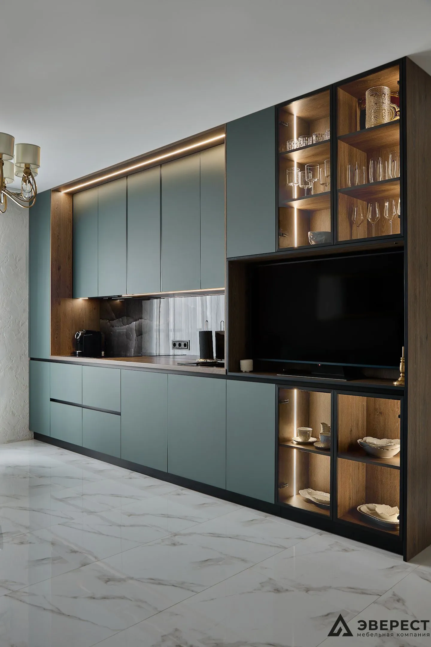 Фасады выполнены из AGT Супрамат в матовом цвете Форест, который привносит природную теплоту и спокойствие. Витрины с черным профилем и стеклом графит добавляют глубины и контраста, подчеркивая современный стиль кухни. Подсветка внутри витрин акцентирует внимание на красоте посуды и аксессуаров, превращая их в элемент декора.