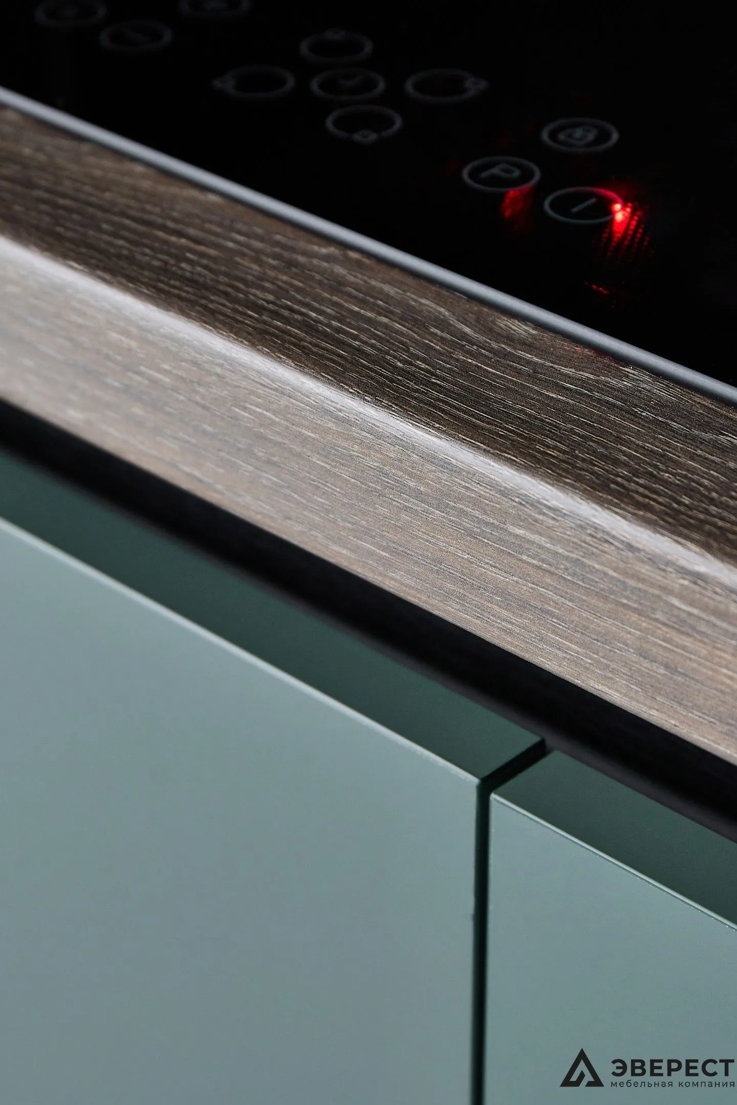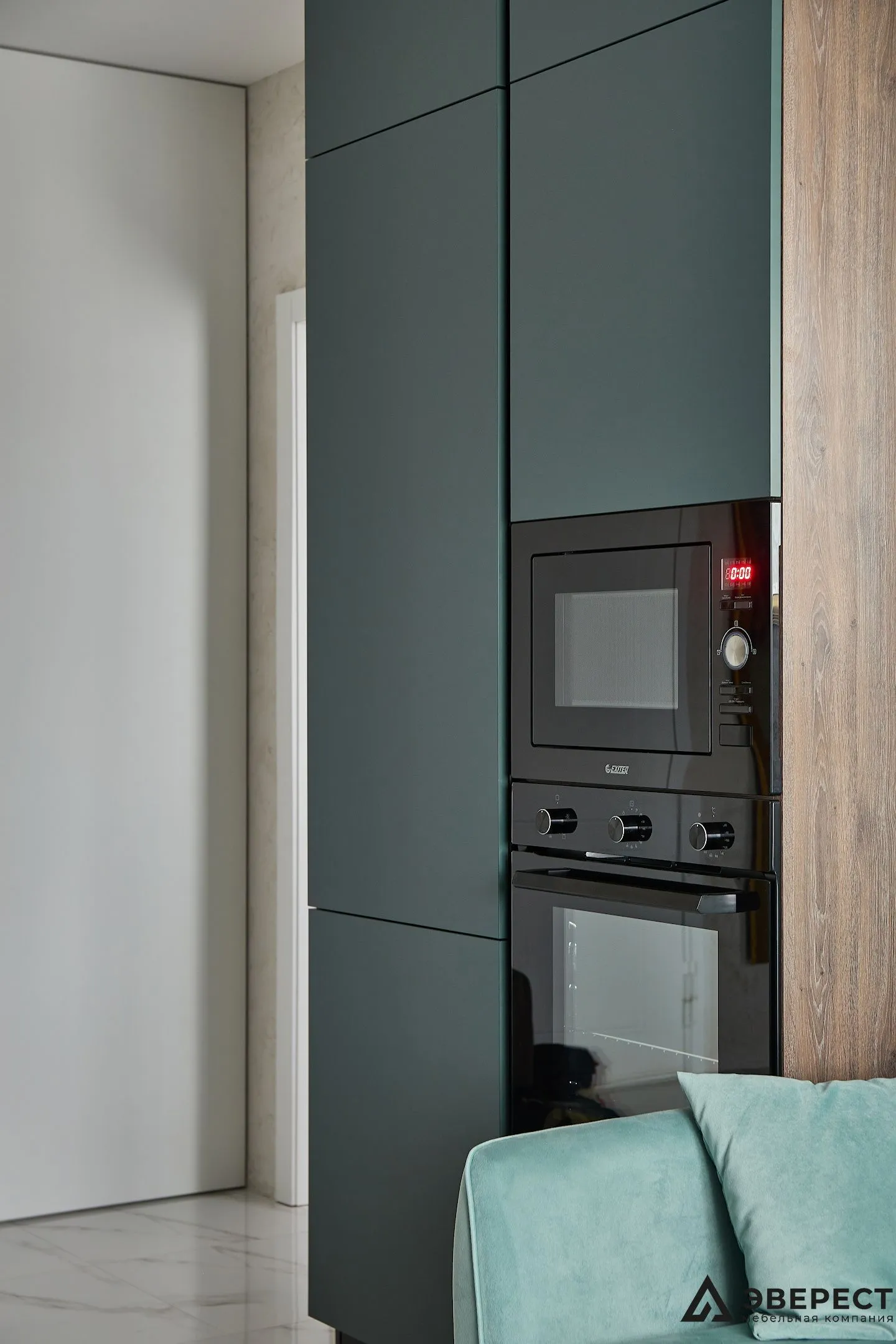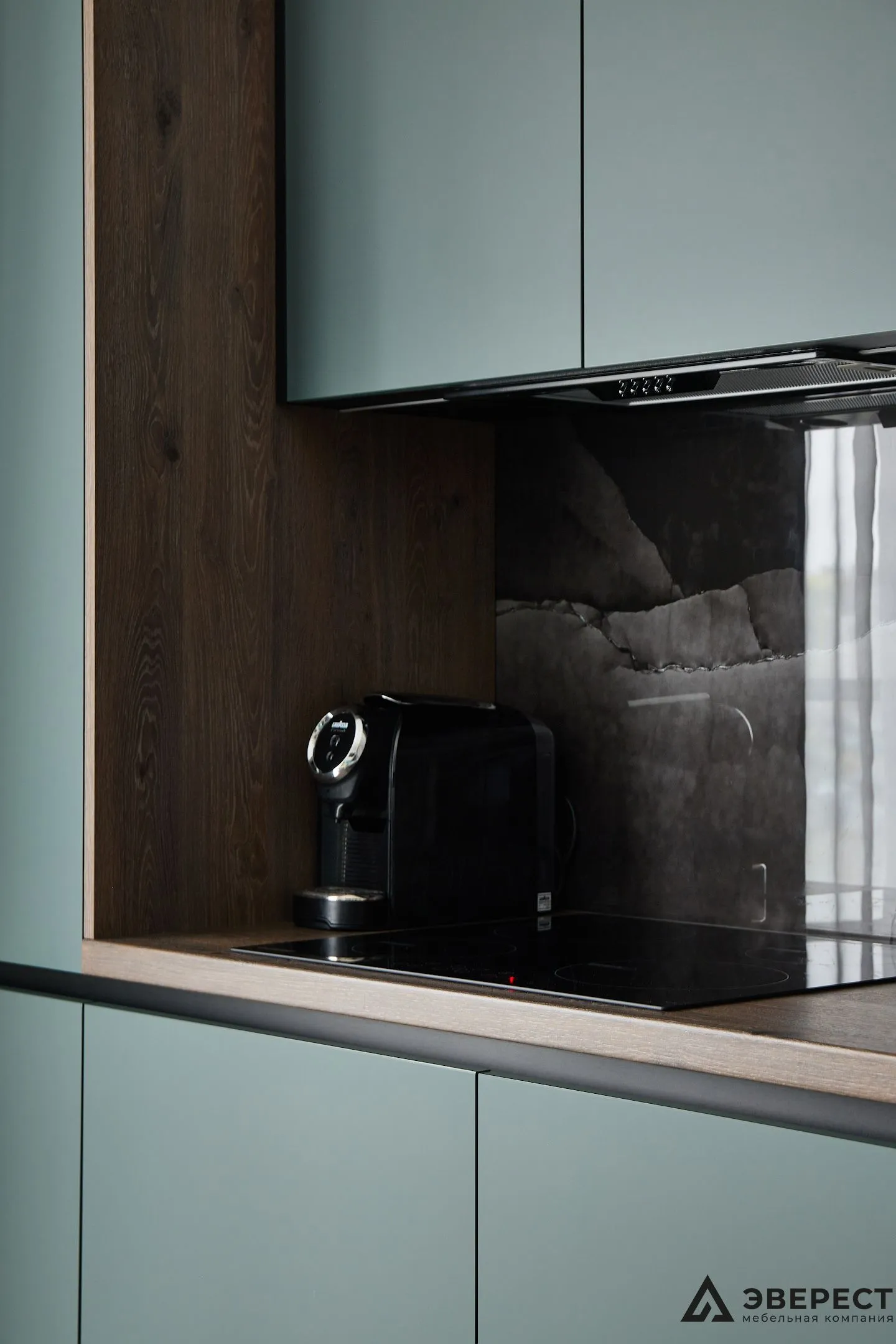 Фасады выполнены из AGT Супрамат в матовом цвете Форест, который привносит природную теплоту и спокойствие. Витрины с черным профилем и стеклом графит добавляют глубины и контраста, подчеркивая современный стиль кухни. Подсветка внутри витрин акцентирует внимание на красоте посуды и аксессуаров, превращая их в элемент декора.