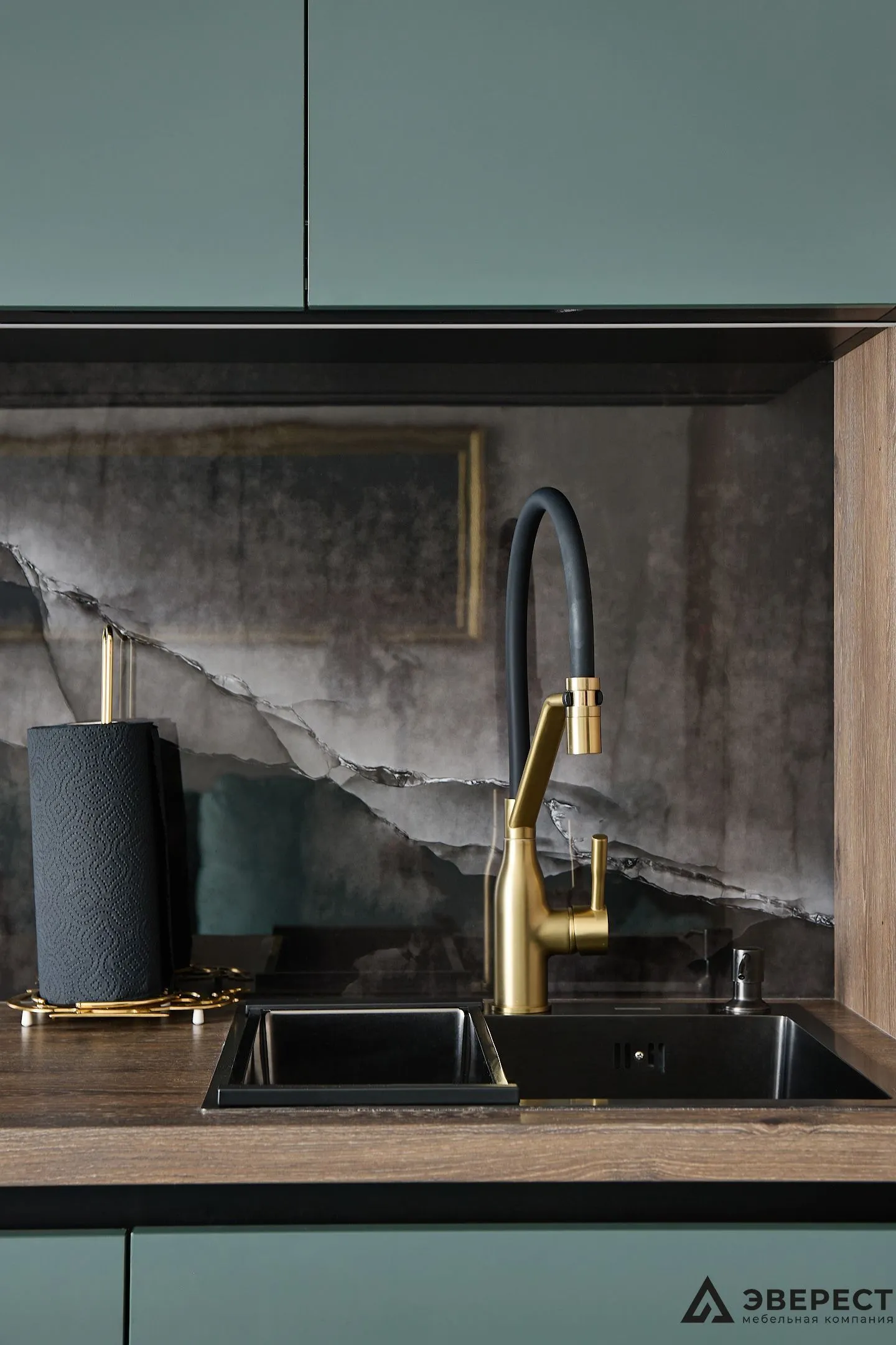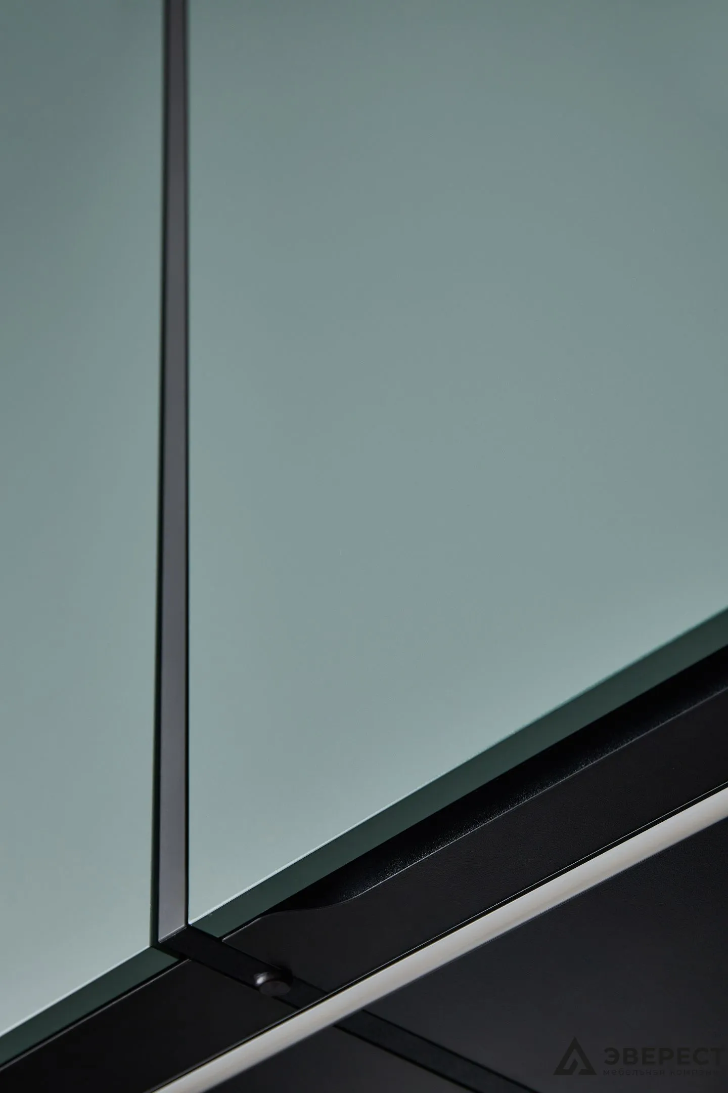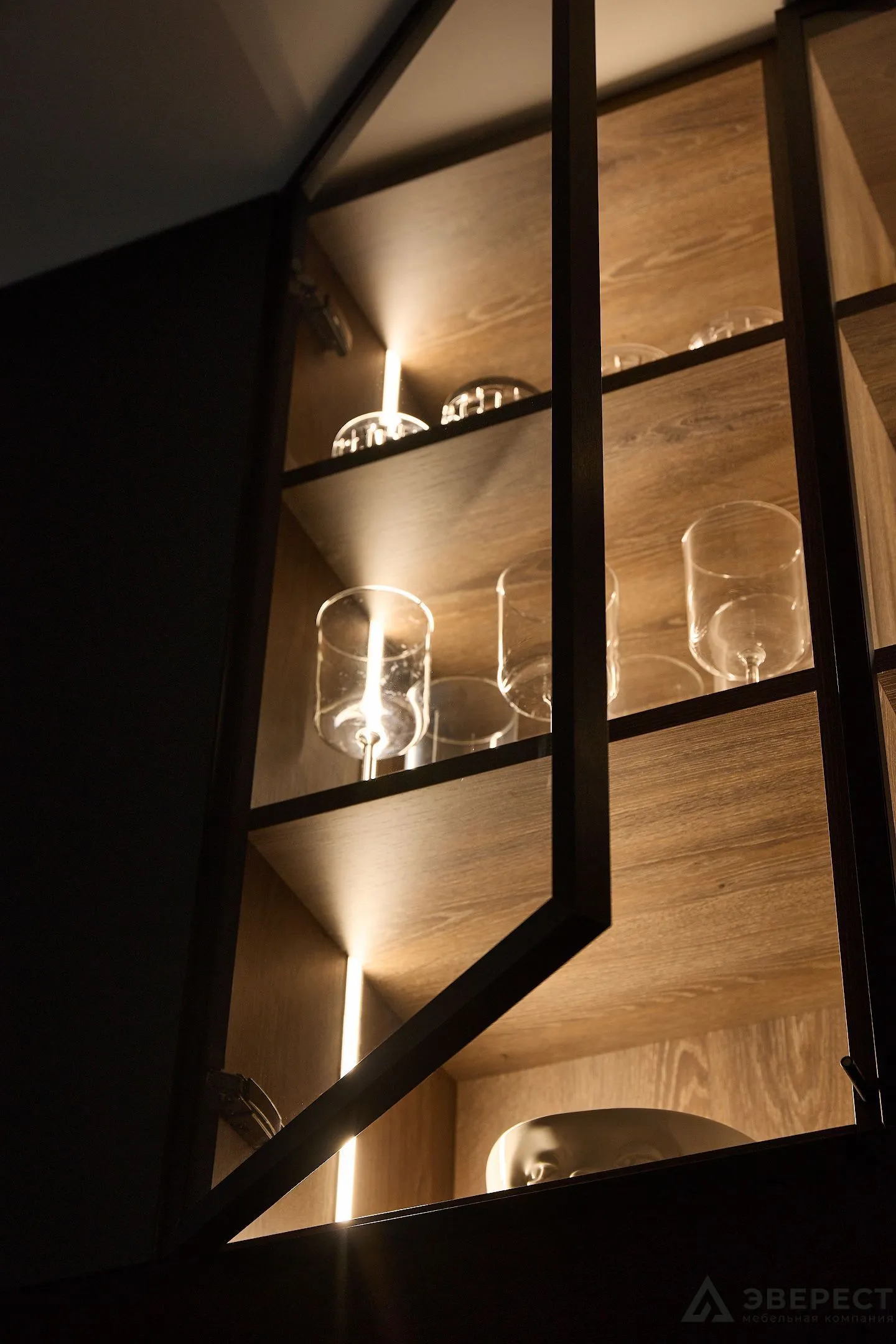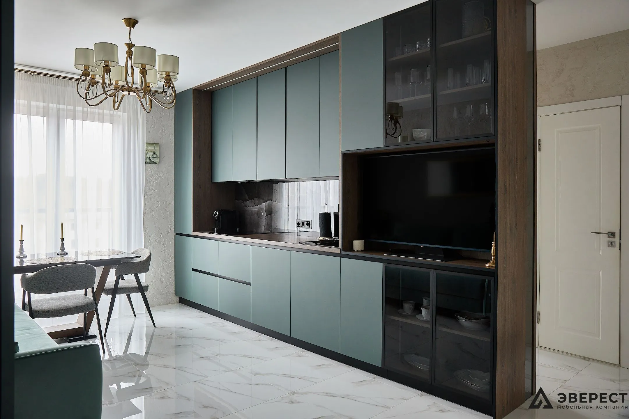Фасады выполнены из AGT Супрамат в матовом цвете Форест, который привносит природную теплоту и спокойствие. Витрины с черным профилем и стеклом графит добавляют глубины и контраста, подчеркивая современный стиль кухни. Подсветка внутри витрин акцентирует внимание на красоте посуды и аксессуаров, превращая их в элемент декора.