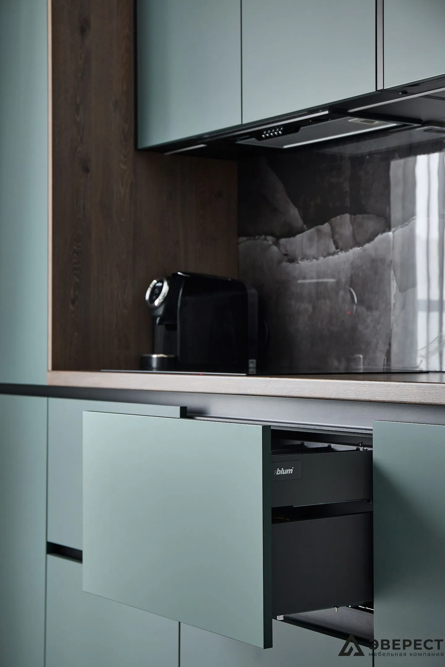 Особое внимание мы уделили удобству: петли и выдвижные ящики TANDEMBOX от Blum обеспечивают мягкость и бесшумность движения. Для верхних шкафчиков предусмотрен утопленный полик на 20 мм, что делает открытие максимально комфортным.