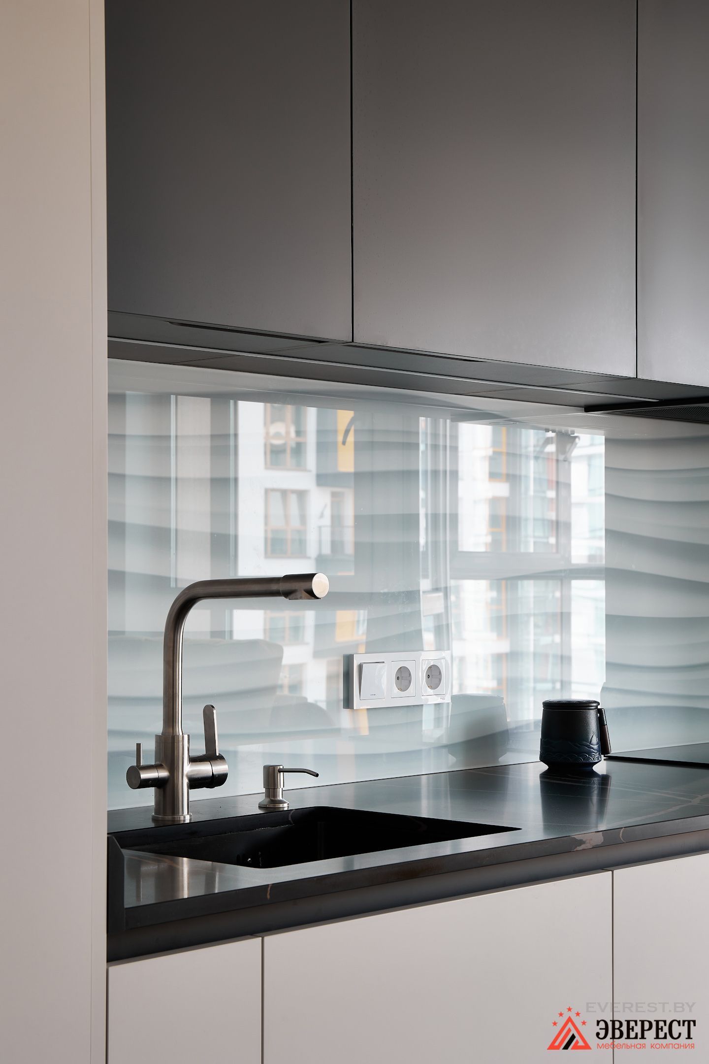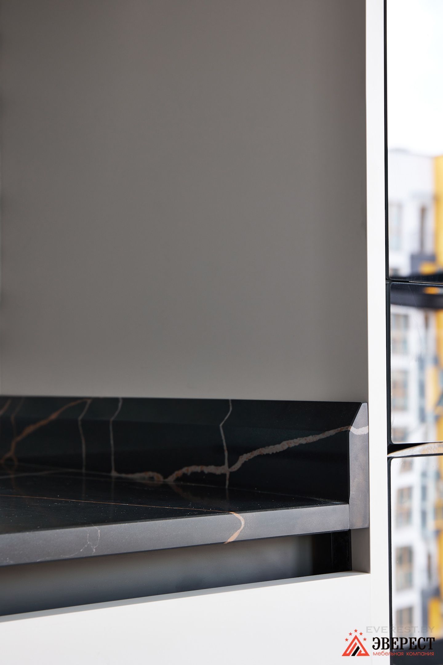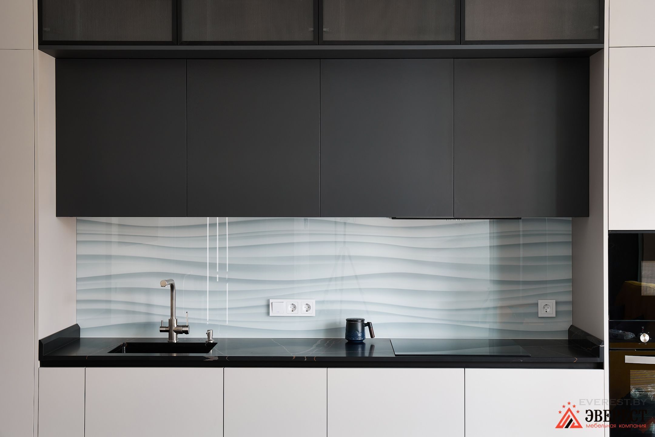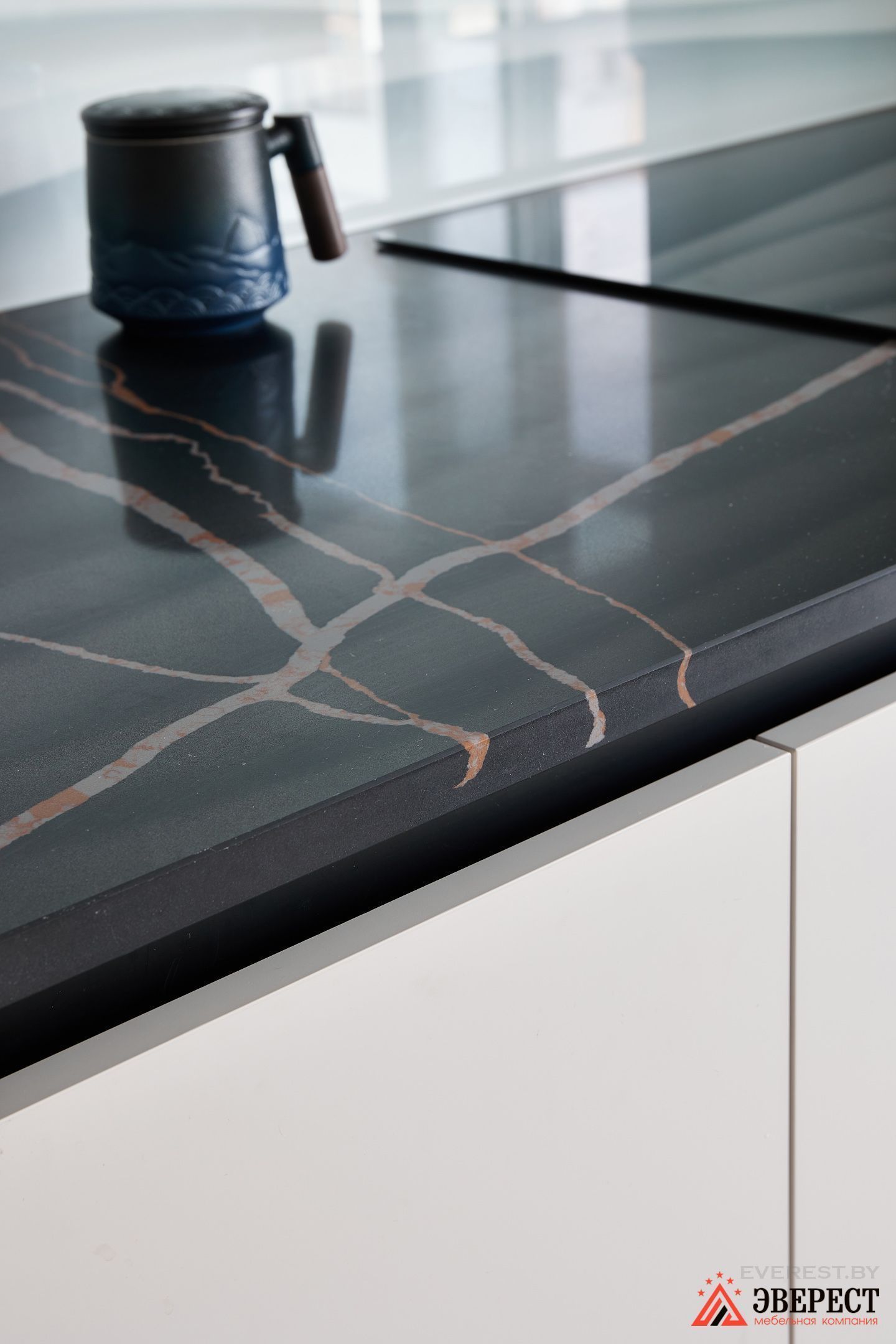Столешница выполнена из кварцевого камня, а фартук — скиналь стекло с фотопечатью.