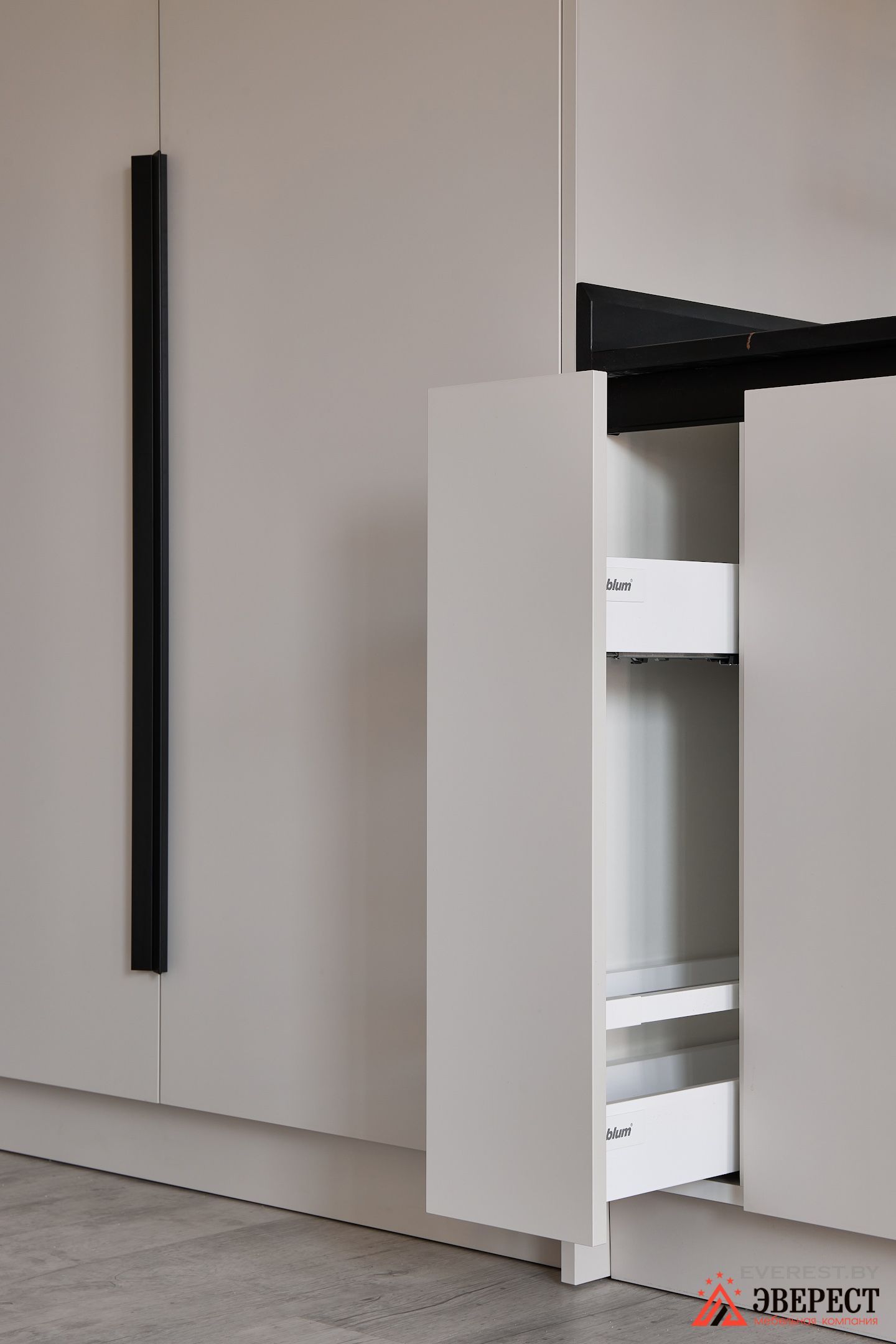 Преимущество светлого цвета Sahara cream и акцент на Dolphin grey в верхнем ряде шкафов подчеркивают роскошь минималистичного оформления.