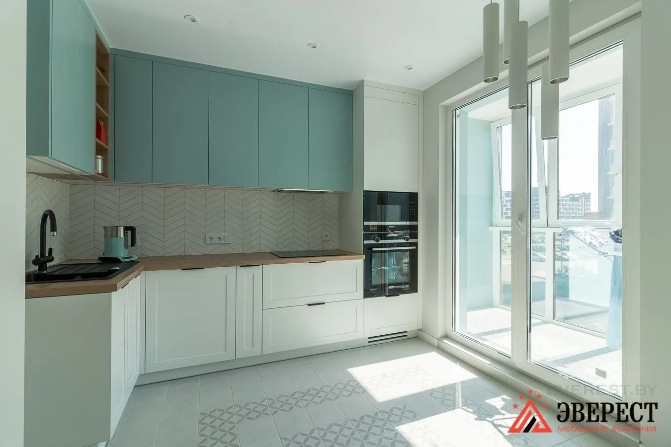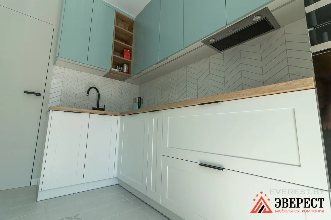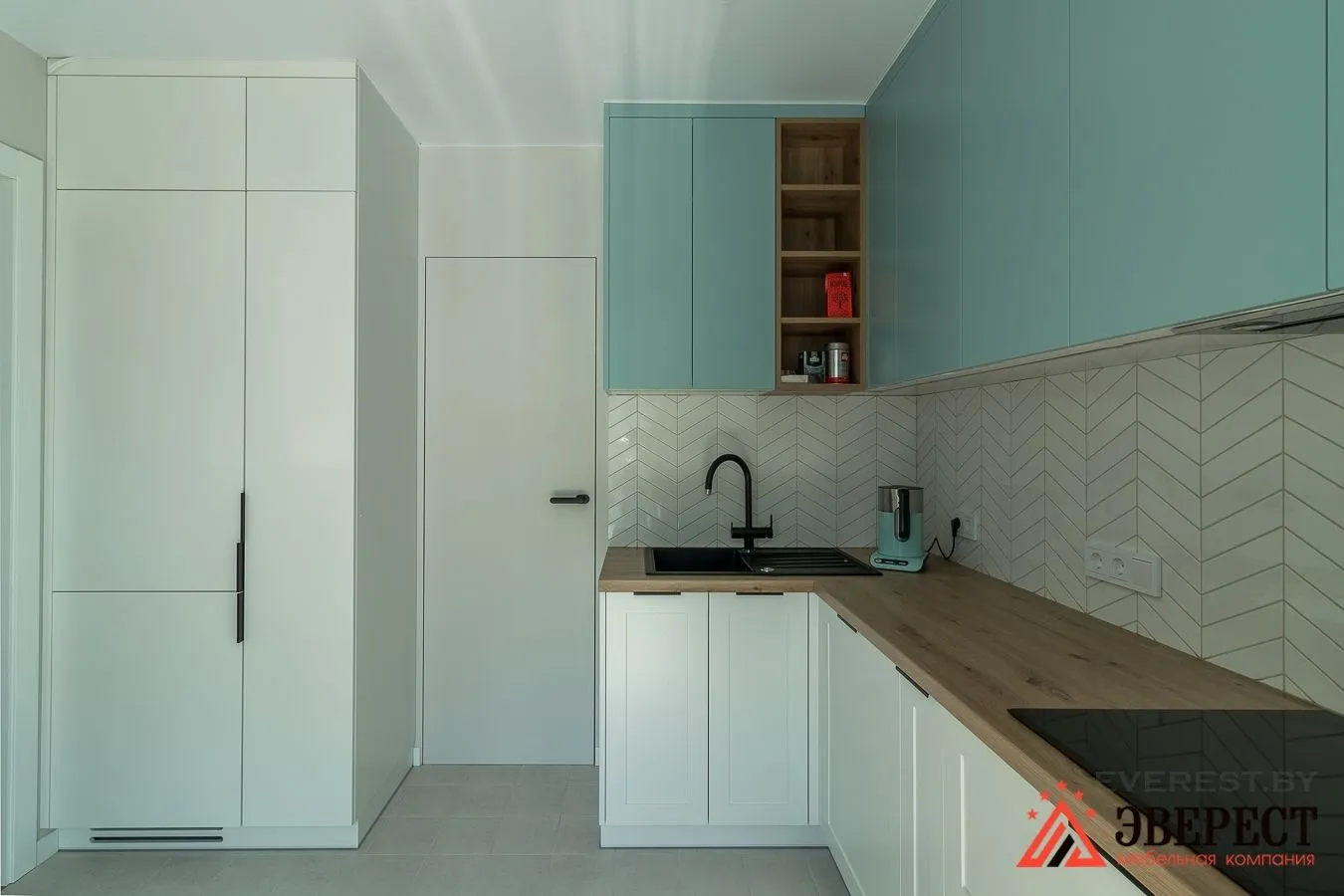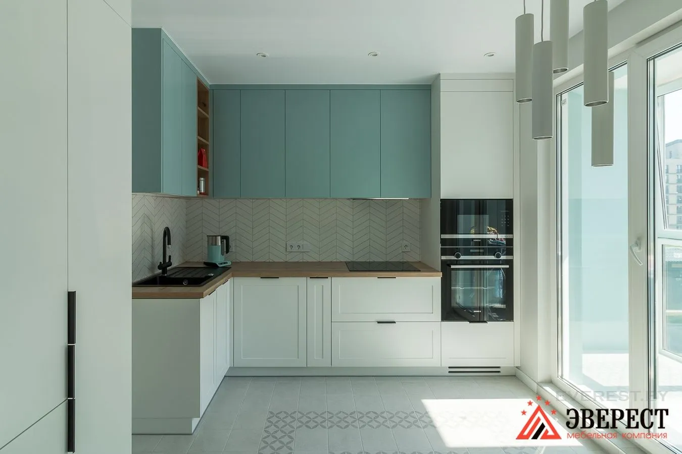 Верхние фасады, а также пеналы, выполнены из крашеного МДФ в гладком исполнении Цвет RAL 9003(Белый) и NCS S 2010-B30G(Бирюза).
