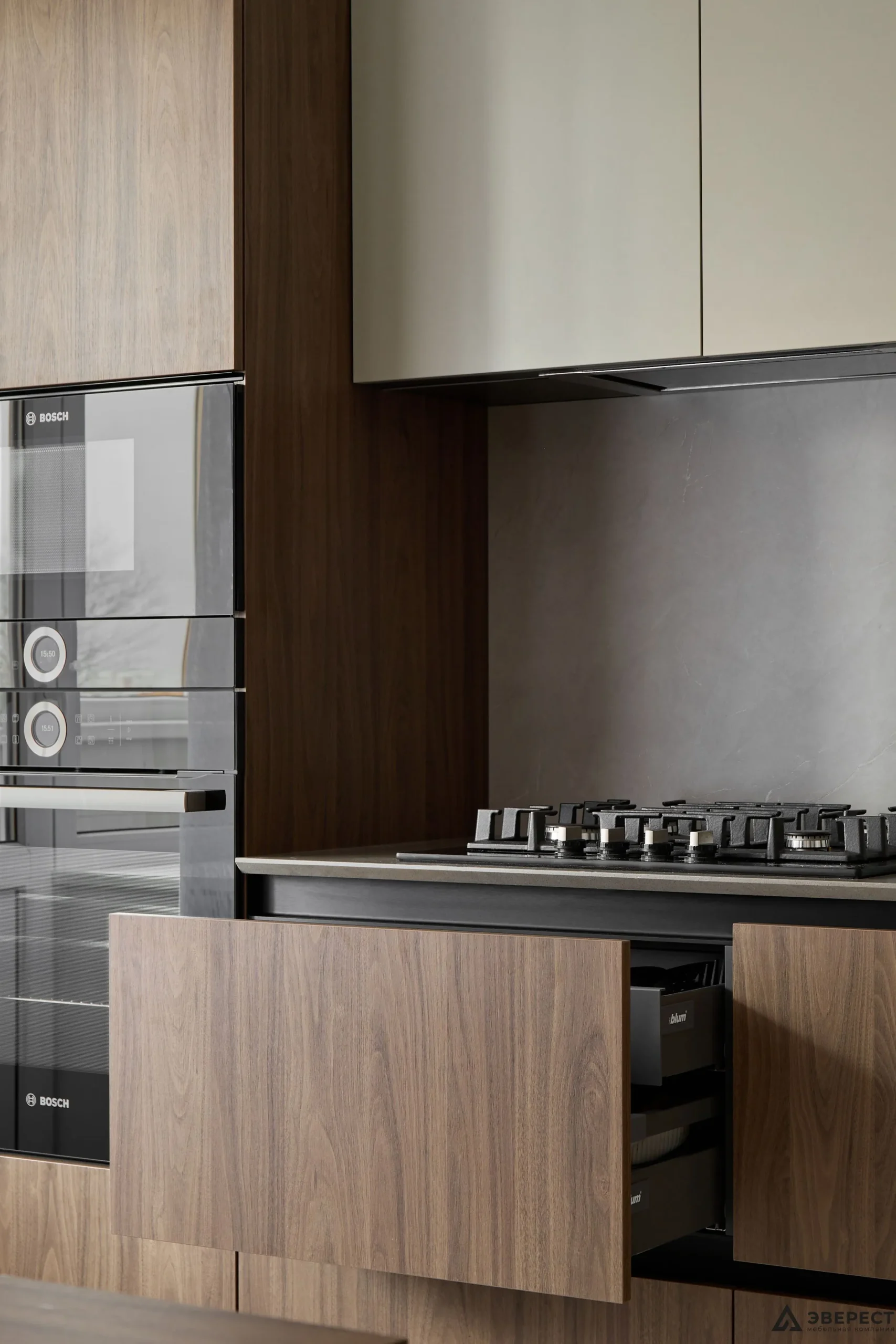 ▪️Элементы функциональности, такие как выдвижные ящики Blum Tandembox Antaro, делают использование кухни максимально удобным. Подъемные механизмы Blum HF и петли с доводчиками обеспечивают плавное закрытие дверей.