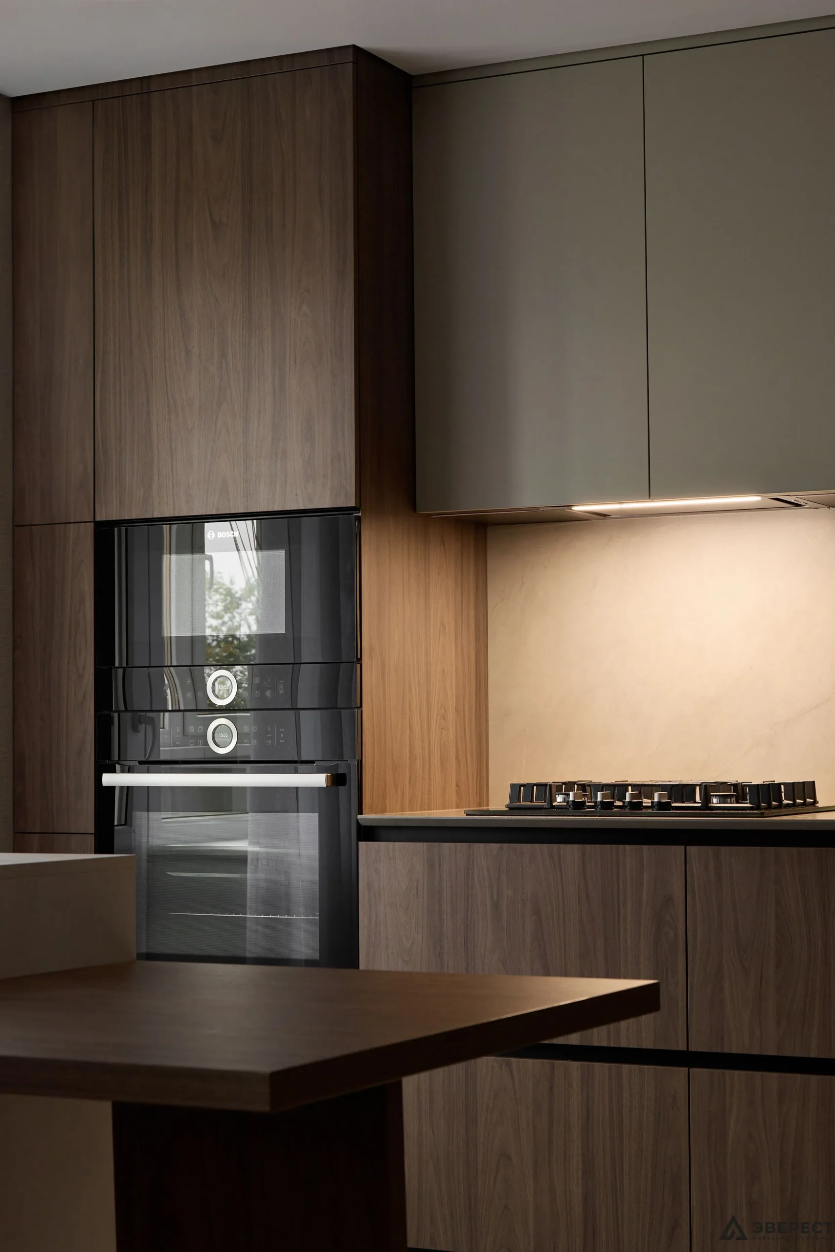 ▪️Верхние фасады выполнены из ЛДСП Egger в оттенке зелёного шалфея, что придаёт кухне свежесть и легкость. Этот мягкий, природный цвет прекрасно сочетается с нижними фасадами, выполненными в цвете орех Карини натуральный, который добавляет тепла и элегантности.