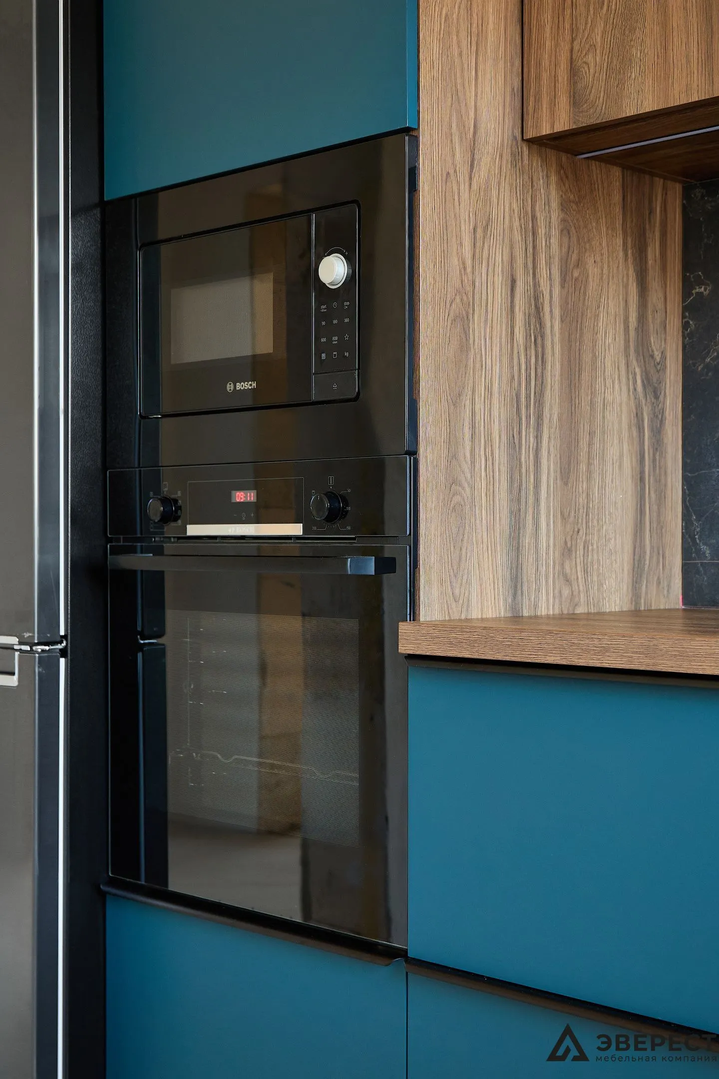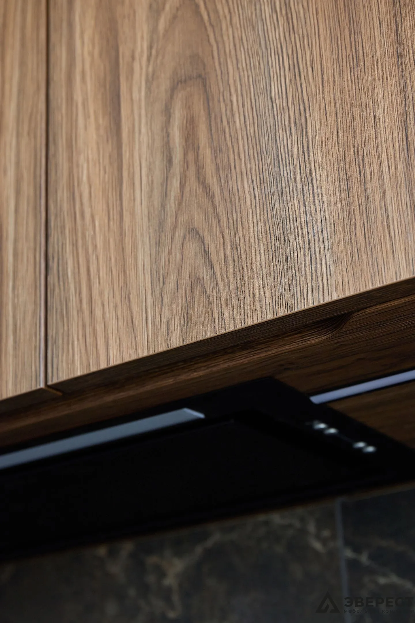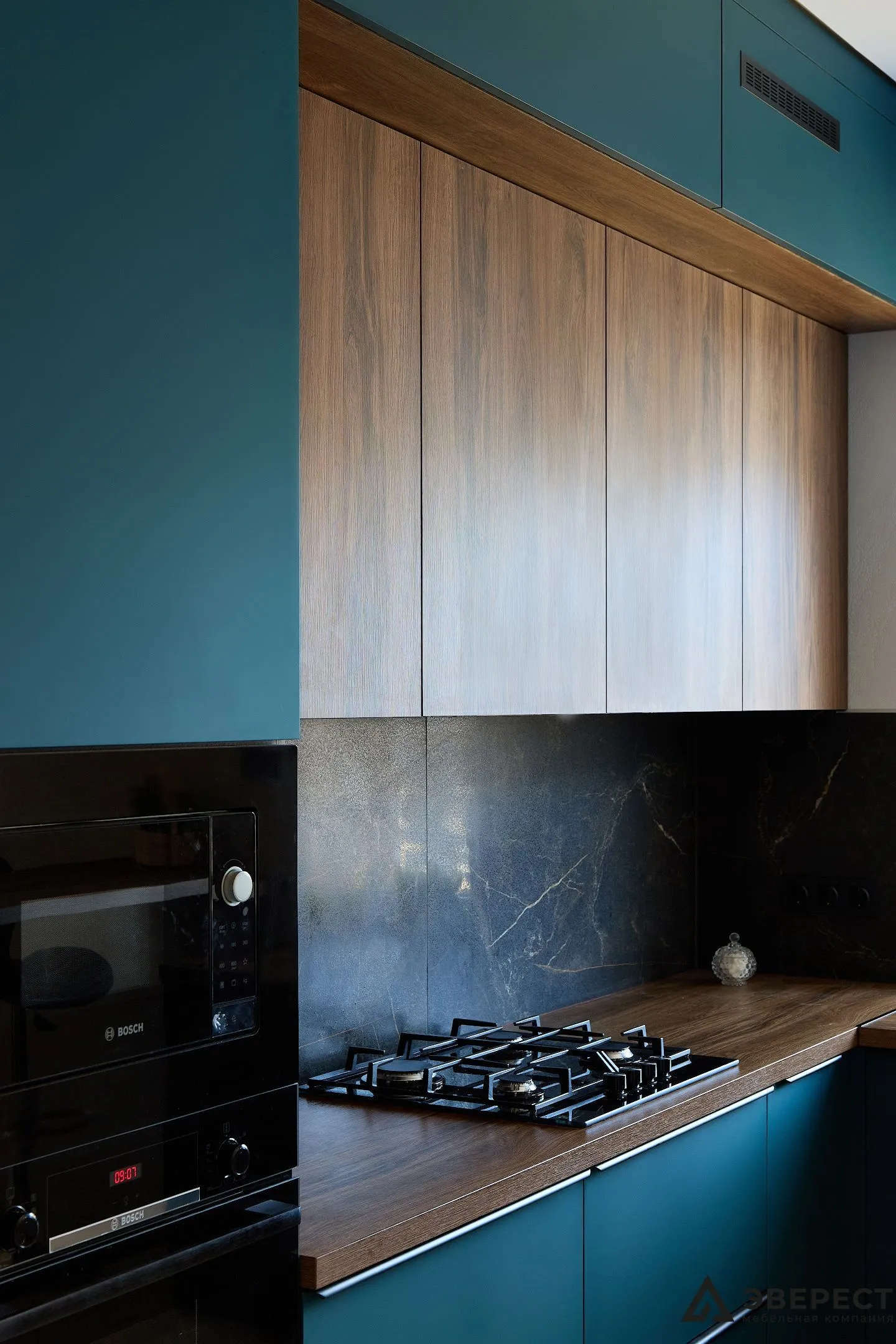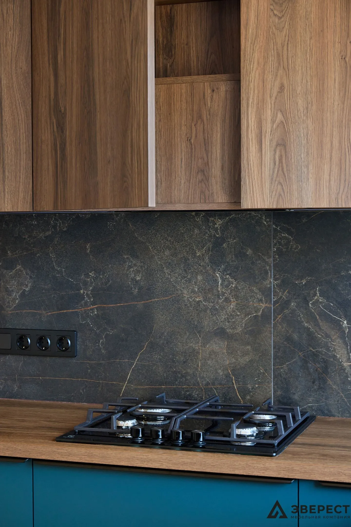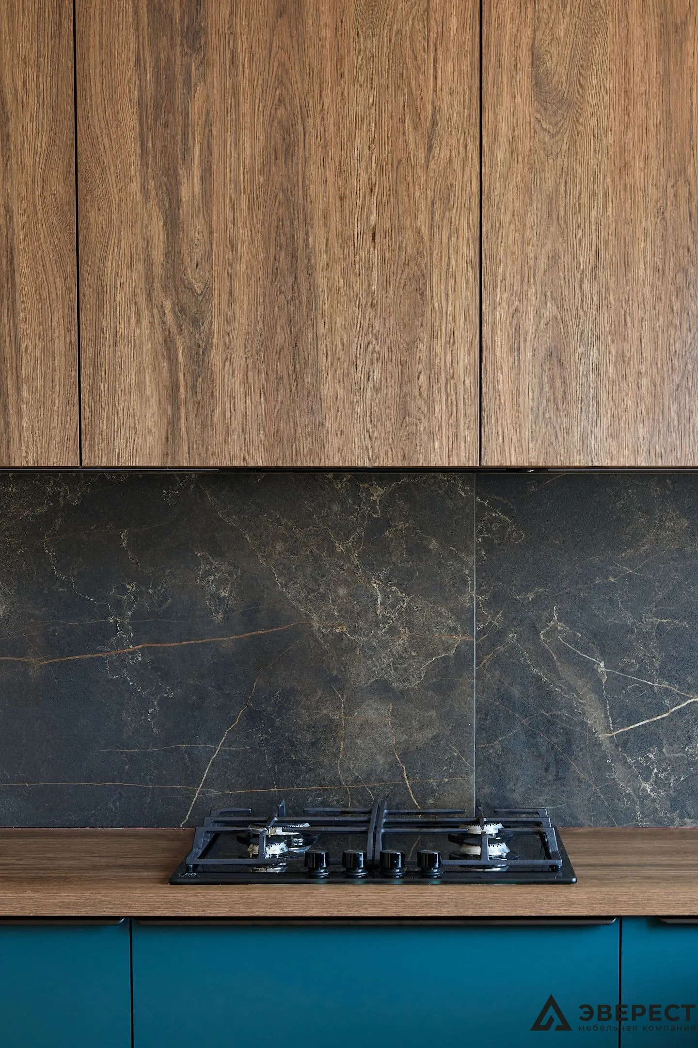 Столешница выполнена из постформинга — это один из самых популярных вариантов для кухонь благодаря их эстетике и функциональности.