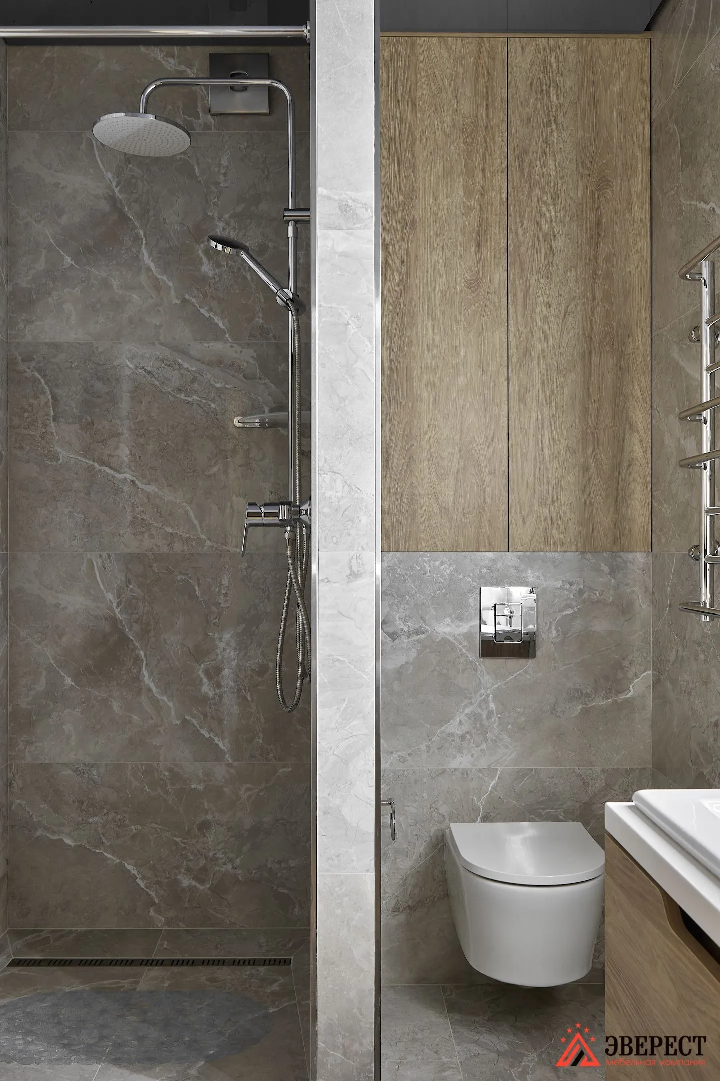 Стильная ванная в исполнении компании «Эверест». Здесь мы решали сразу несколько задач: