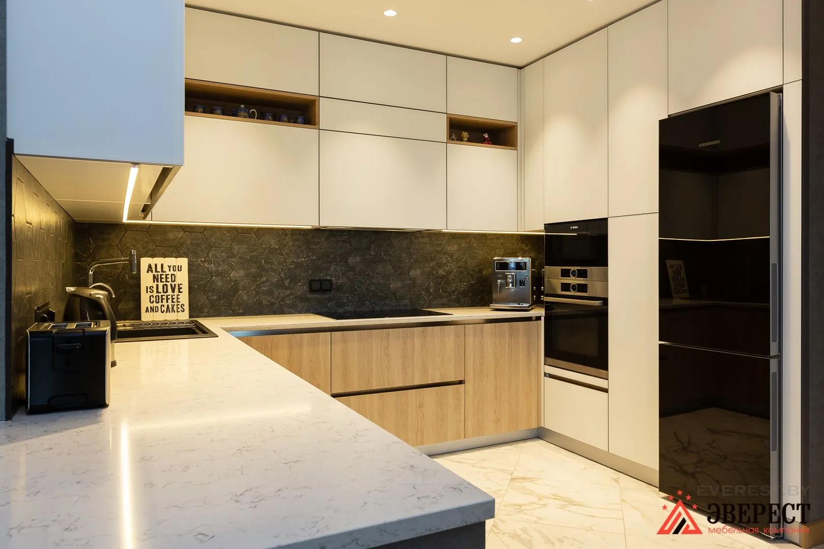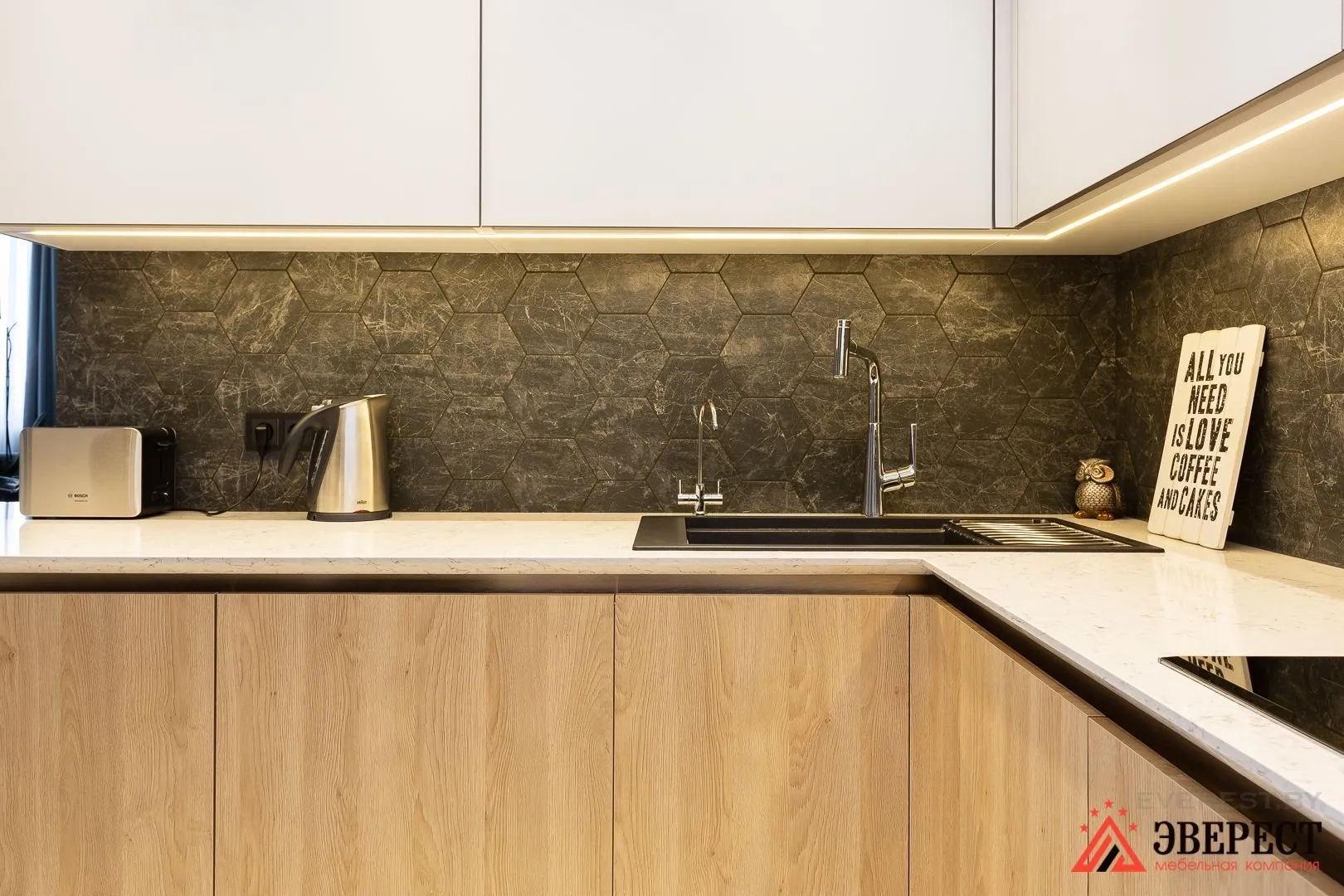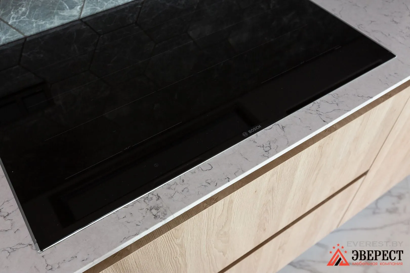 Столешница установлена из искусственного камня — кварцевый агломерат 30 mm, в стоимость кухни не входит и рассчитывается отдельно*