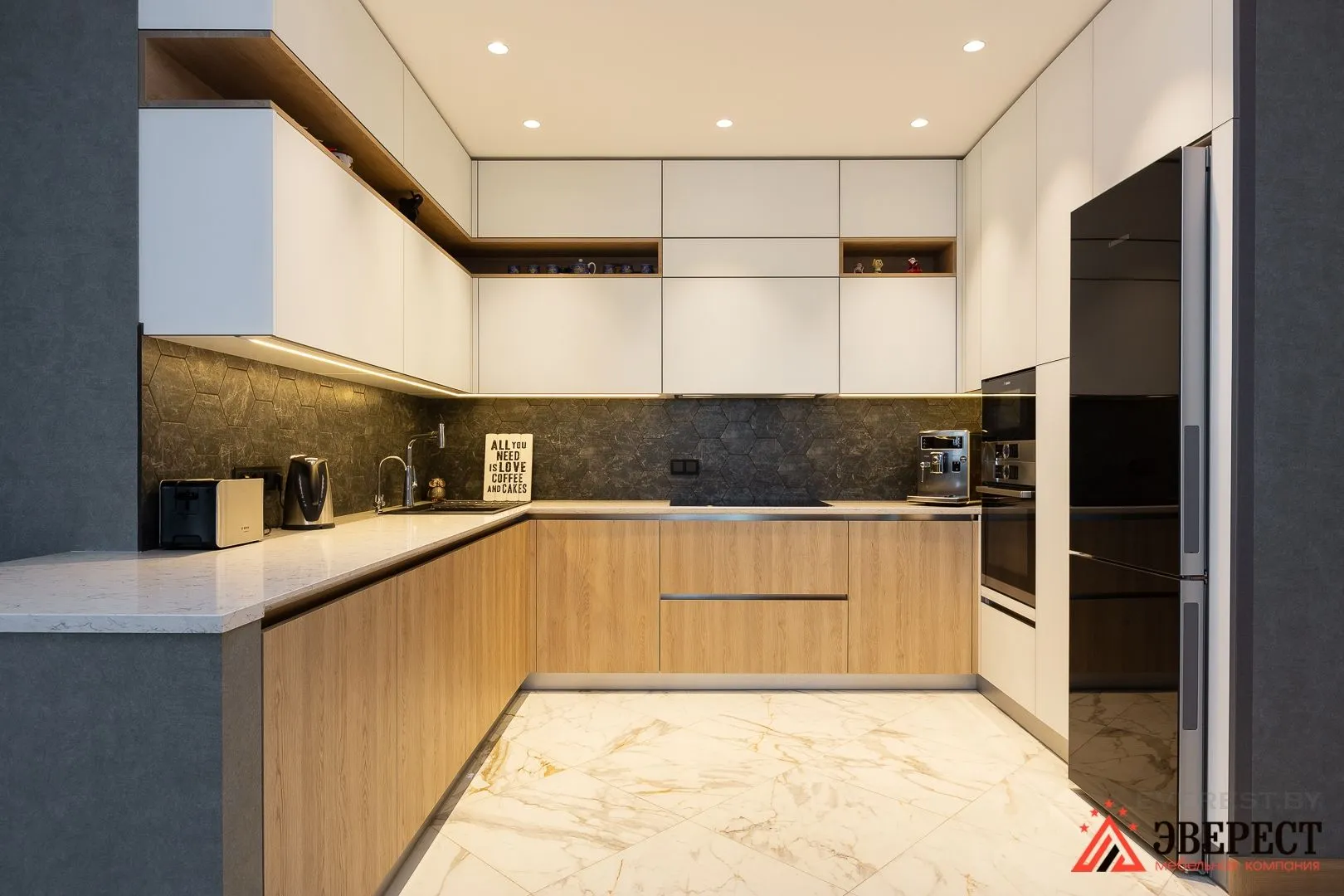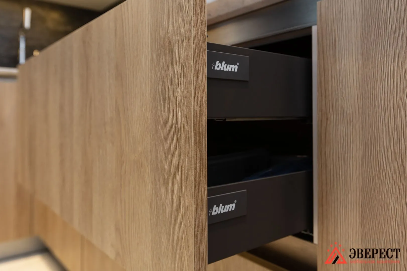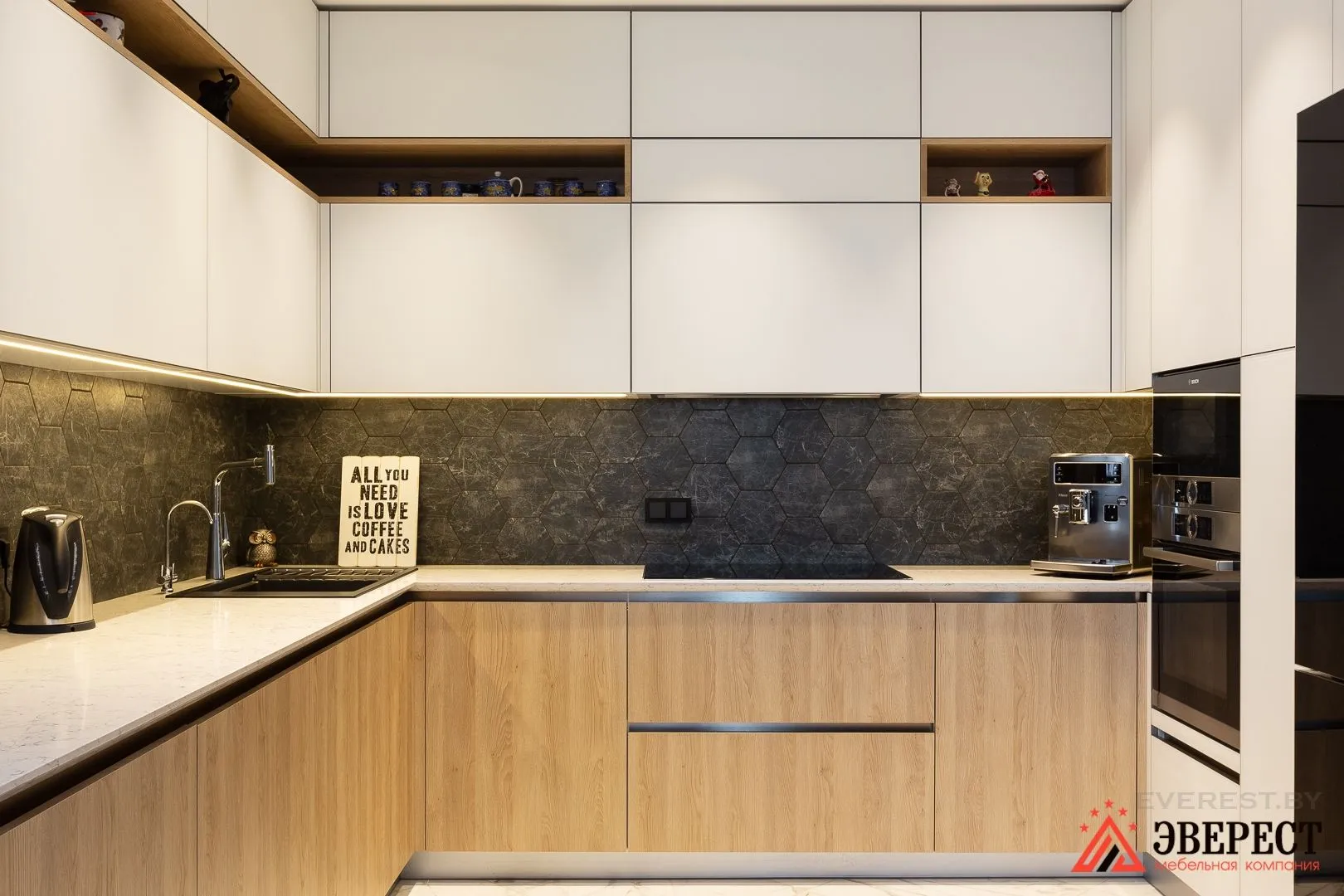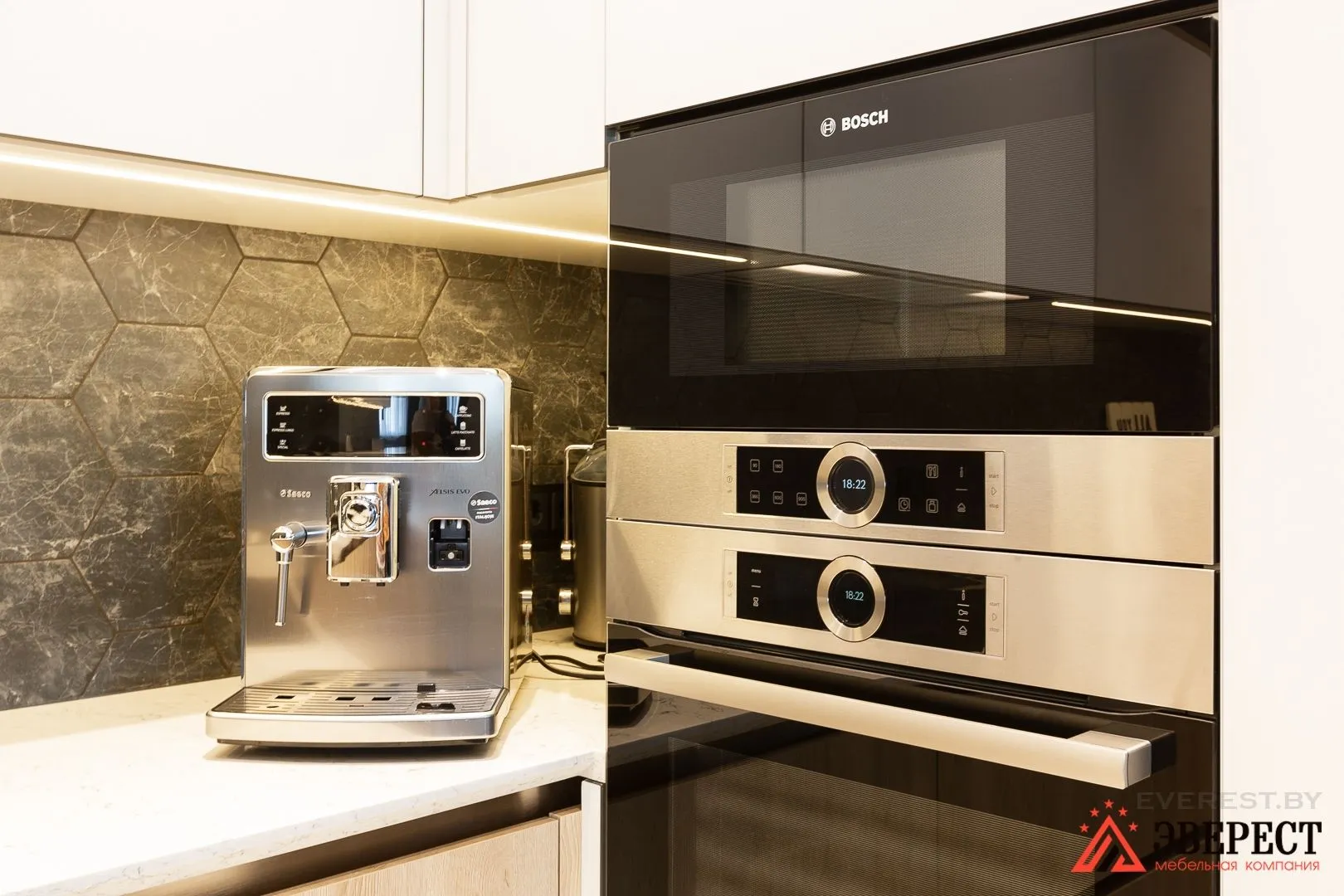 Столешница установлена из искусственного камня — кварцевый агломерат 30 mm, в стоимость кухни не входит и рассчитывается отдельно*