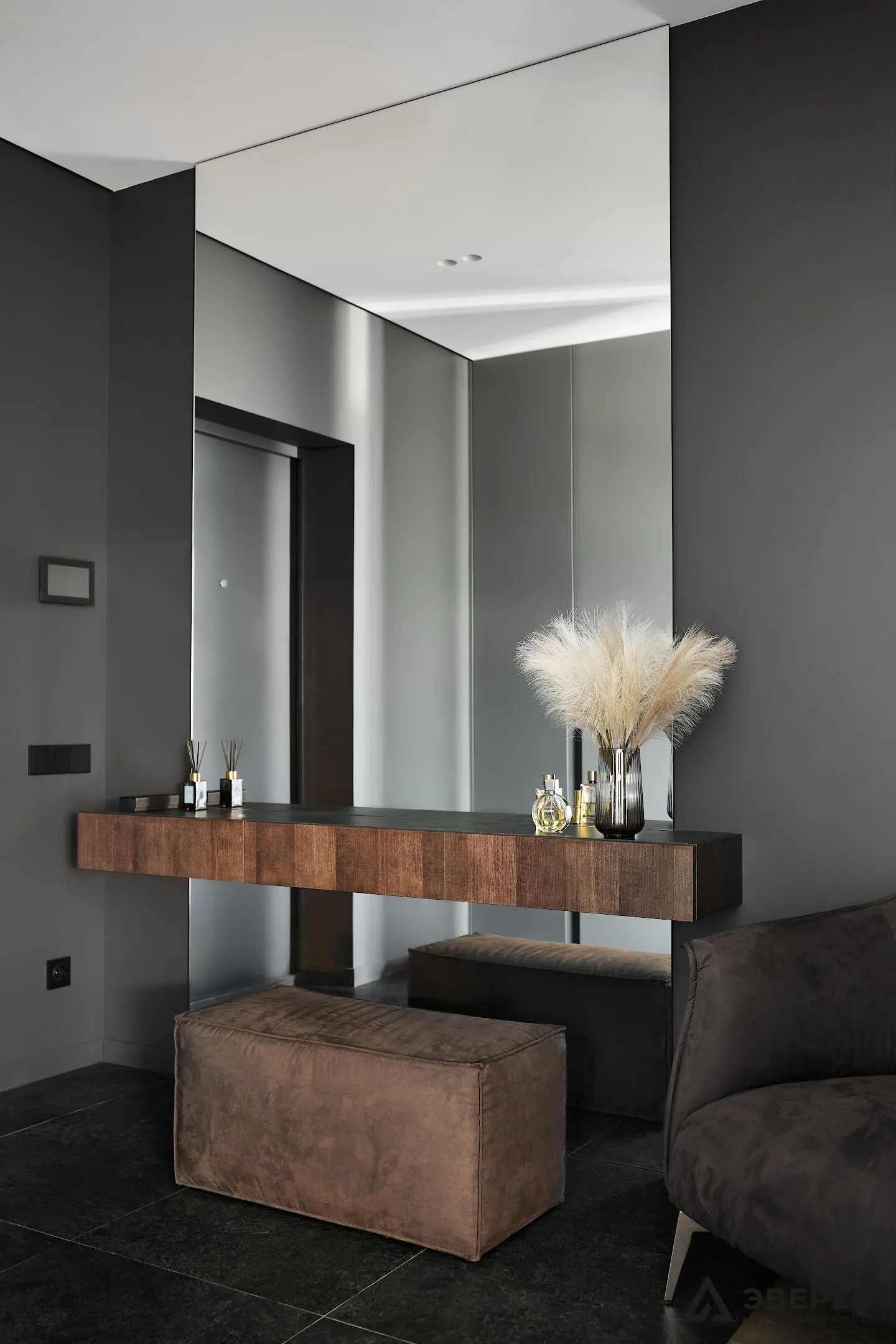 Огромное зеркало во весь рост, занимающее целую стену. Оно не только добавляет света и простора, но и позволяет вам в любой момент оценить свой образ перед выходом.