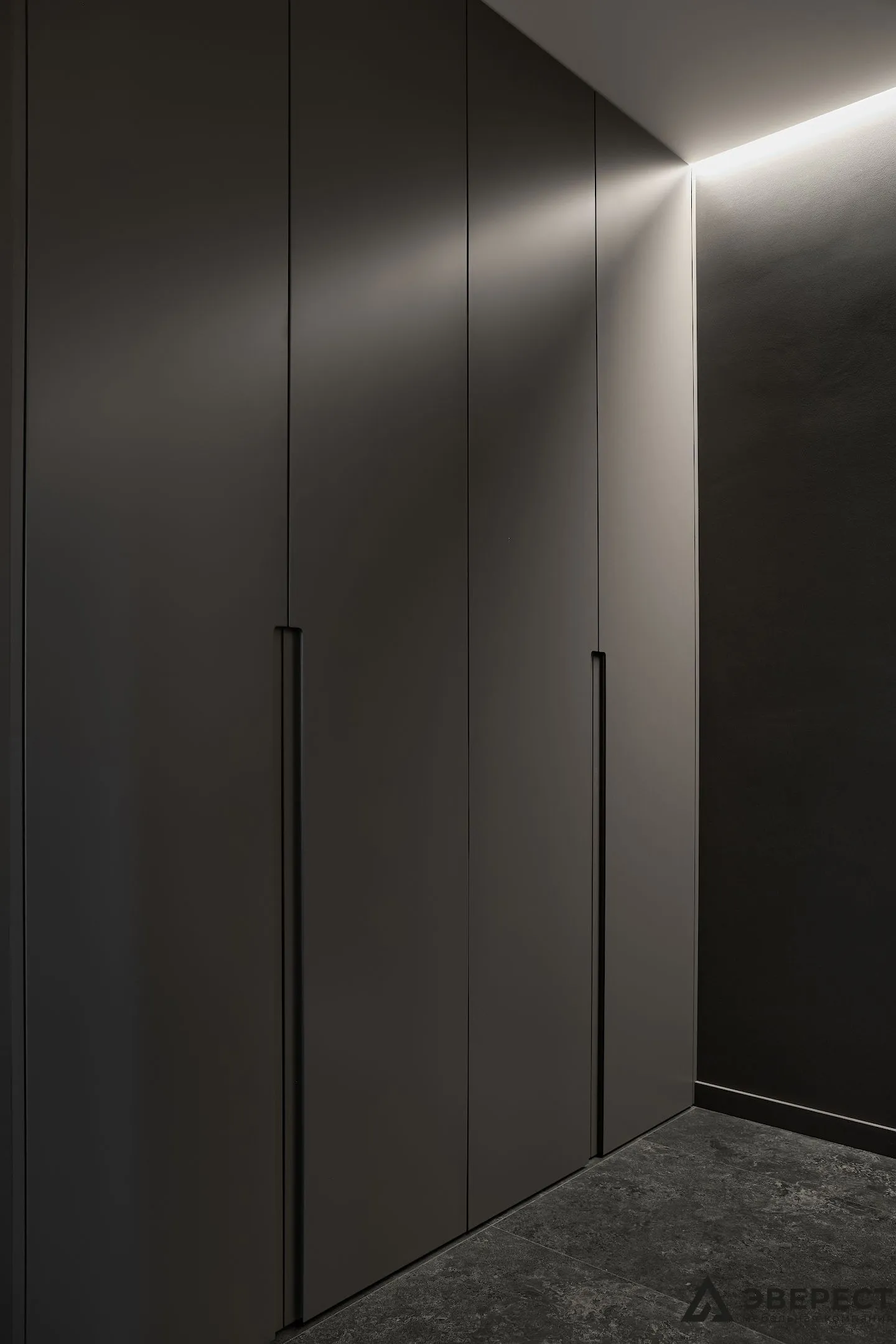 Атмосферная подсветка в теплых тонах создаёт уютную атмосферу, которая встречает вас, как только вы переступаете порог. Она делает прихожую не просто функциональной, но и по-настоящему красивой.