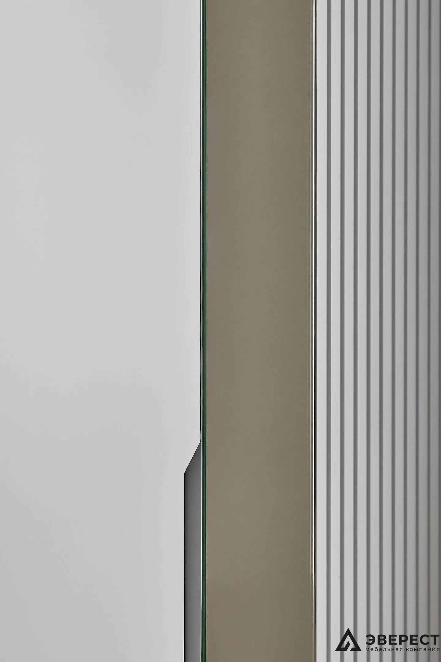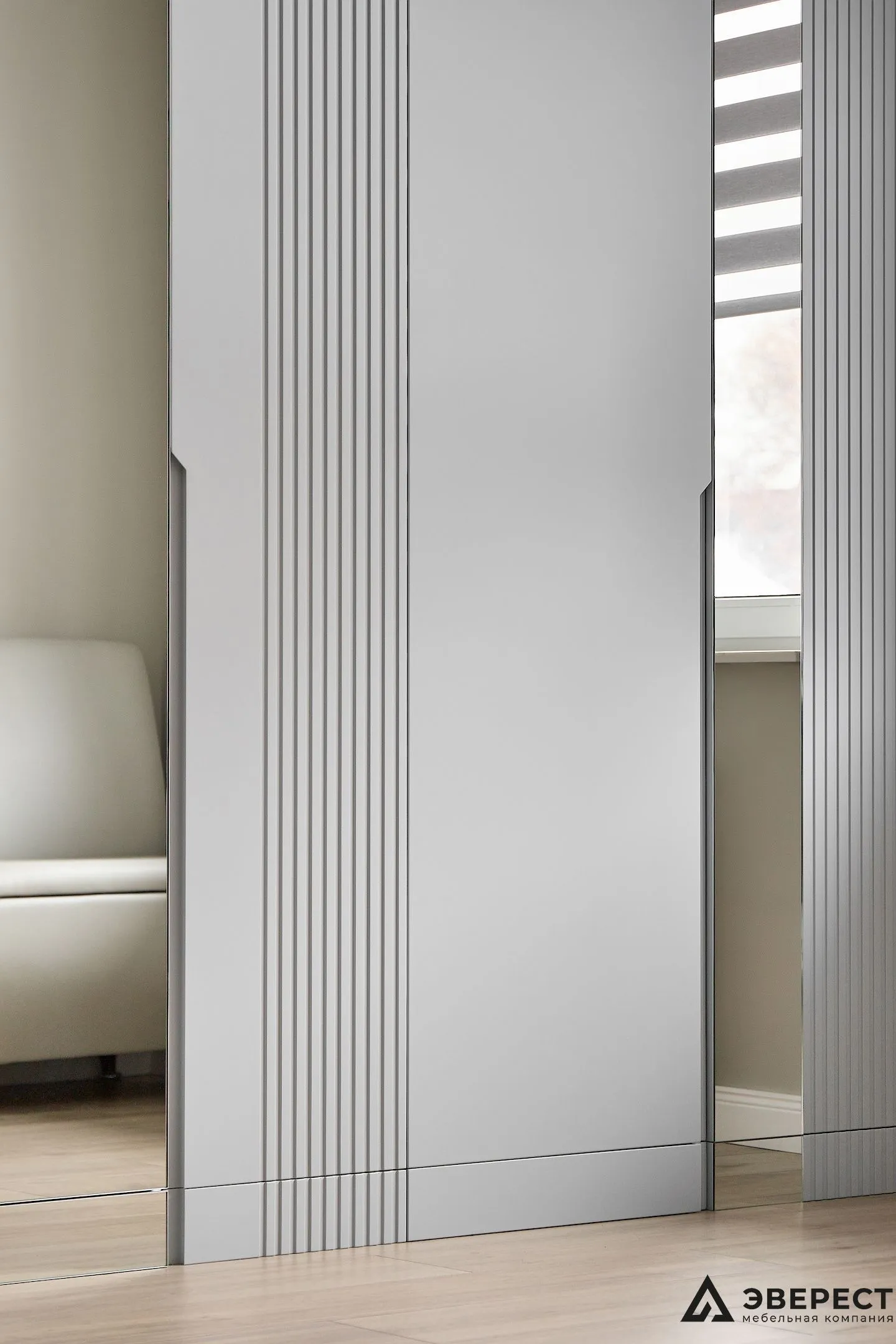 Шкаф из МДФ, окрашенный с фрезеровкой в виде реек и дополненный зеркальными фасадами, представляет собой идеальное решение для современного интерьера.
