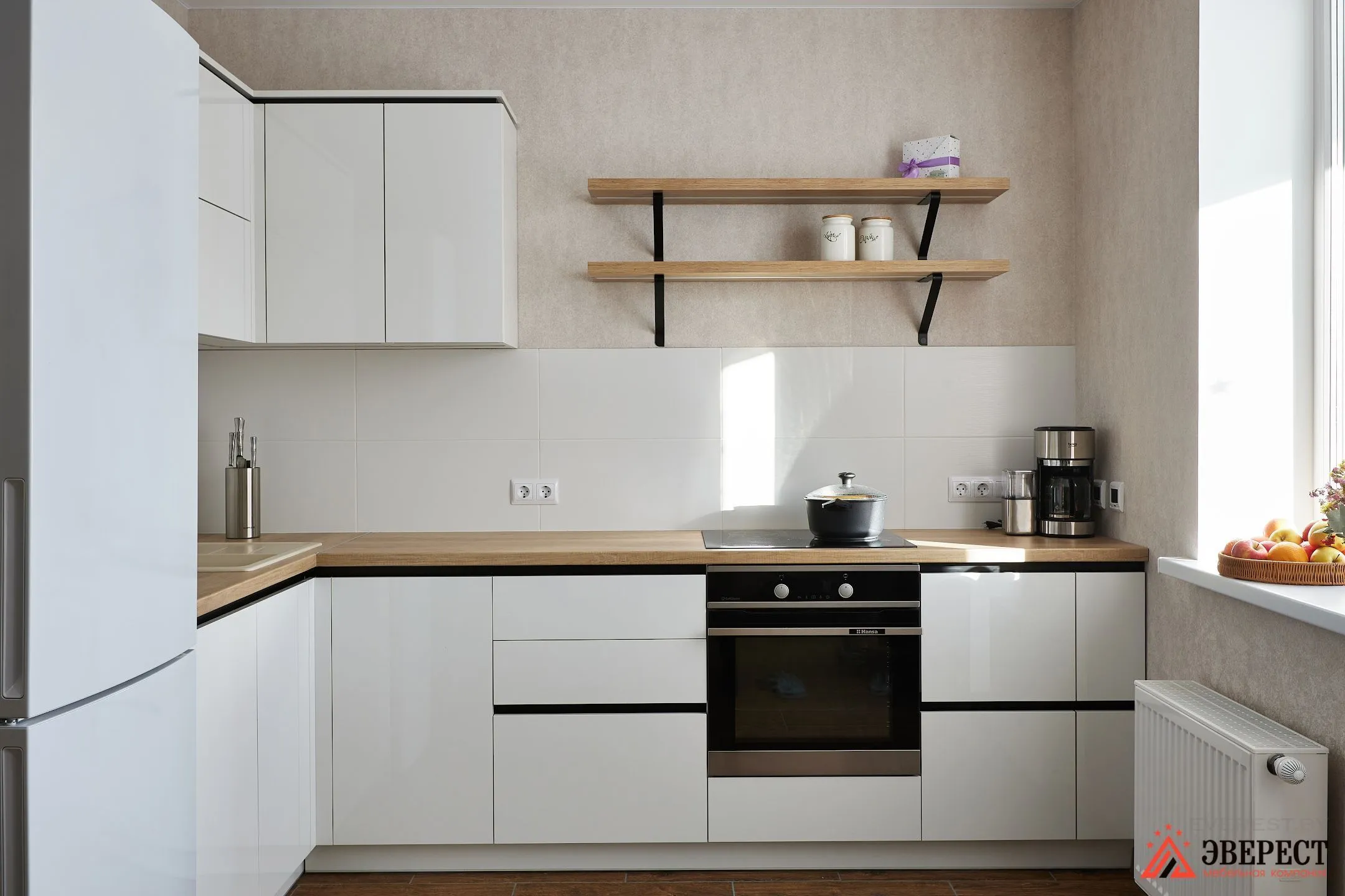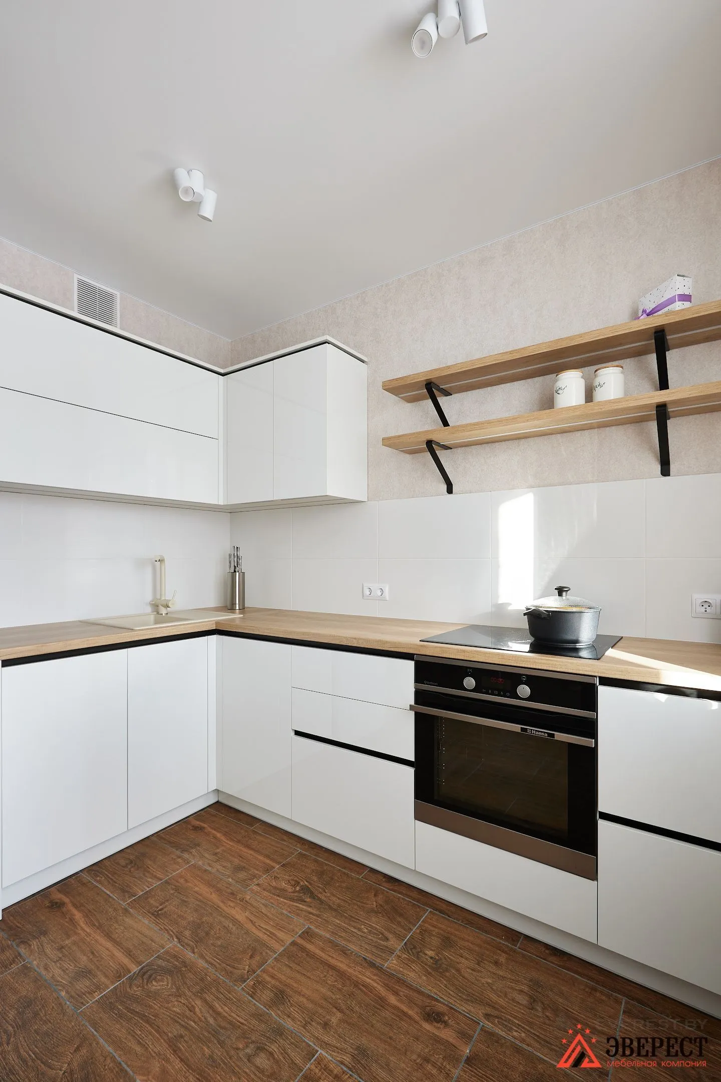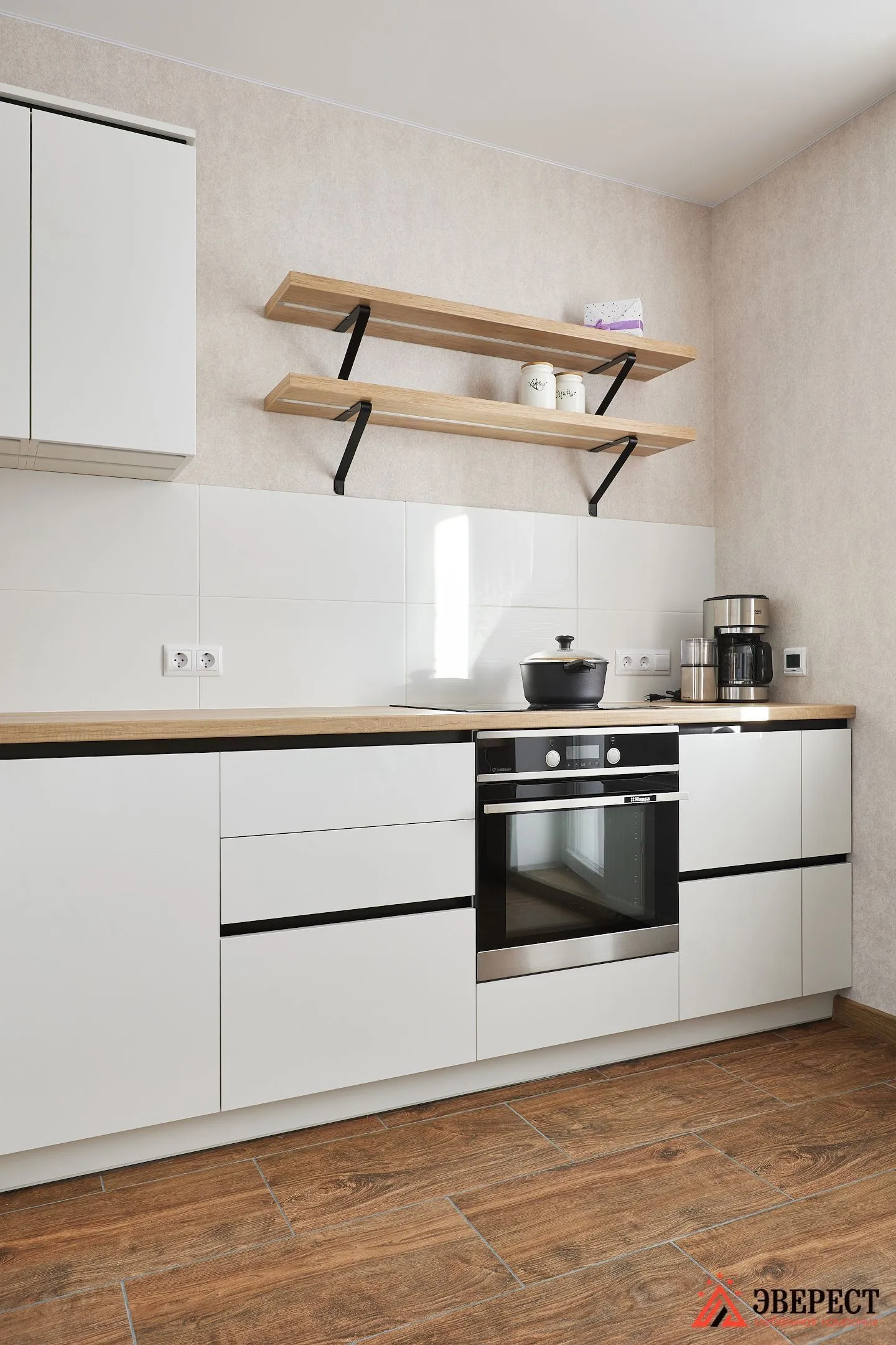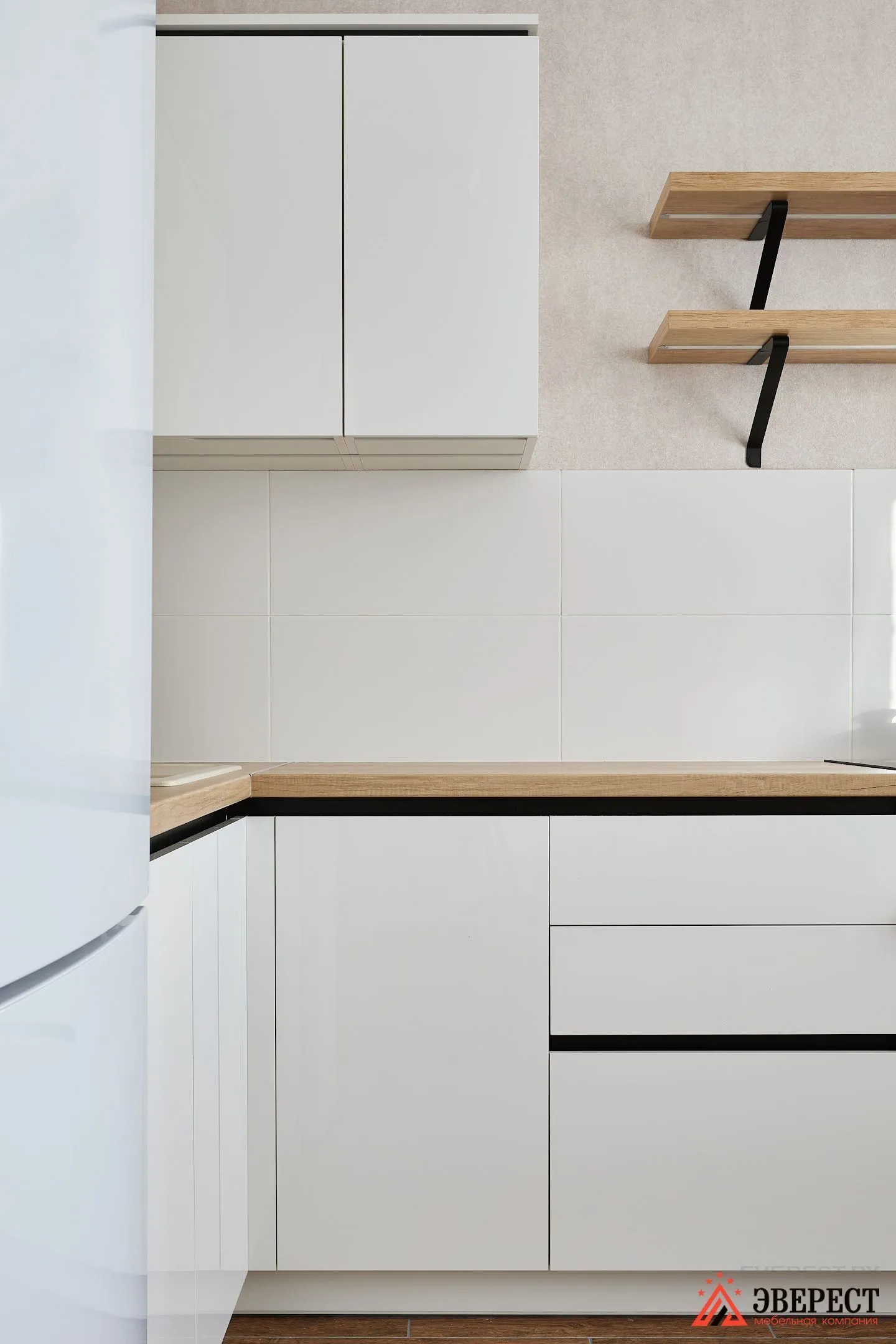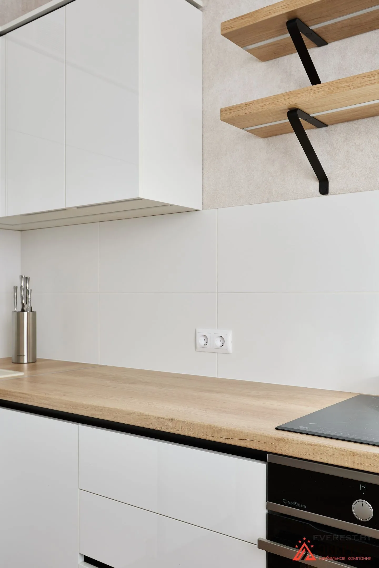 Верхних шкафов меньше, чем нижних. Вместо закрытой части над варочной поверхностью мы повесили две открытые полки, выполненные из Дуба Небраска от EGGER, как и столешница. Такой прием добавляет проекту немного воздушности✔️