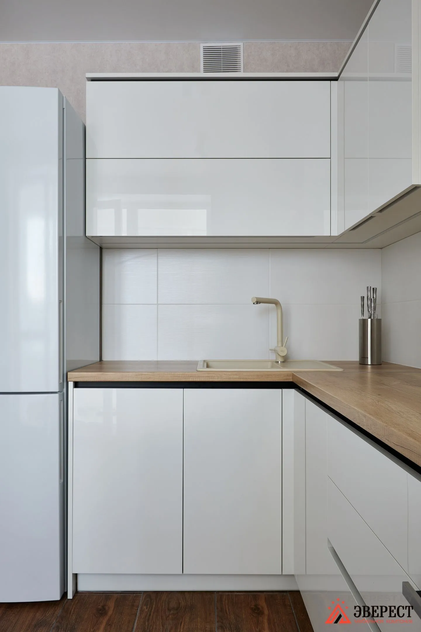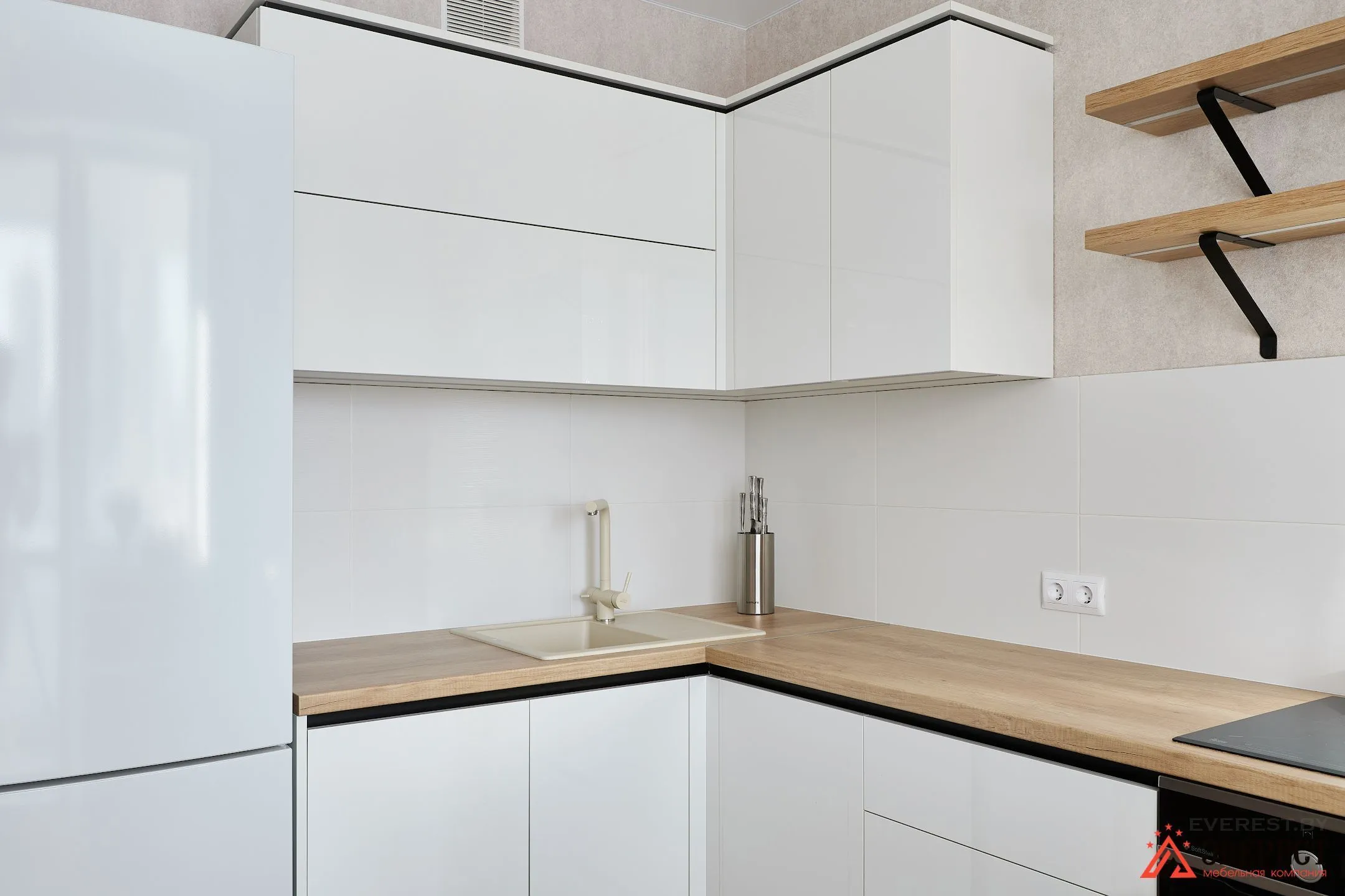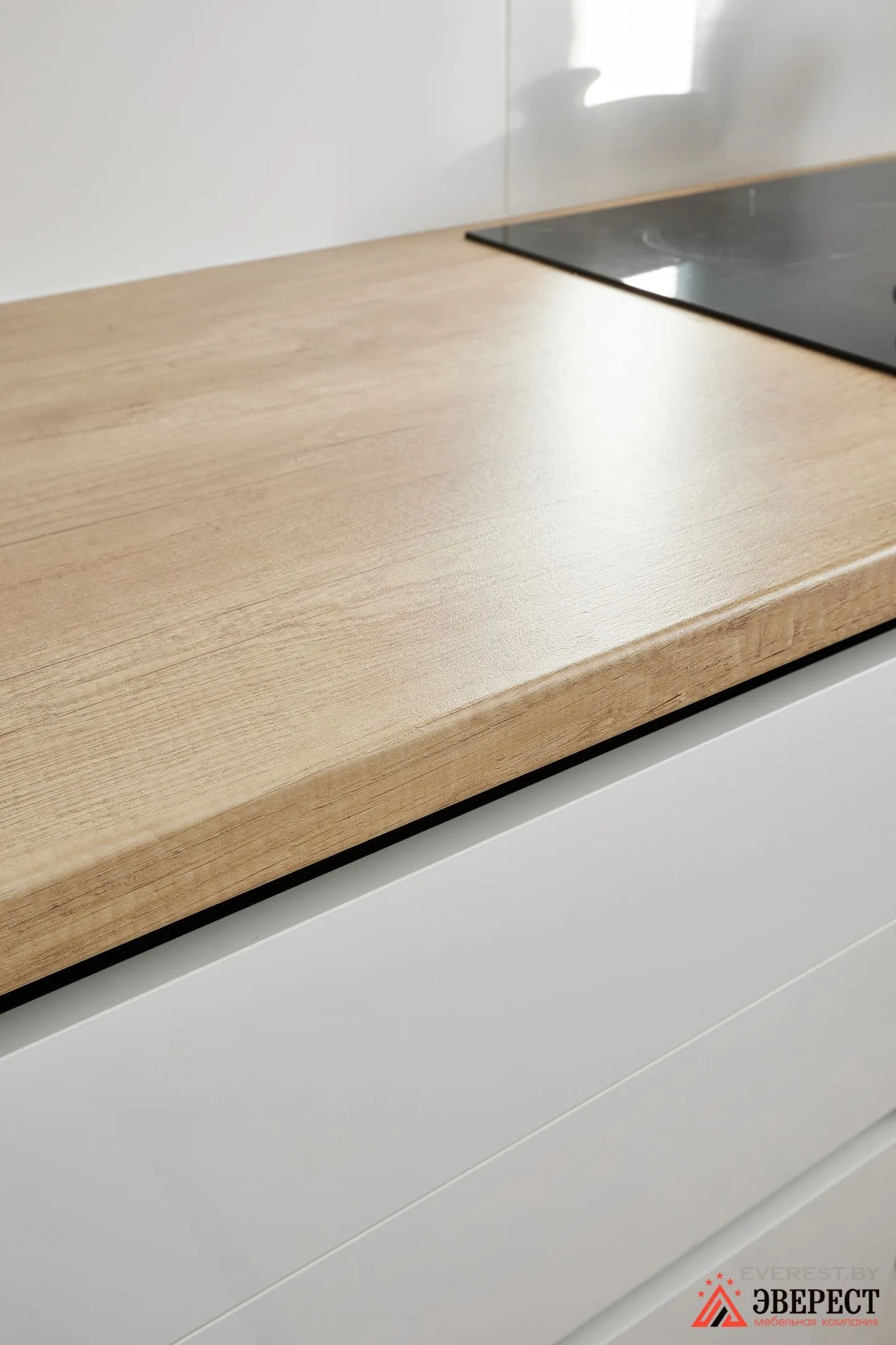 Перед вами уже классическое сочетание белых фасадов и деревянных поверхностей. Но давайте рассмотрим их поближе.