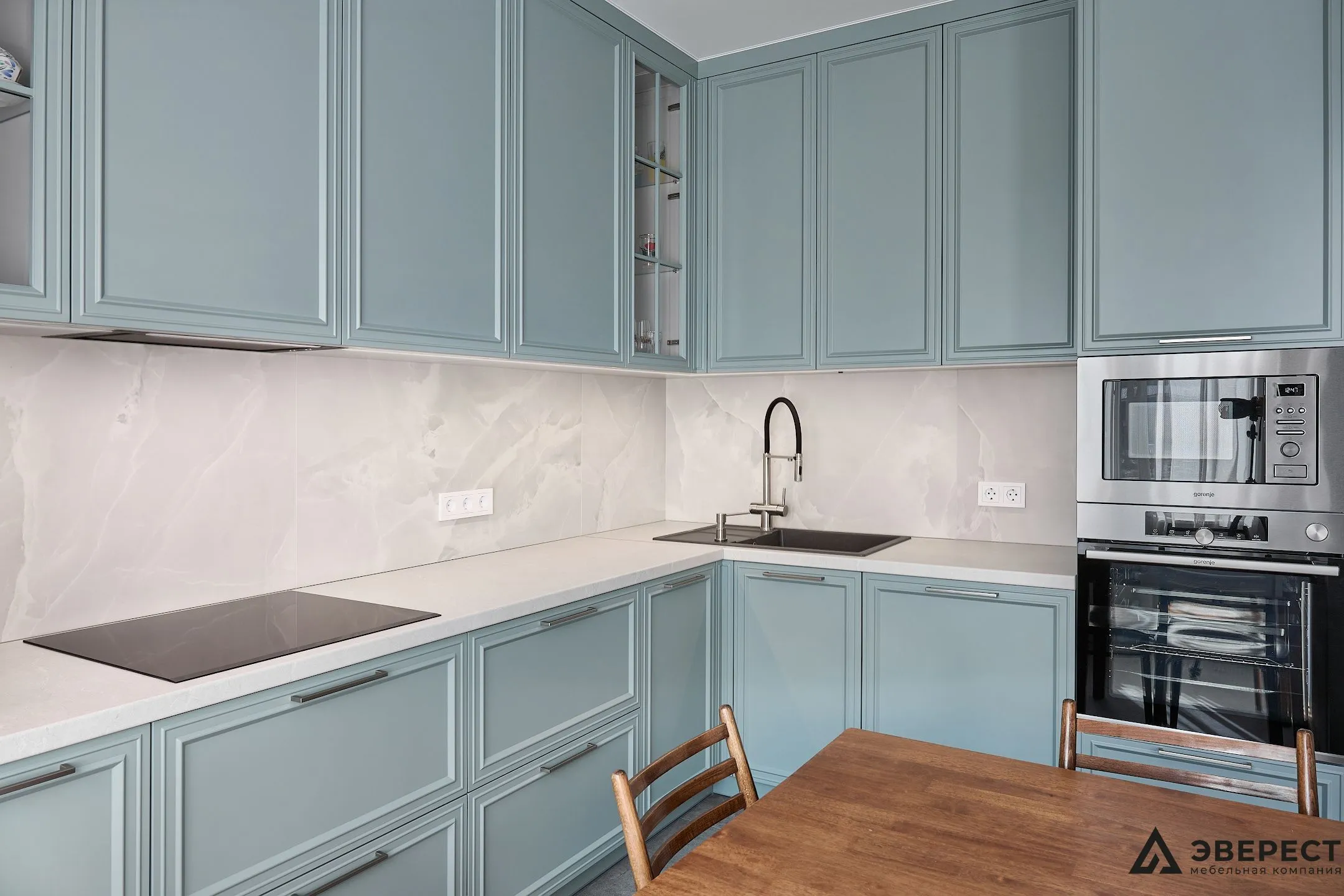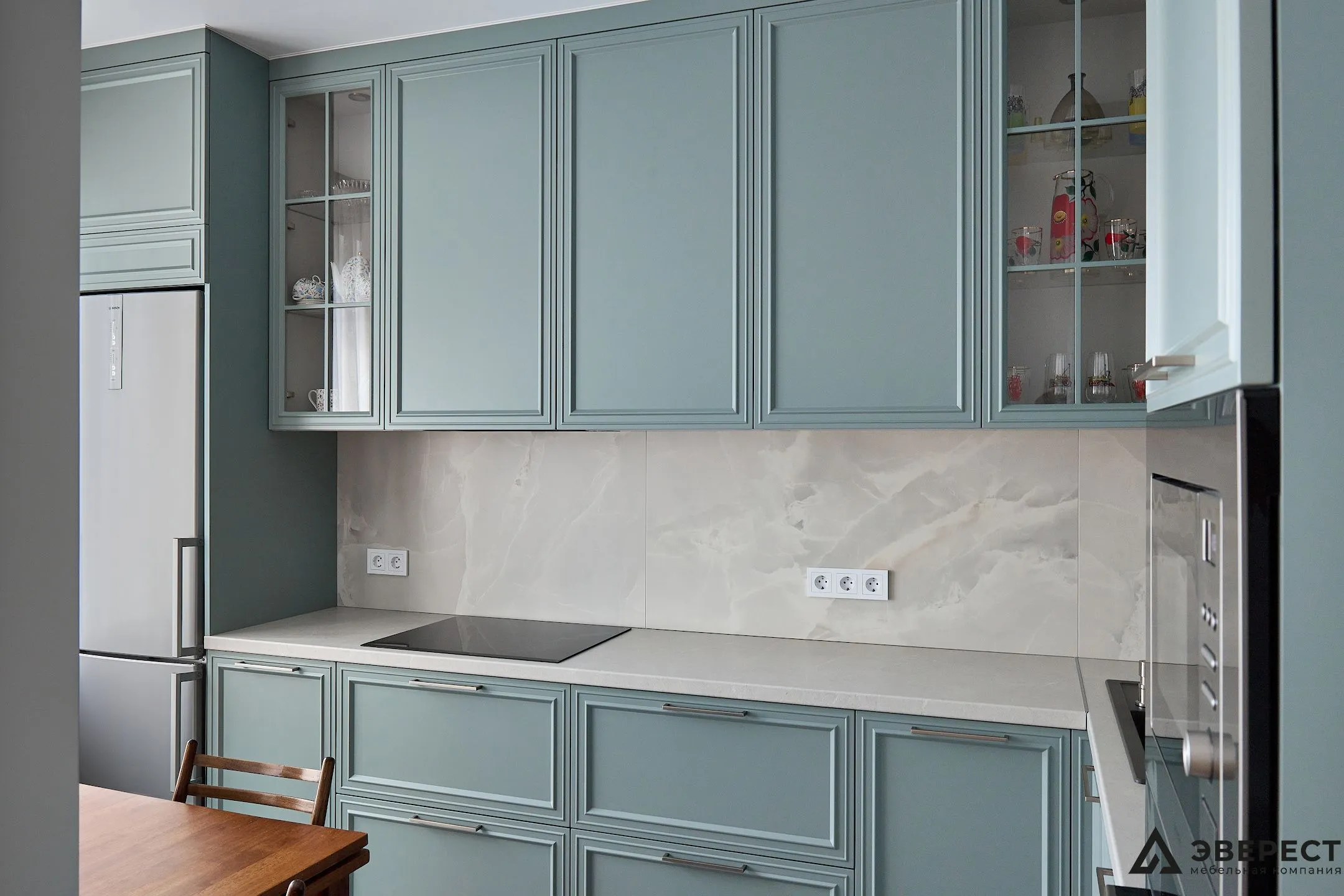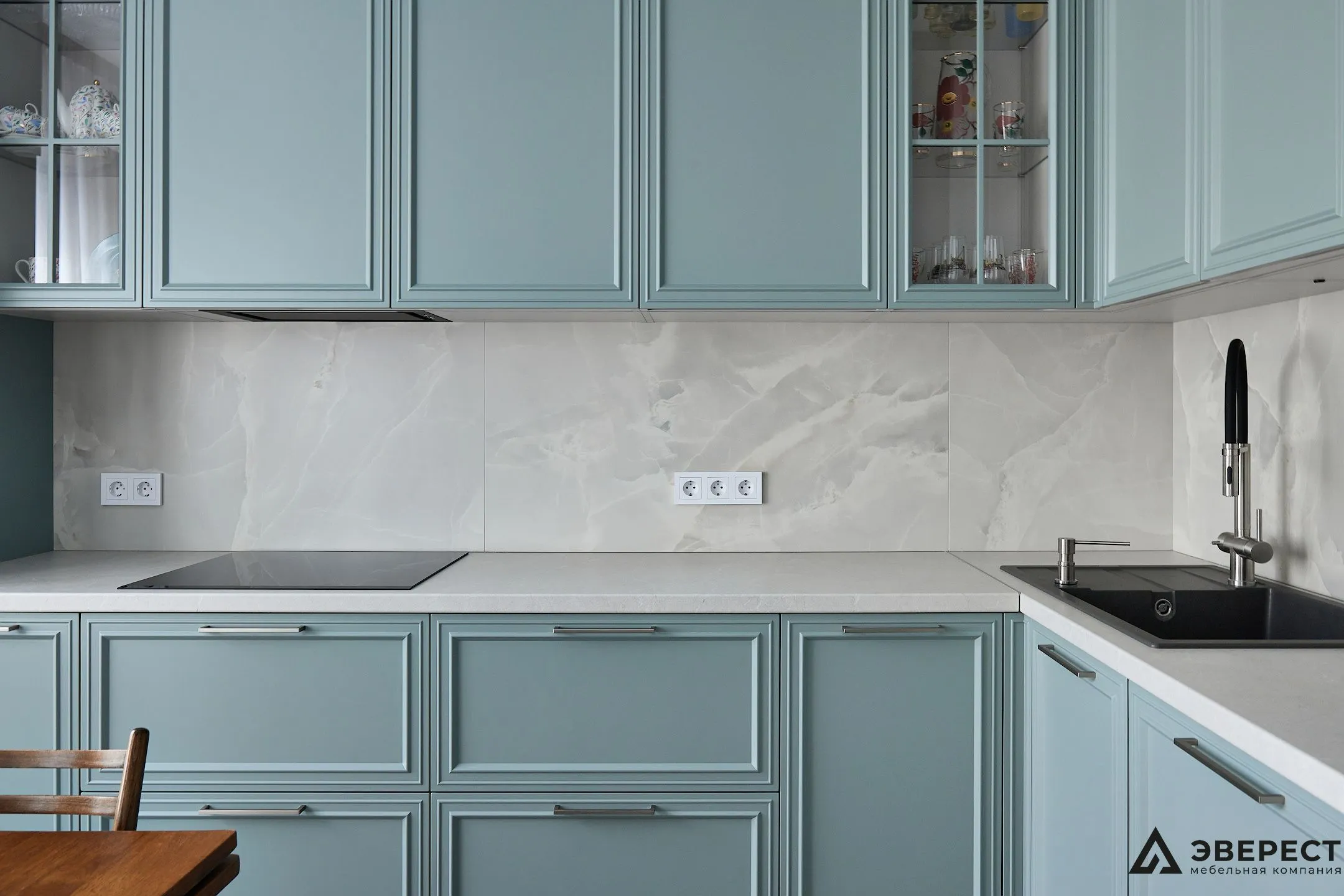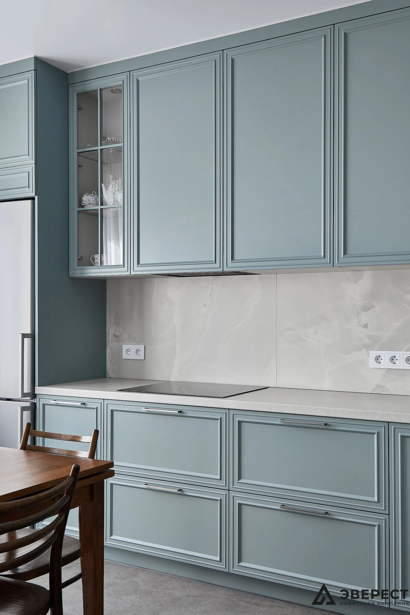 Эта кухня — идеальный баланс между классикой и современностью. Фасады из матового МДФ с фрезеровкой в нежно-бирюзовом оттенке создают ощущение уюта и элегантности. Светлый мраморный фартук добавляет воздушности, создавая стильный контраст.