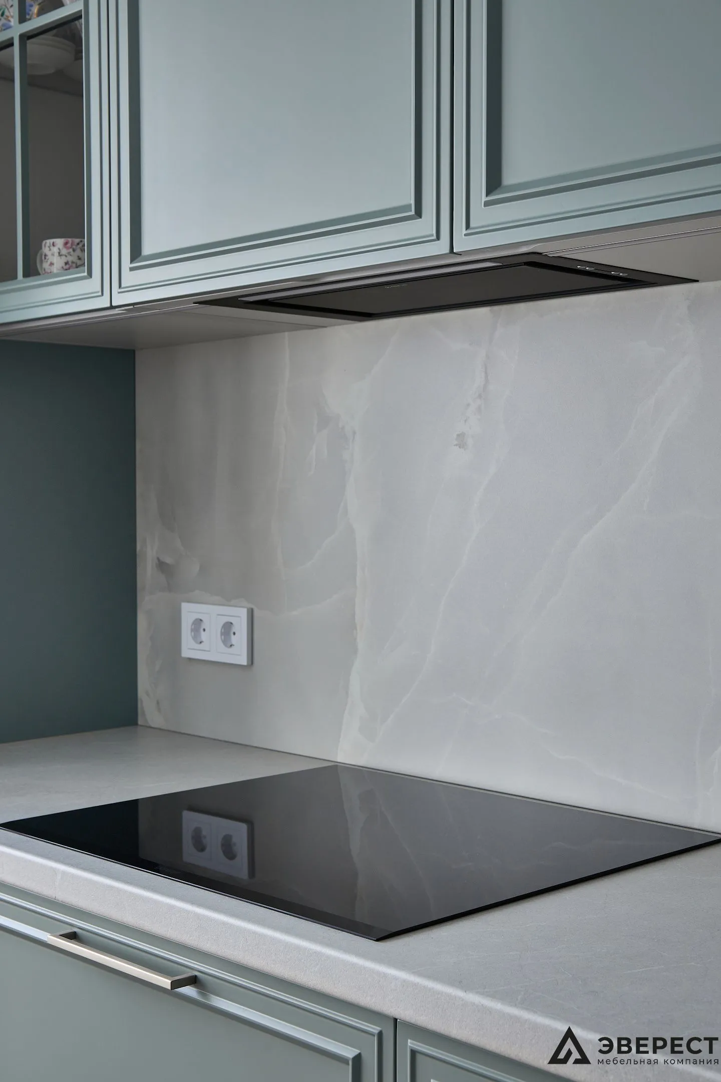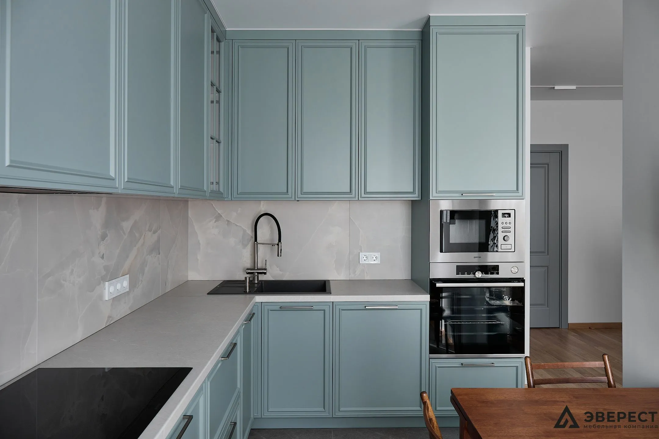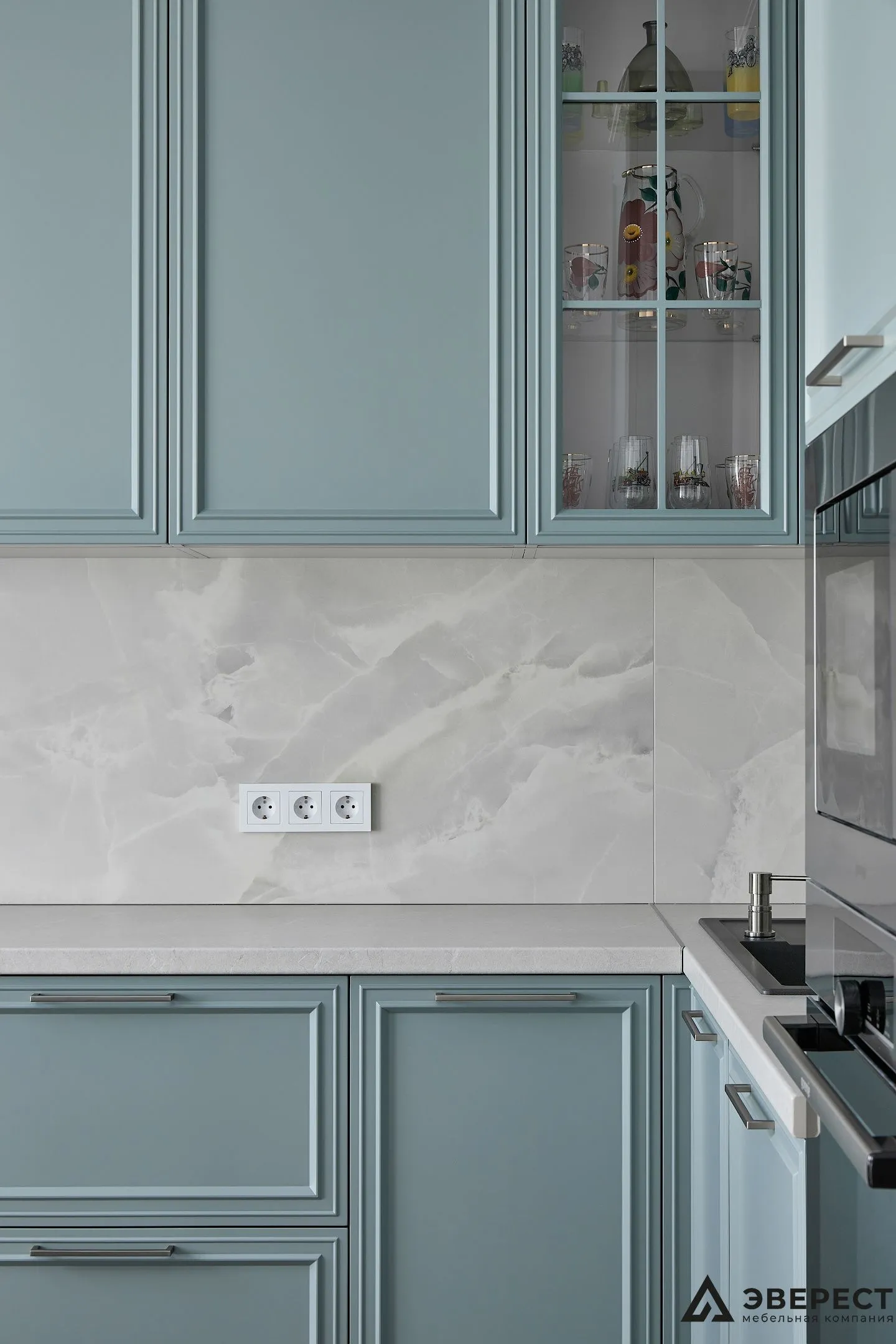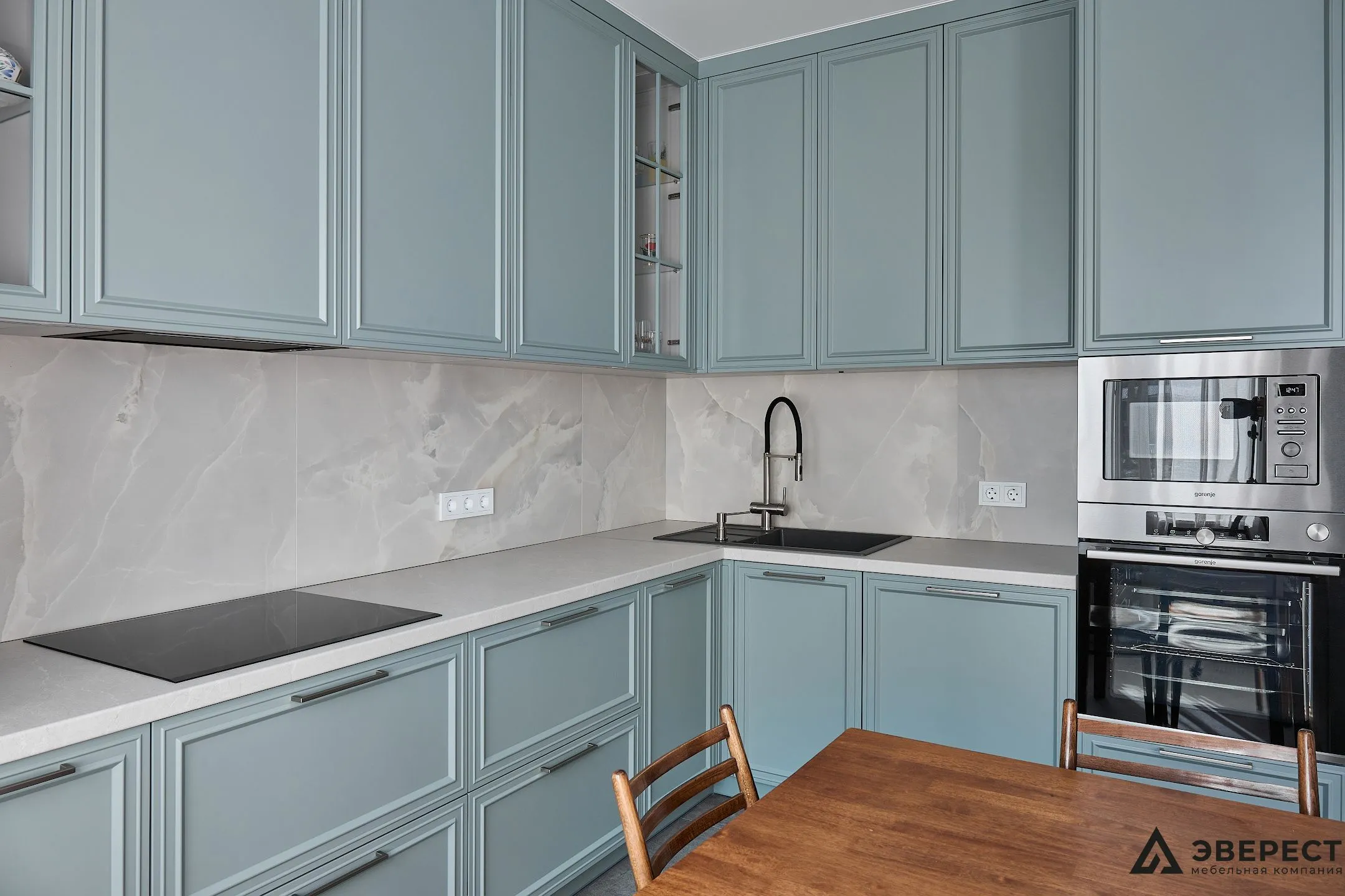 Эта кухня — идеальный баланс между классикой и современностью. Фасады из матового МДФ с фрезеровкой в нежно-бирюзовом оттенке создают ощущение уюта и элегантности. Светлый мраморный фартук добавляет воздушности, создавая стильный контраст.