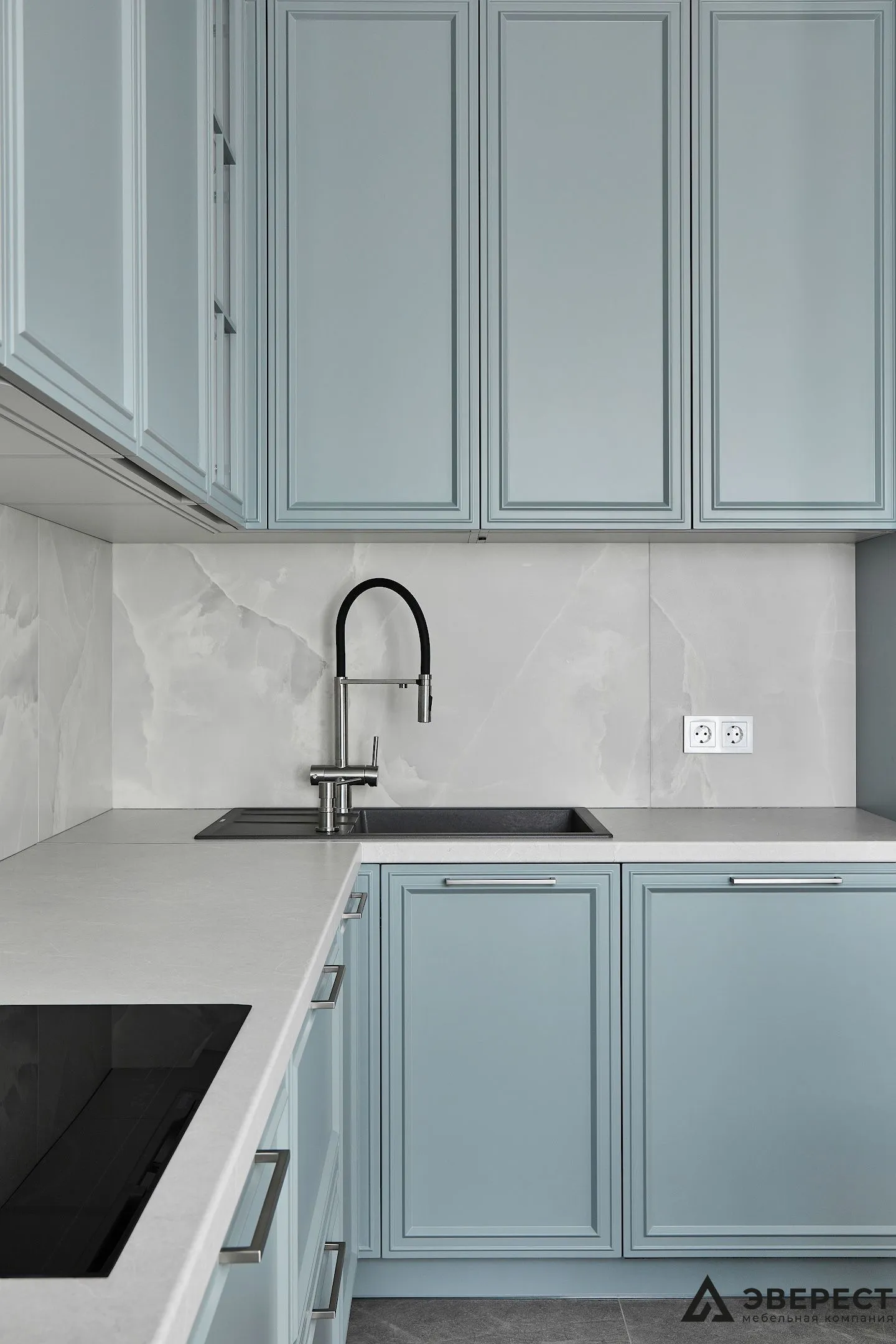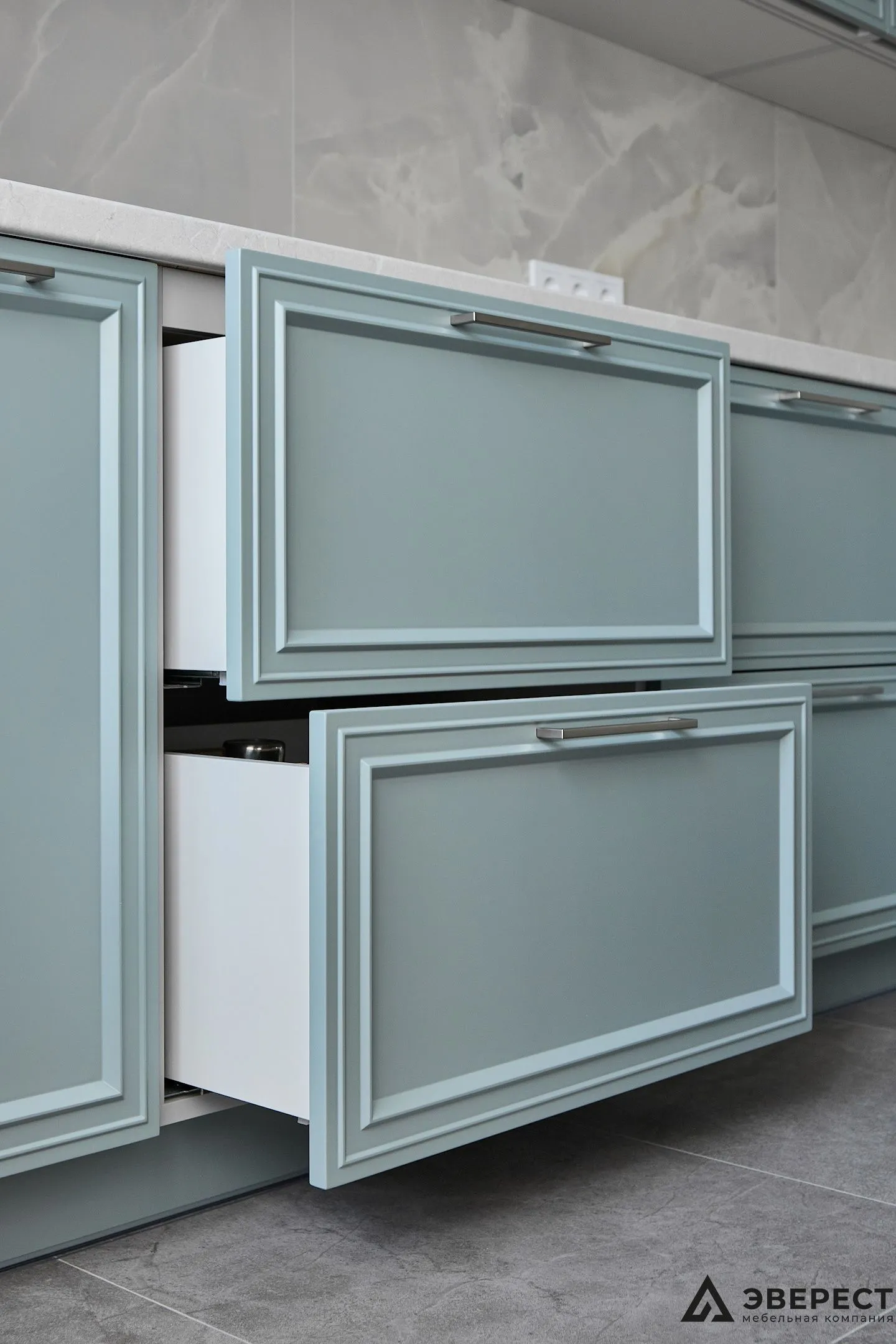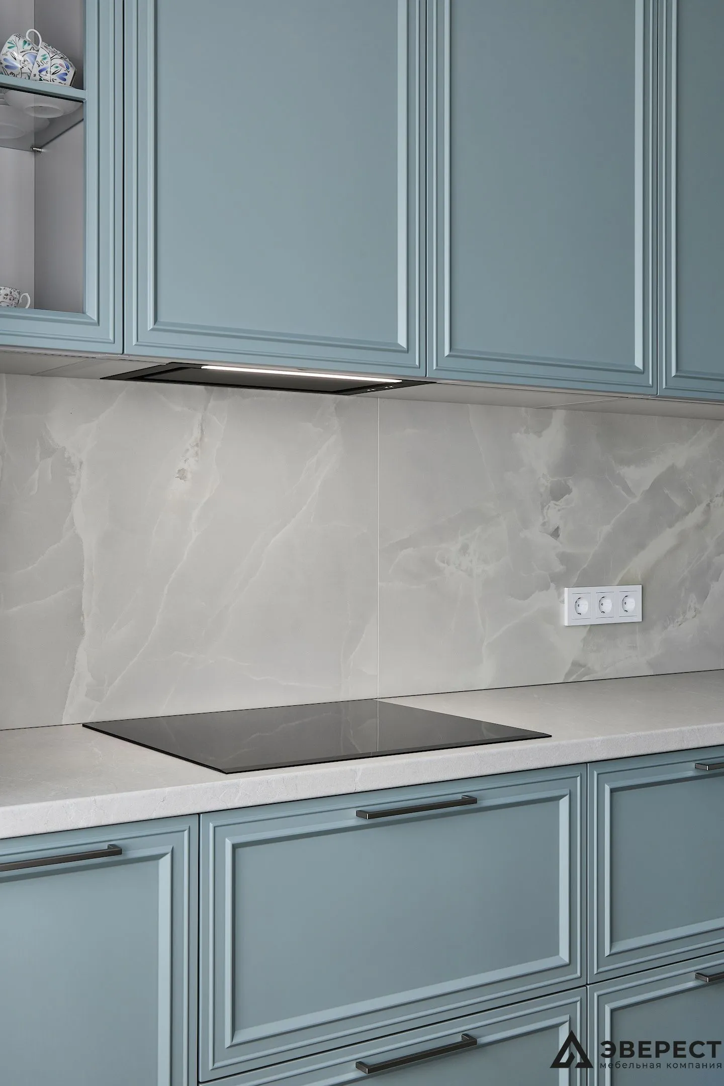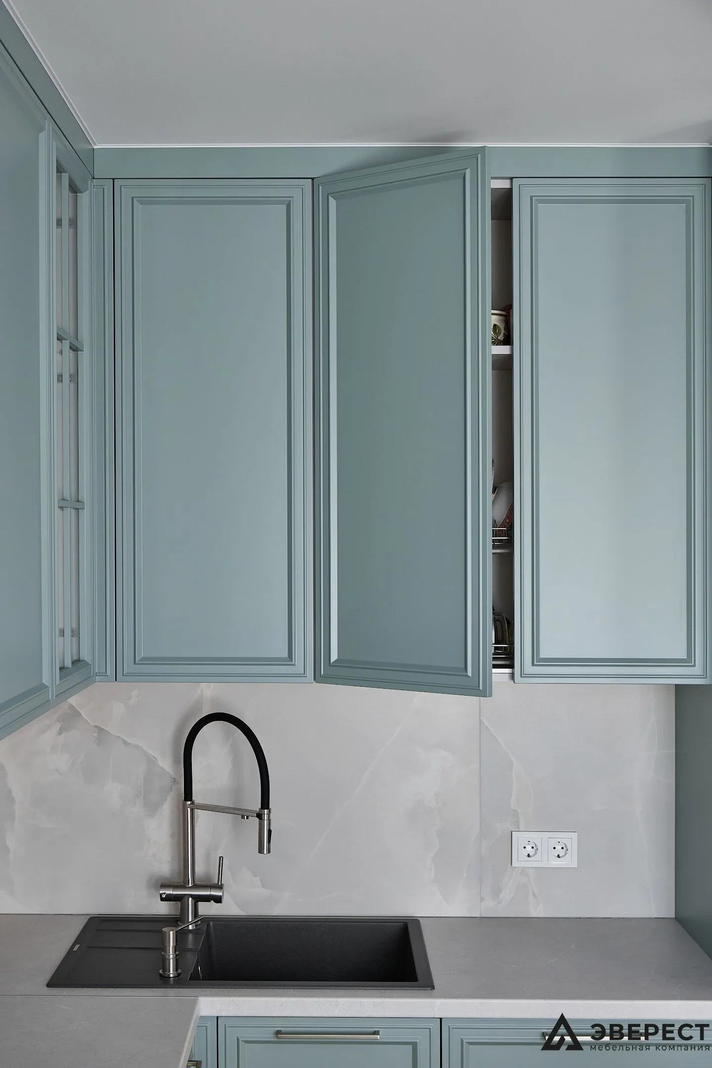 Эта кухня — идеальный баланс между классикой и современностью. Фасады из матового МДФ с фрезеровкой в нежно-бирюзовом оттенке создают ощущение уюта и элегантности. Светлый мраморный фартук добавляет воздушности, создавая стильный контраст.