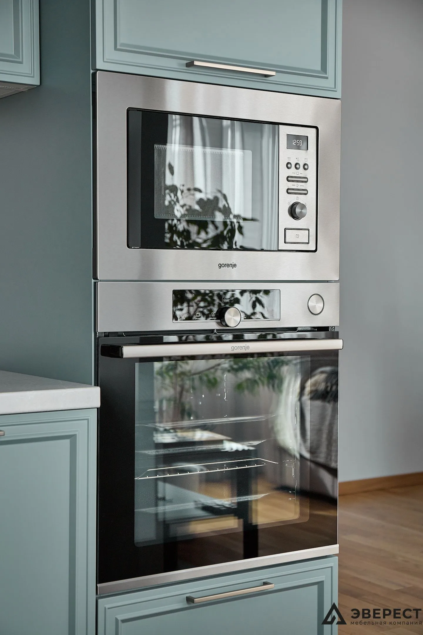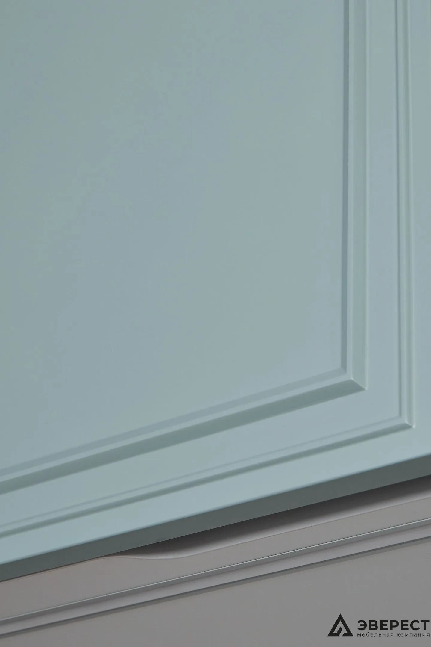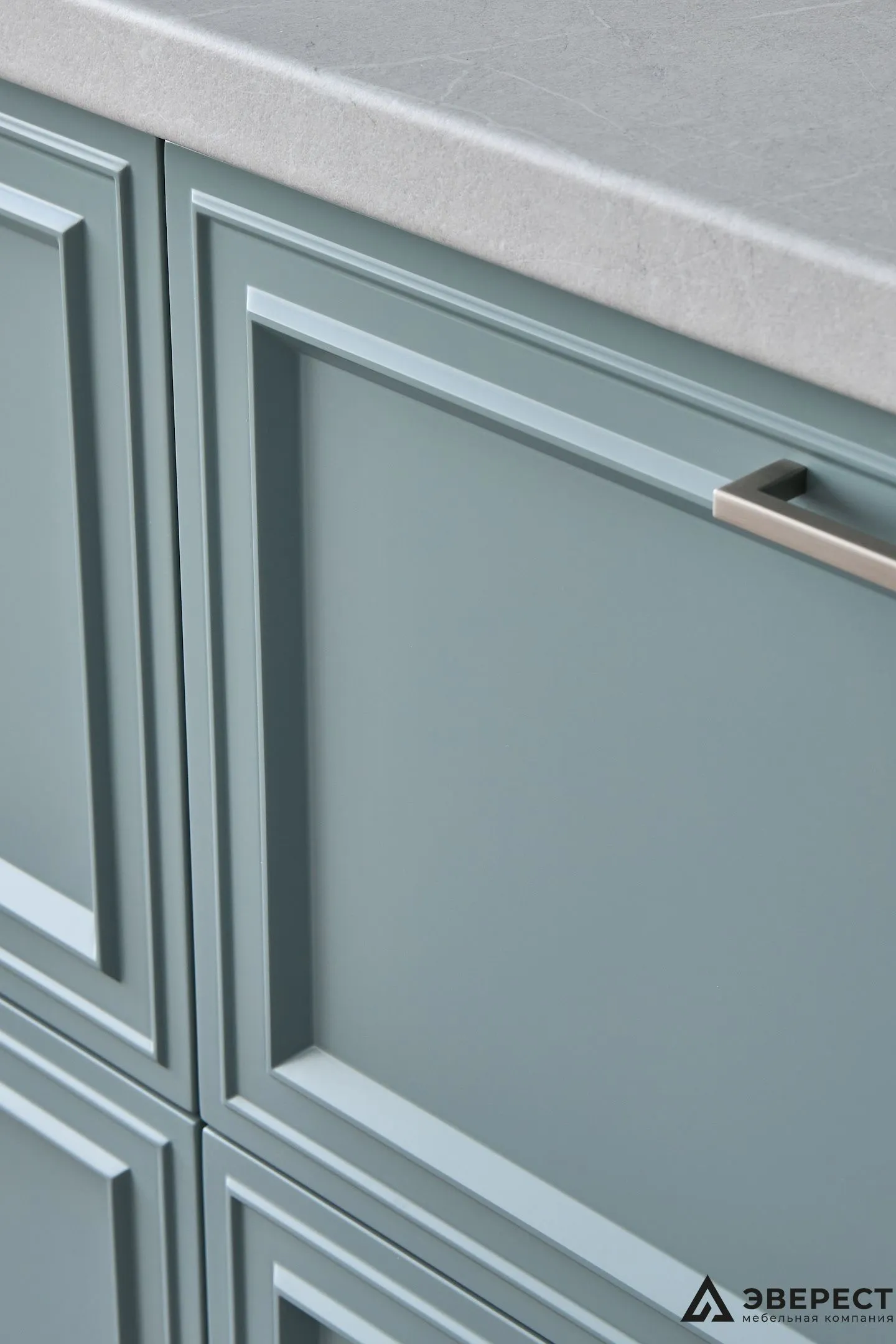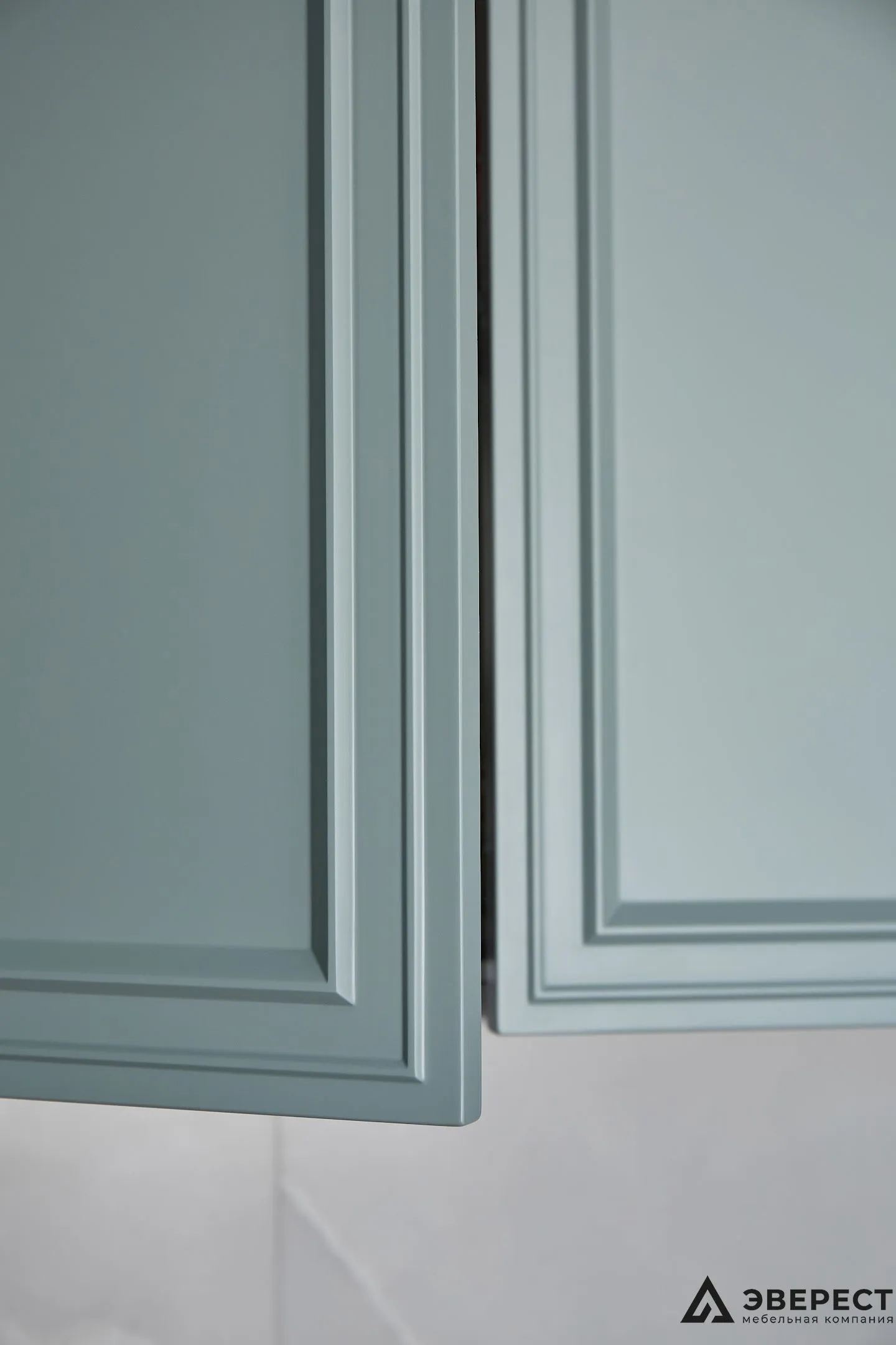 Эта кухня — идеальный баланс между классикой и современностью. Фасады из матового МДФ с фрезеровкой в нежно-бирюзовом оттенке создают ощущение уюта и элегантности. Светлый мраморный фартук добавляет воздушности, создавая стильный контраст.