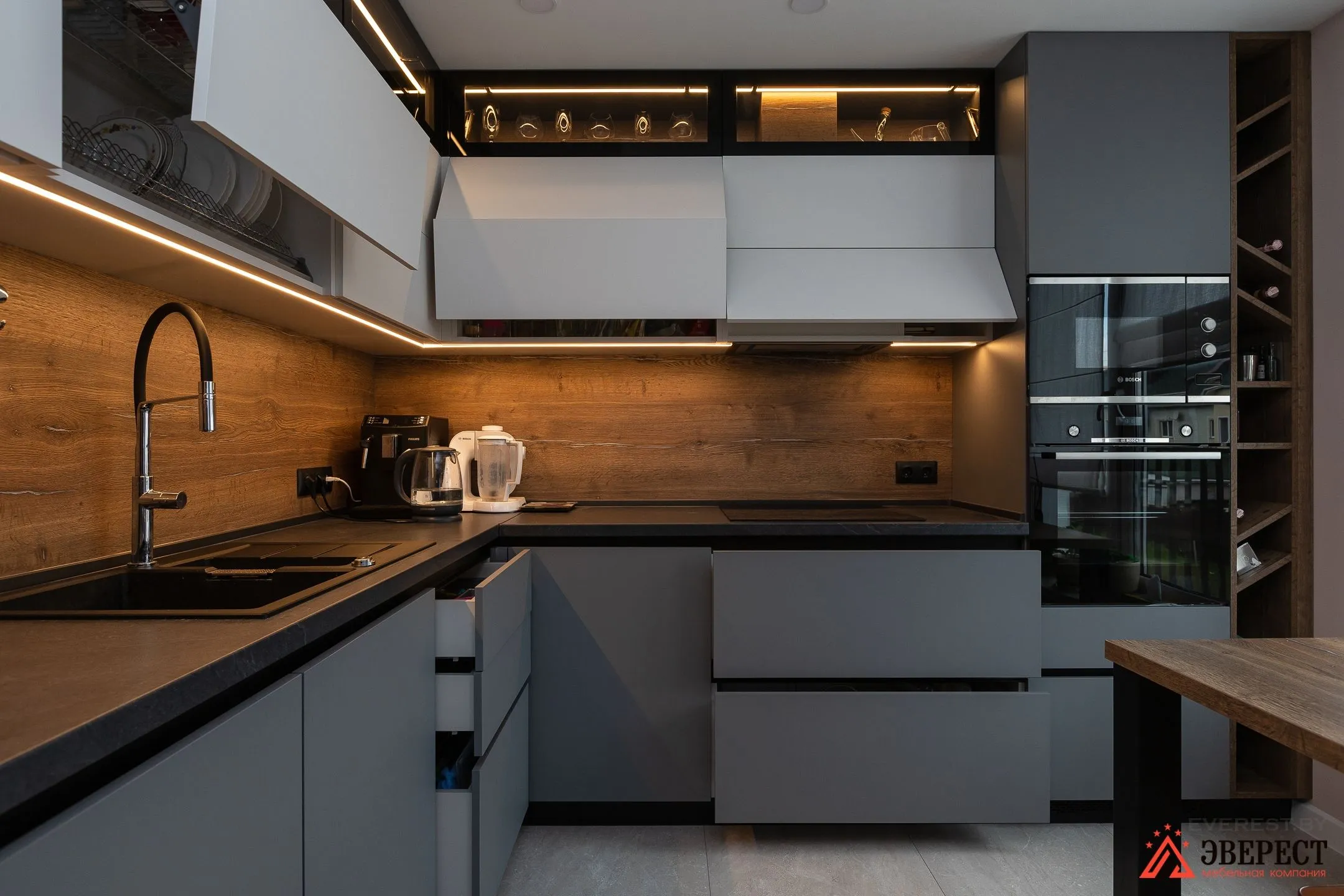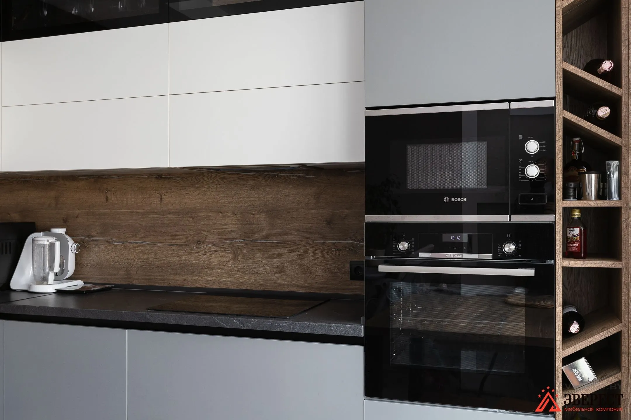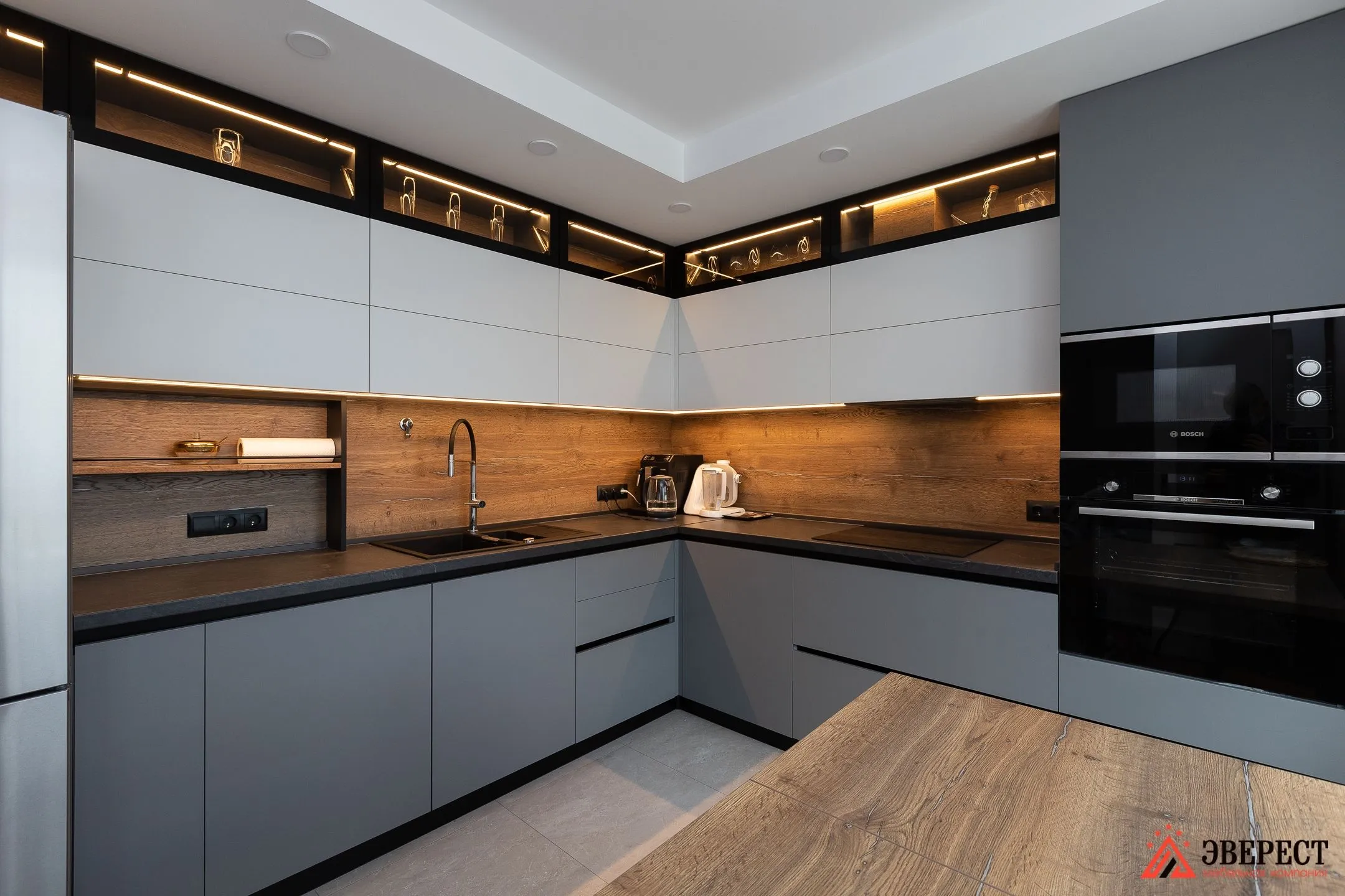 Нижние фасады и пенал выполнены из Fenix 0752 Grigio Antrim