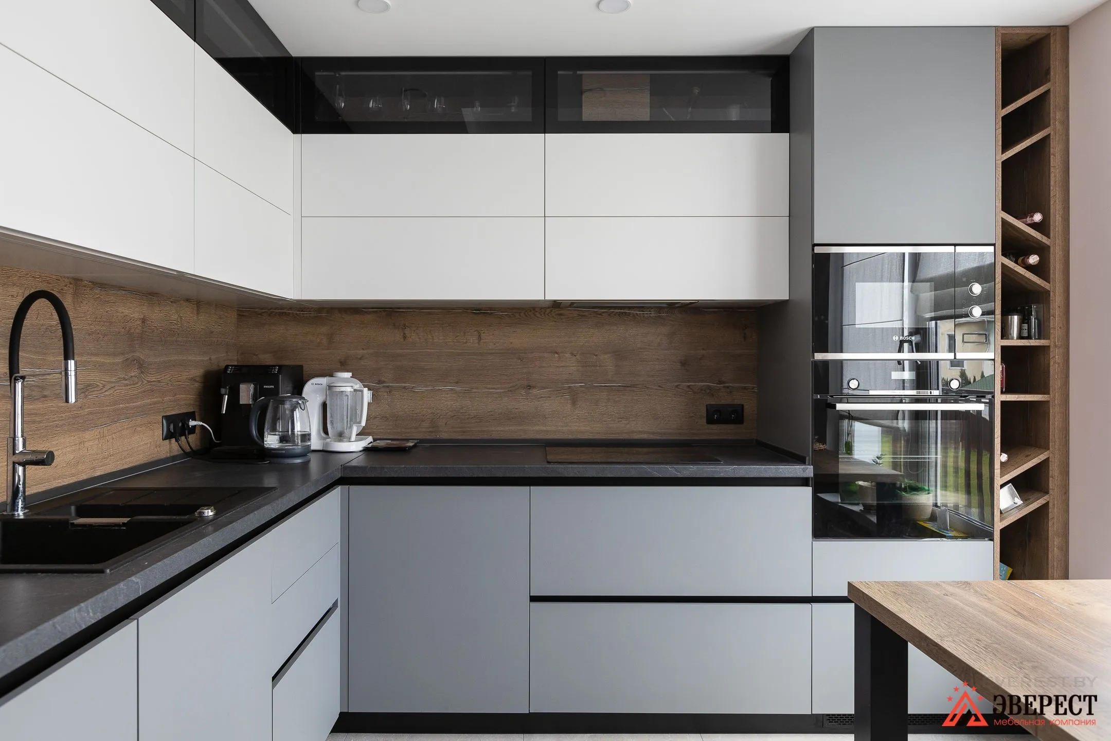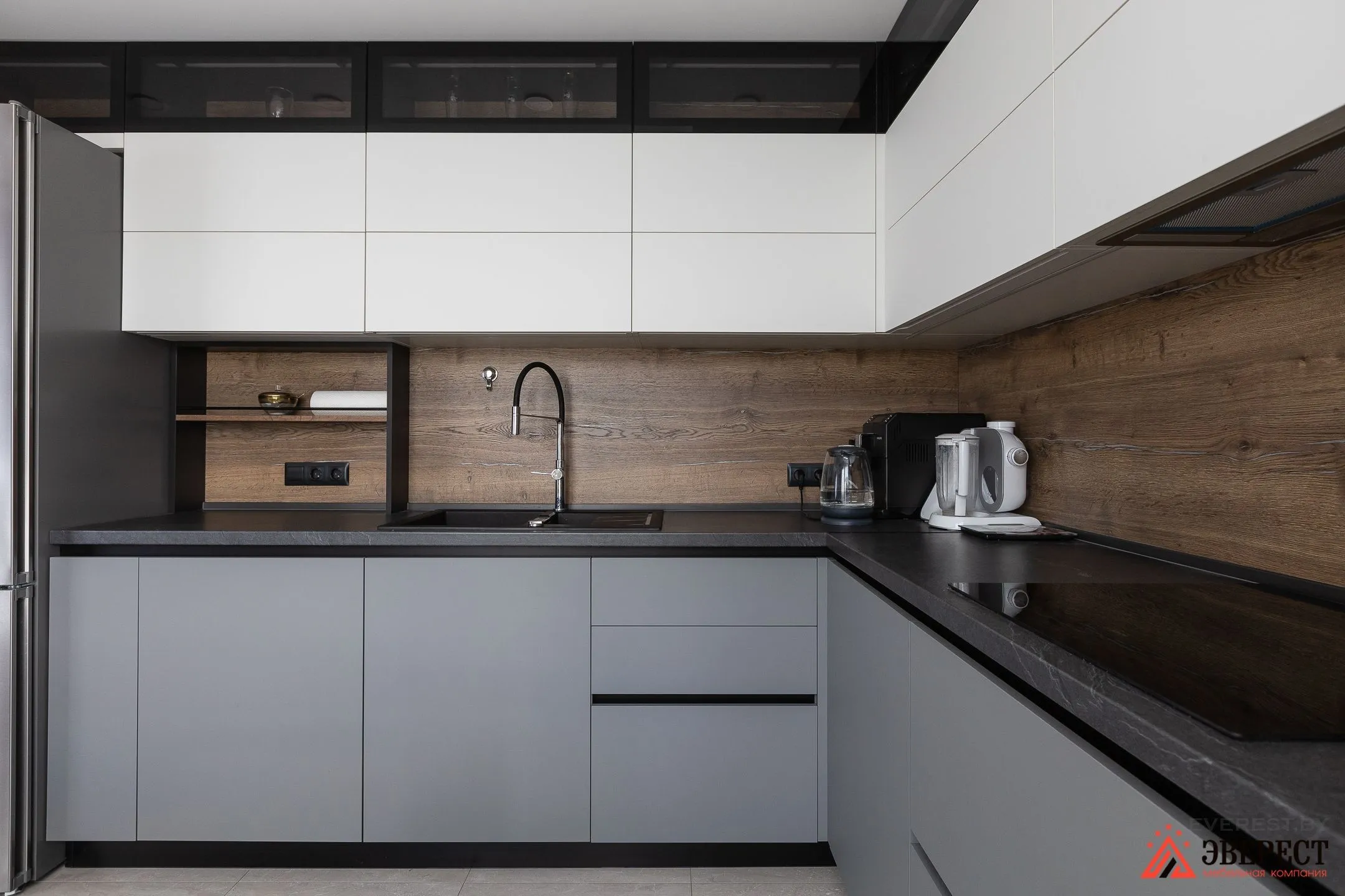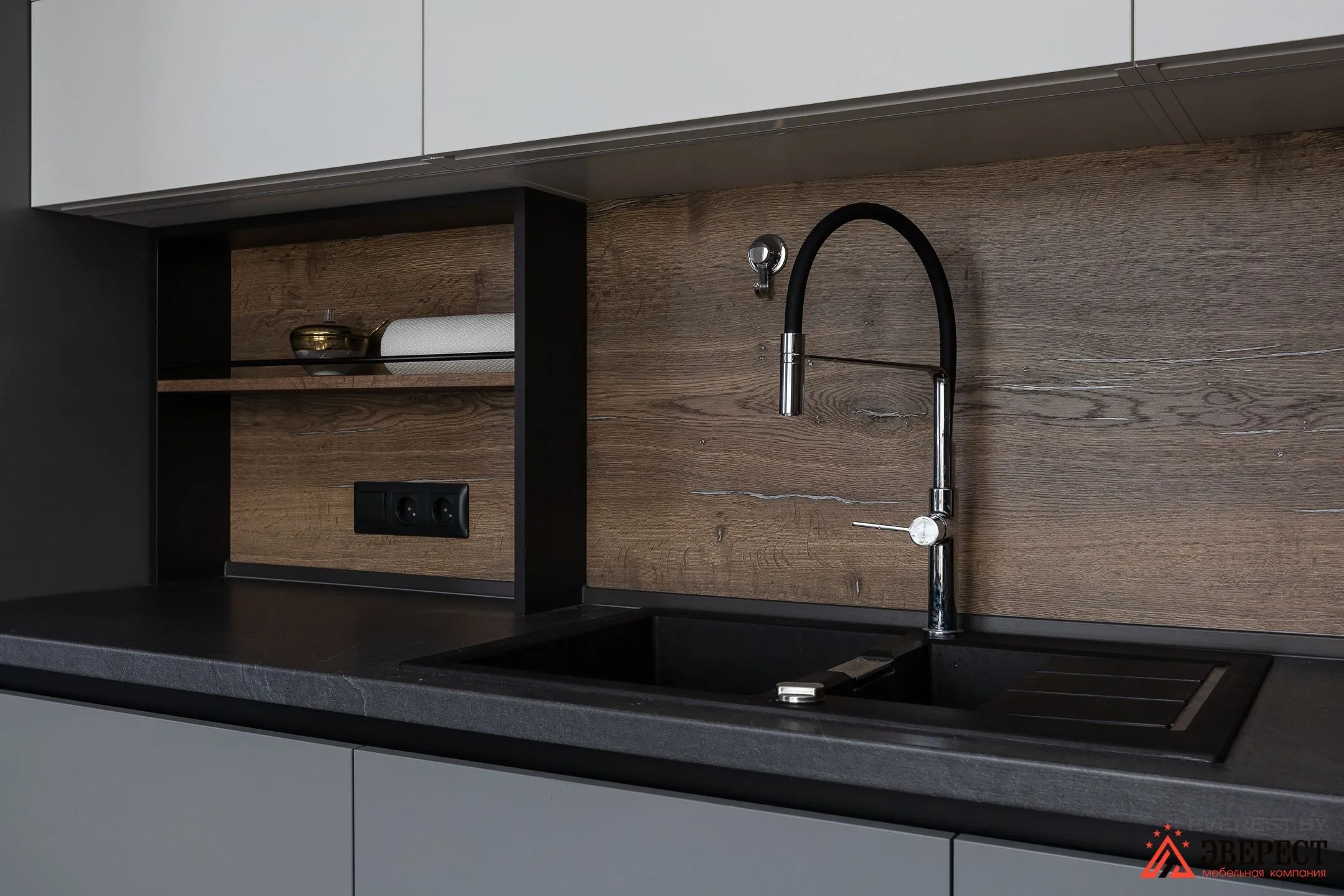 Нижние фасады и пенал выполнены из Fenix 0752 Grigio Antrim