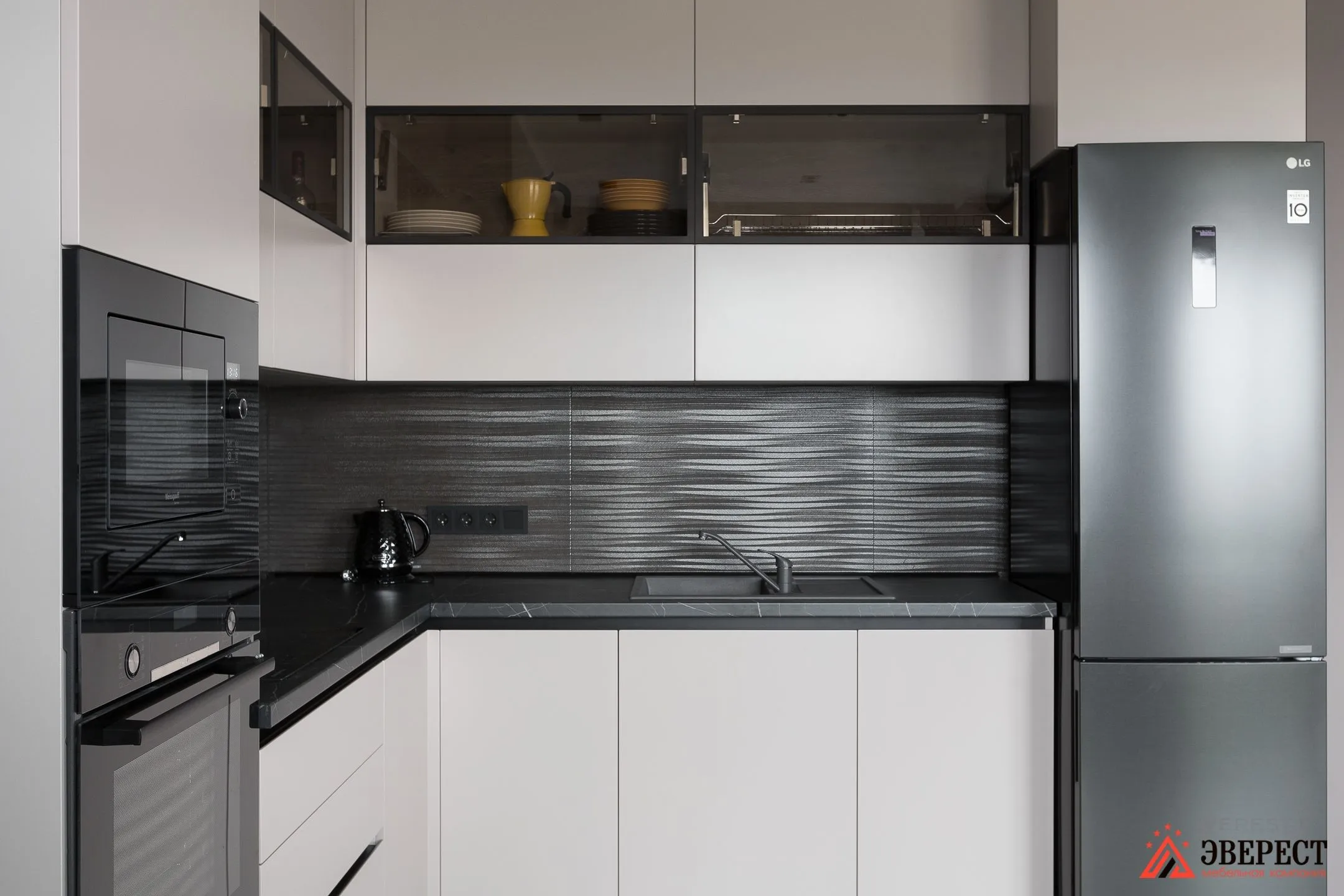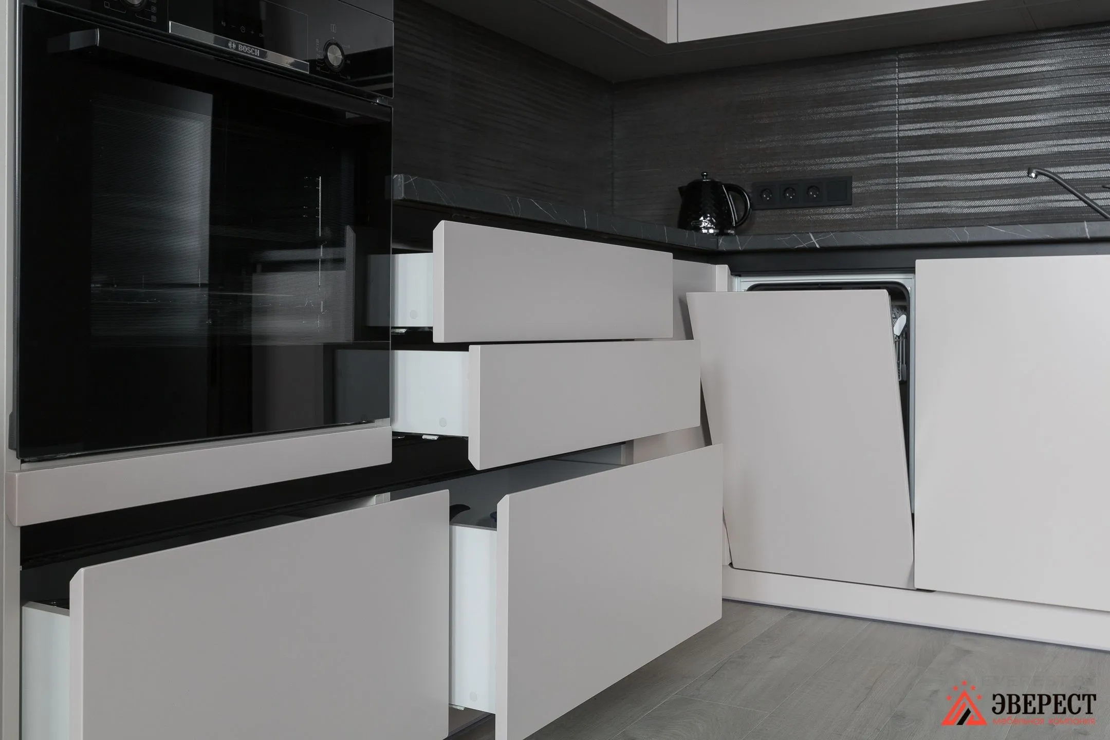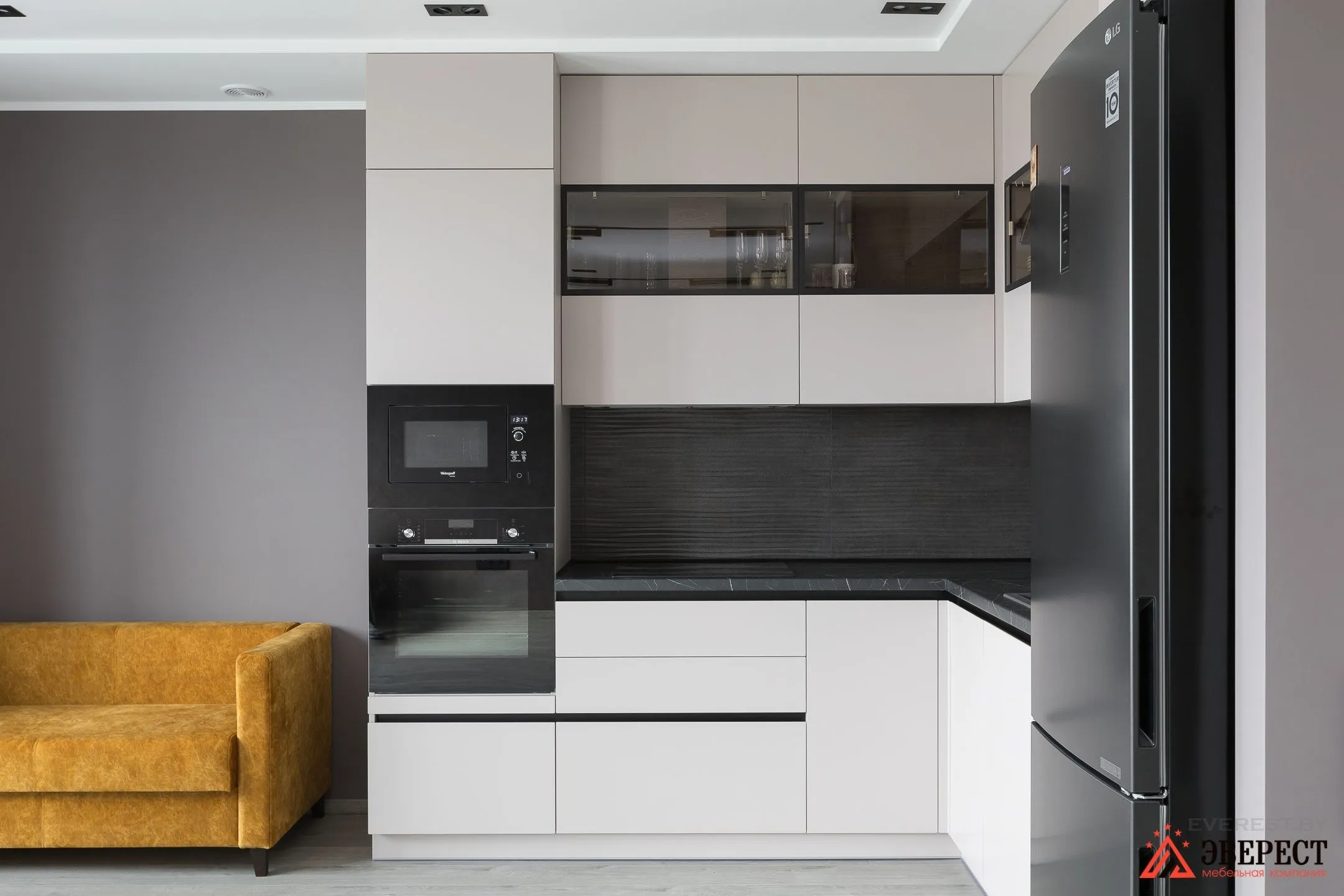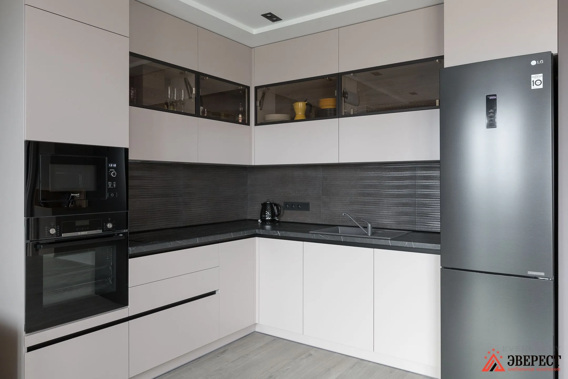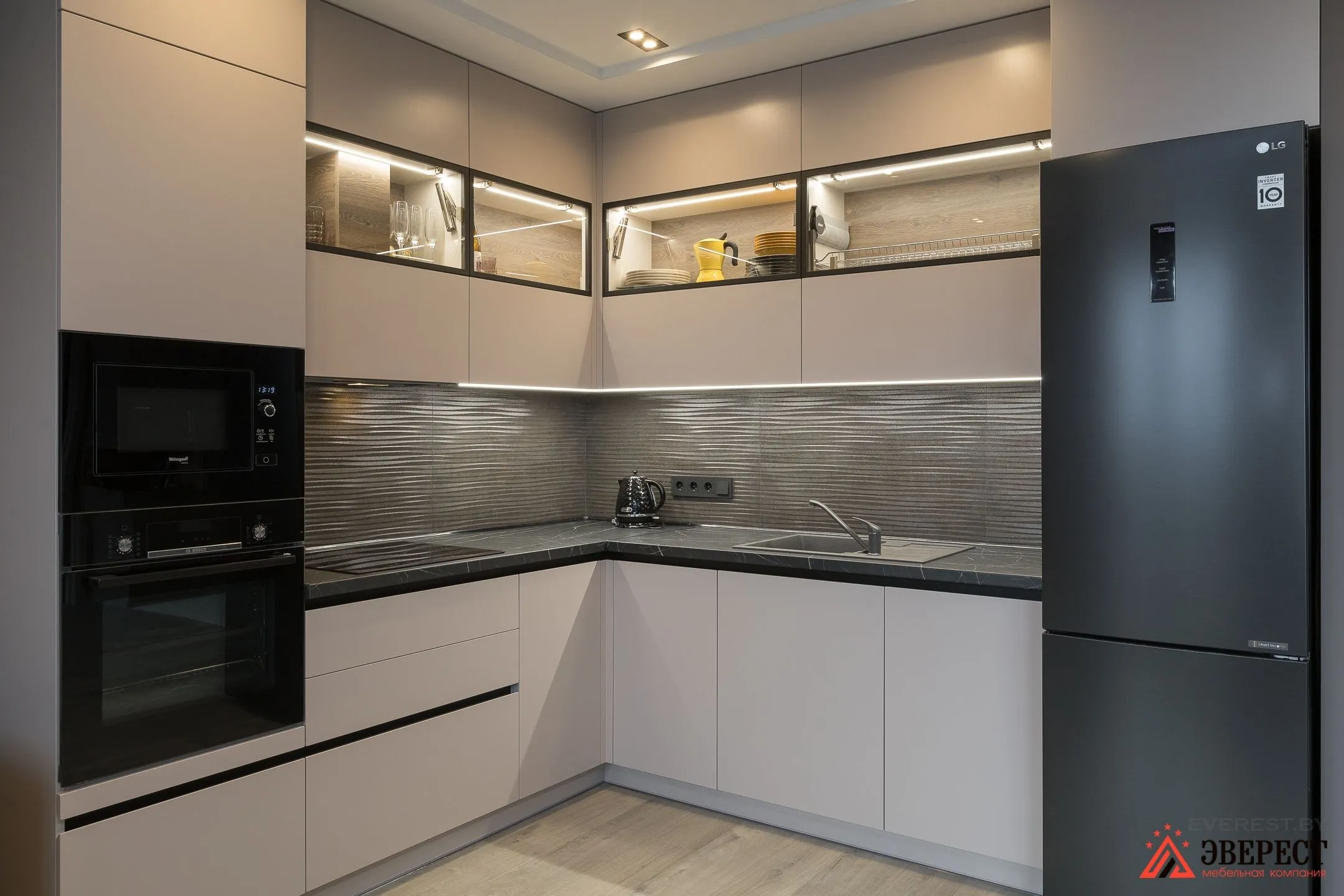 Угловая кухня с витринами, фасады крашеный МДФ Овион мат NCS S 2005-Y80R.