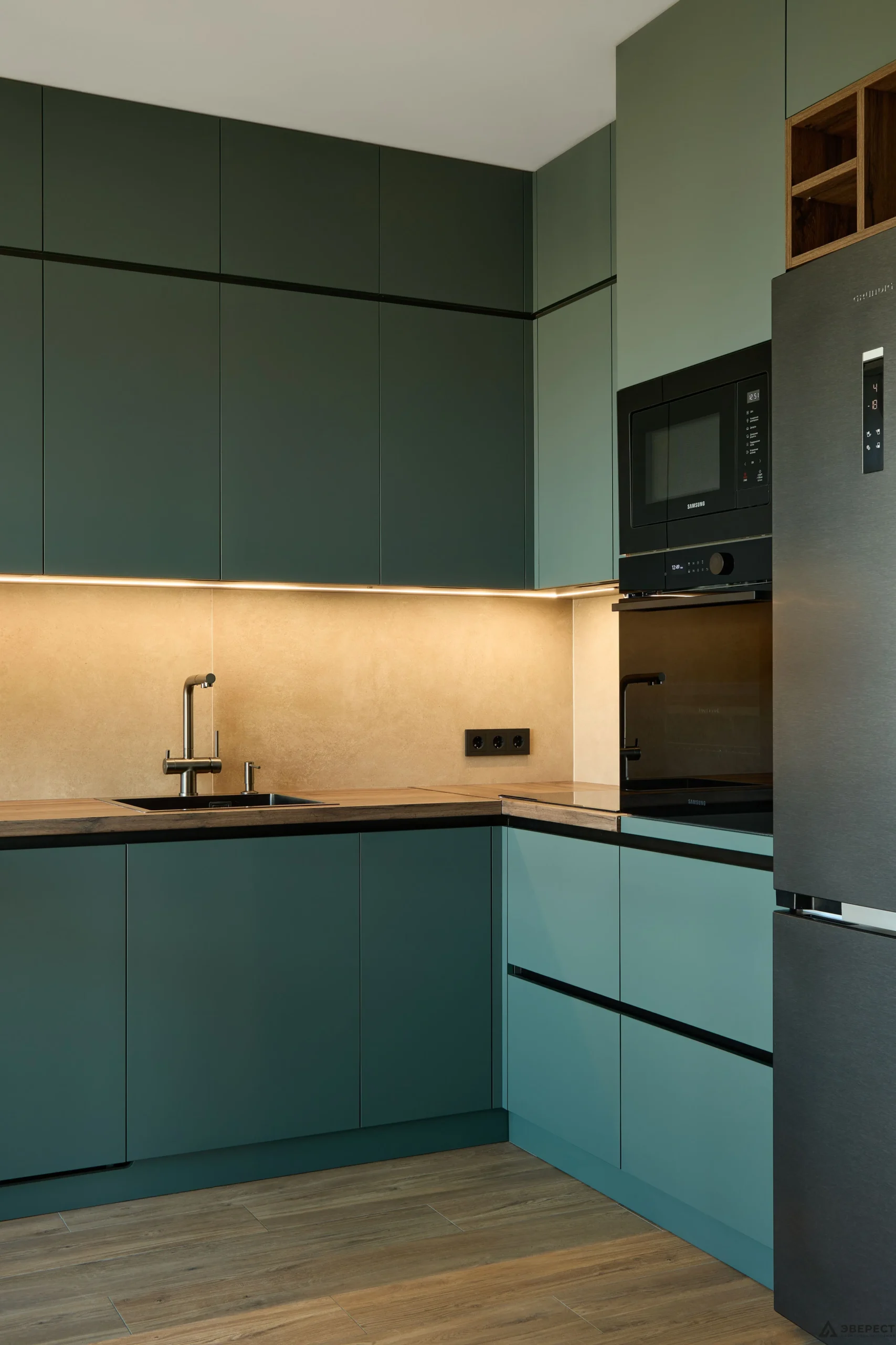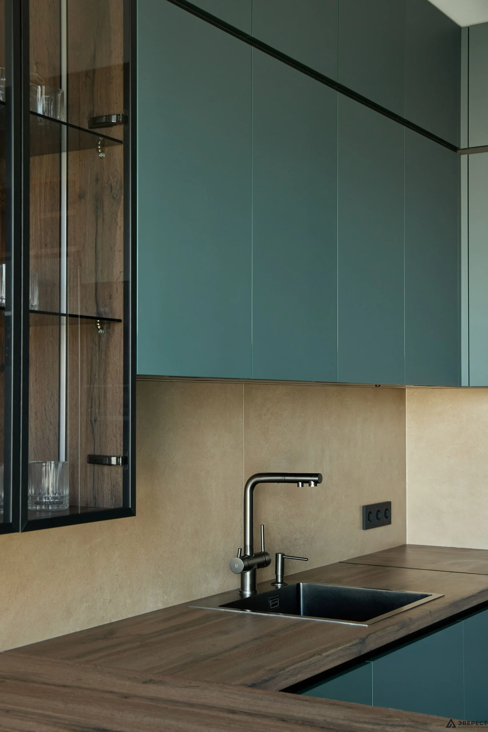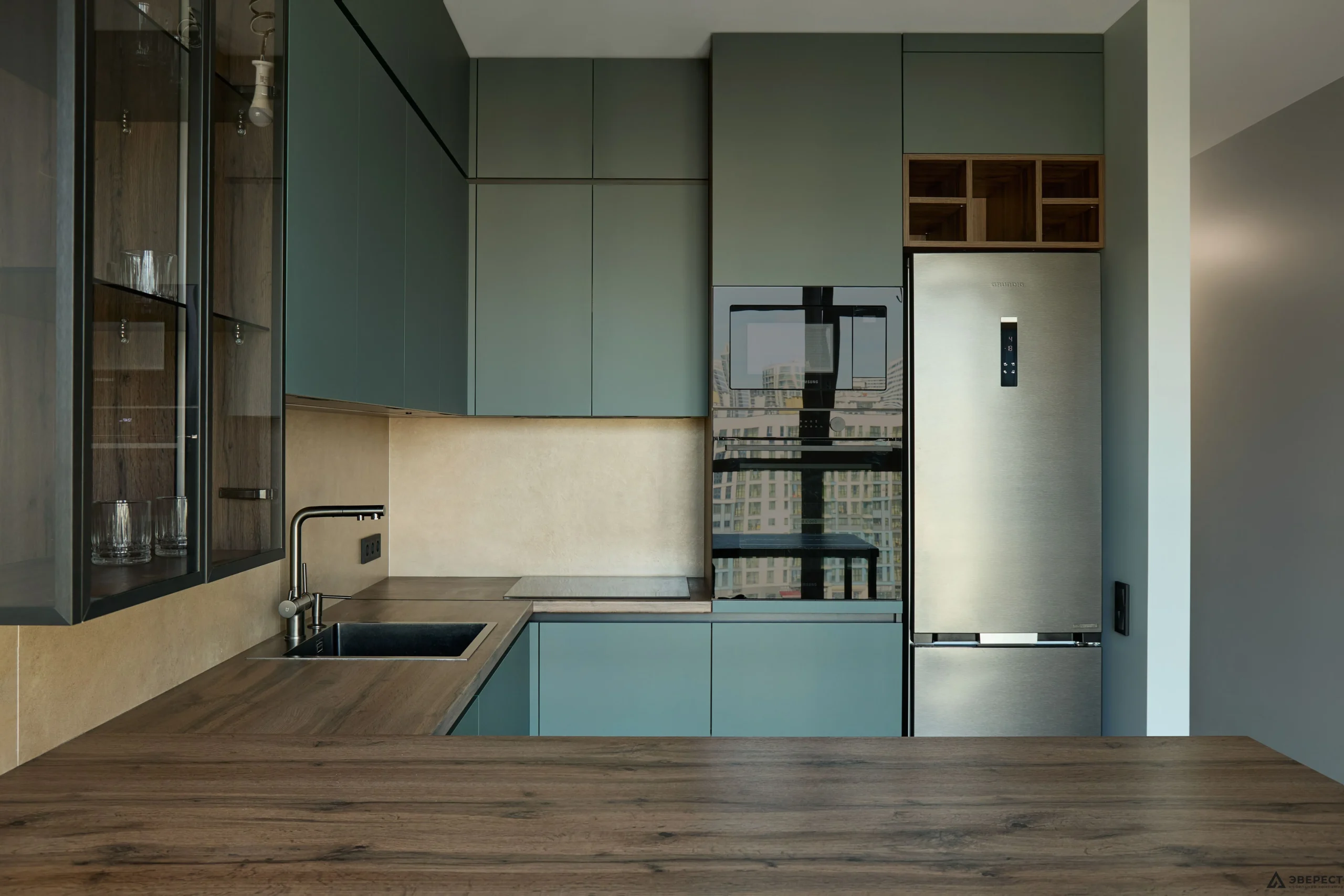 Основной тон задают фасады — сдержанный, глубокий и благородный цвет. Их матовая, тактильно приятная поверхность создает спокойный фон. Этот лаконизм мастерски оттеняет выразительная древесная эстетика.