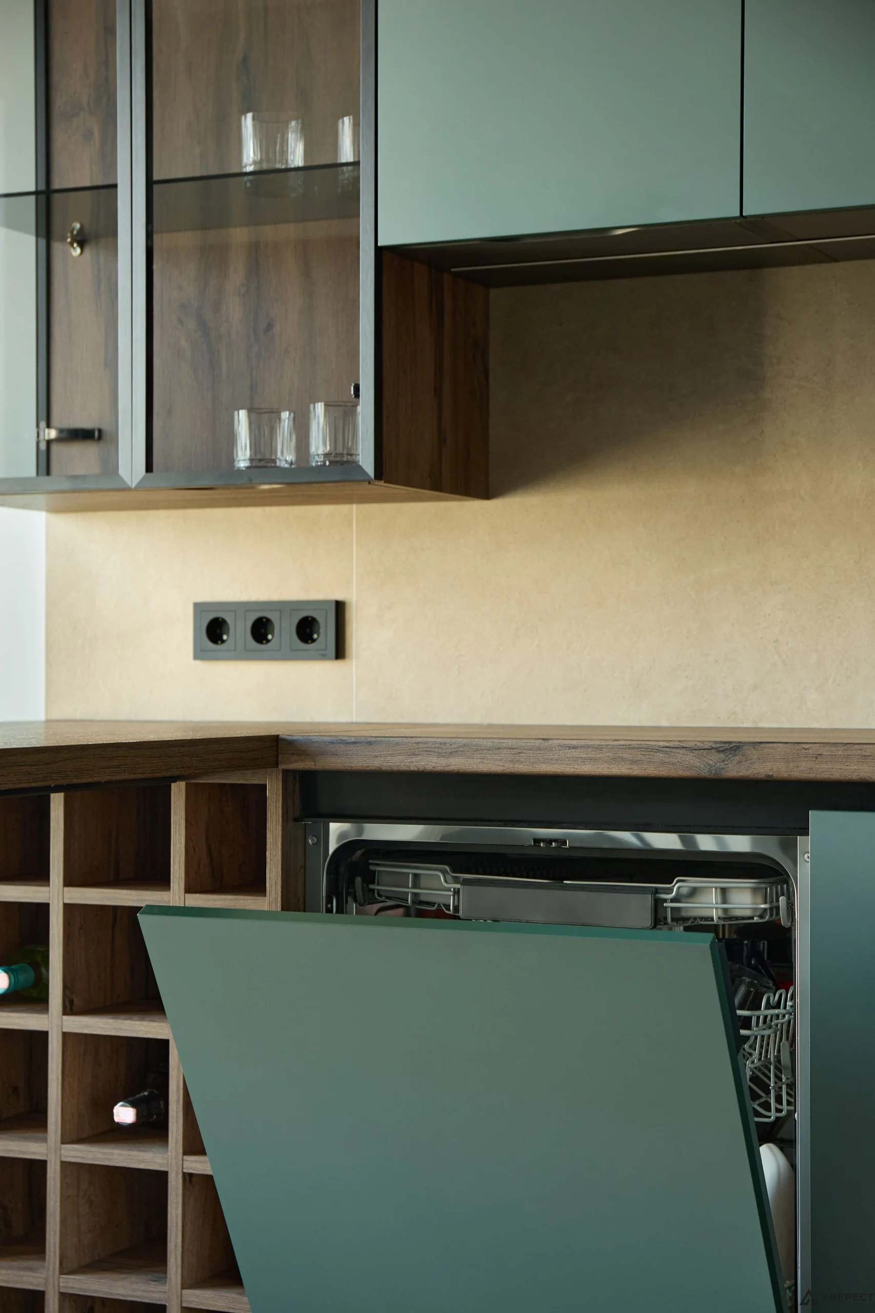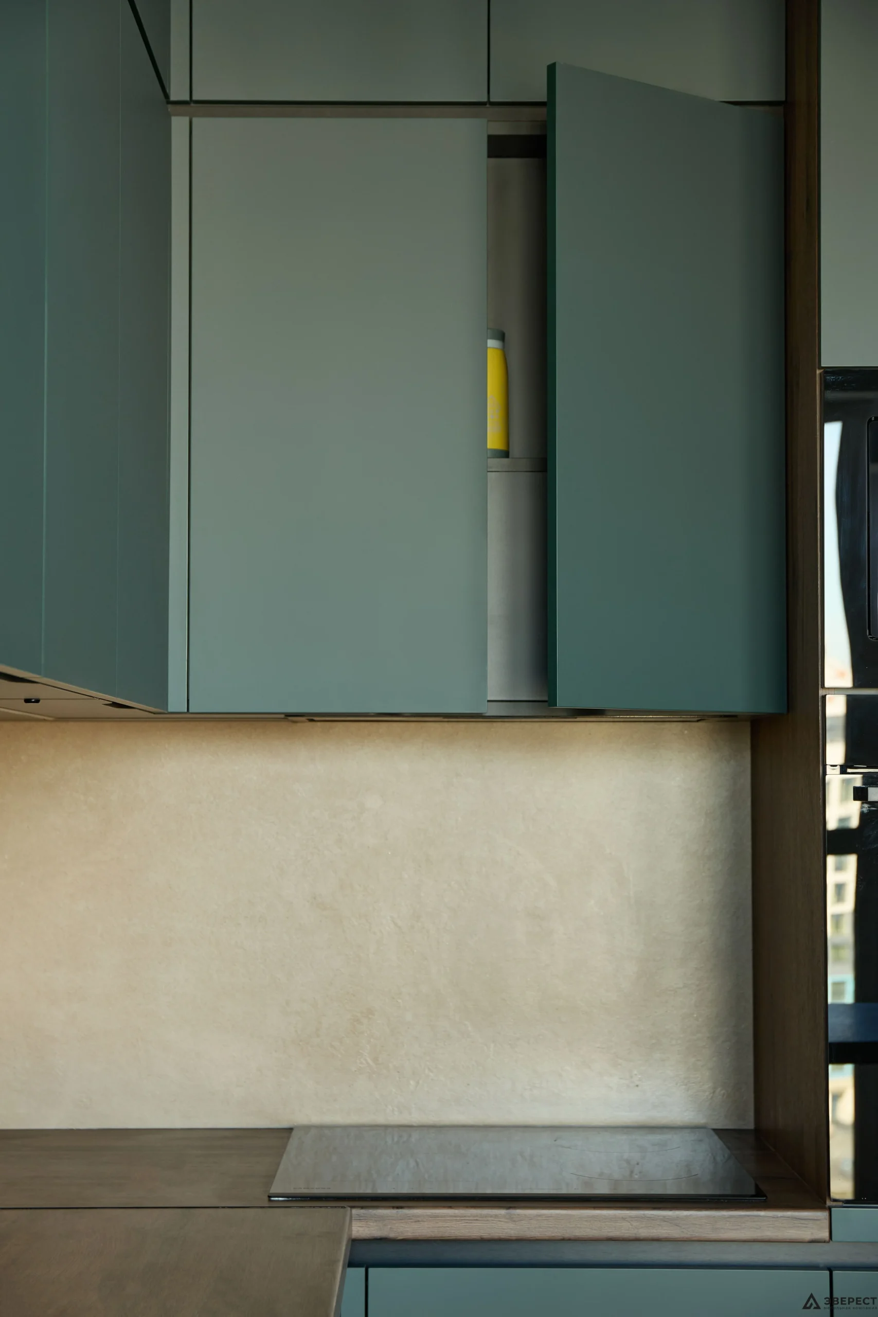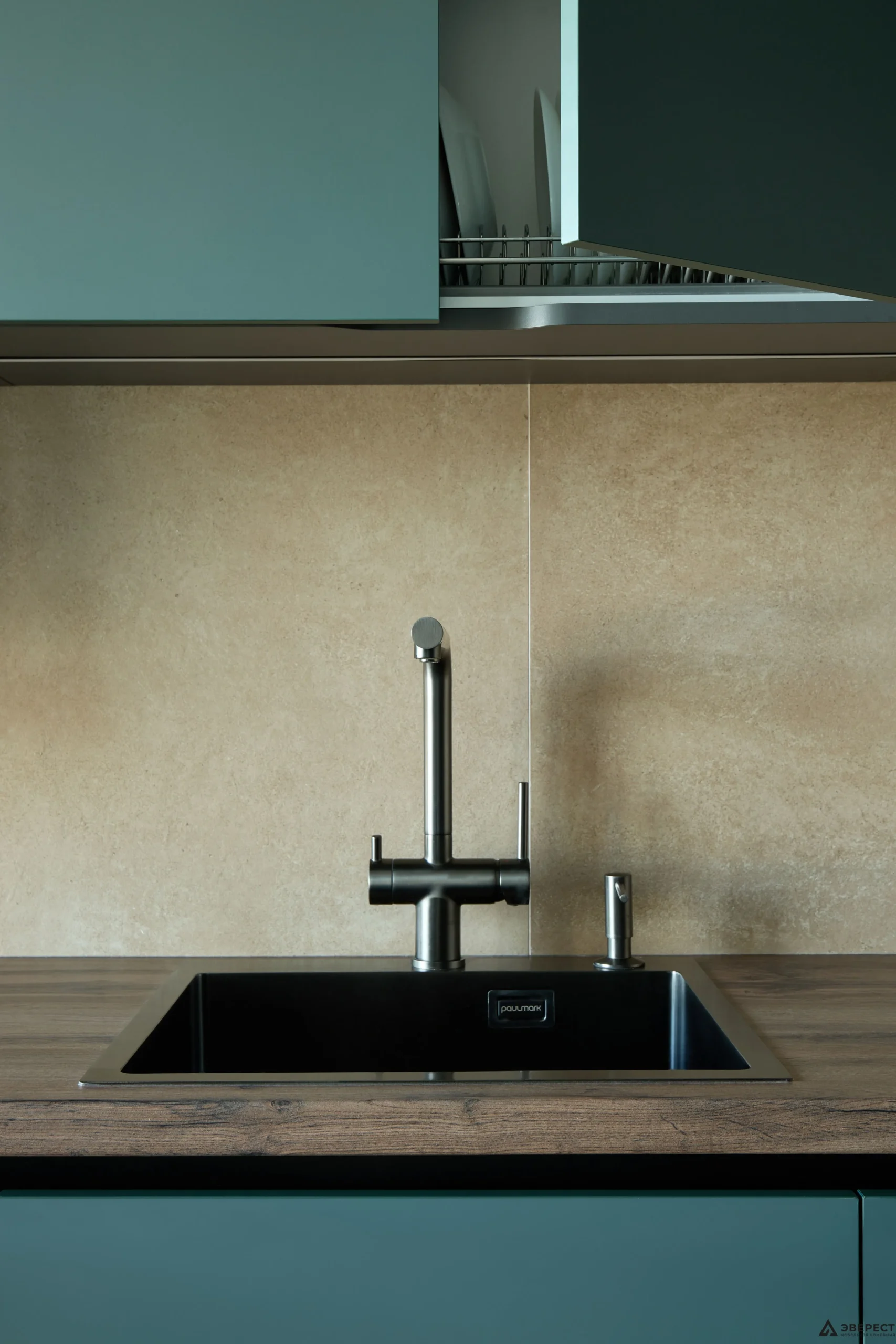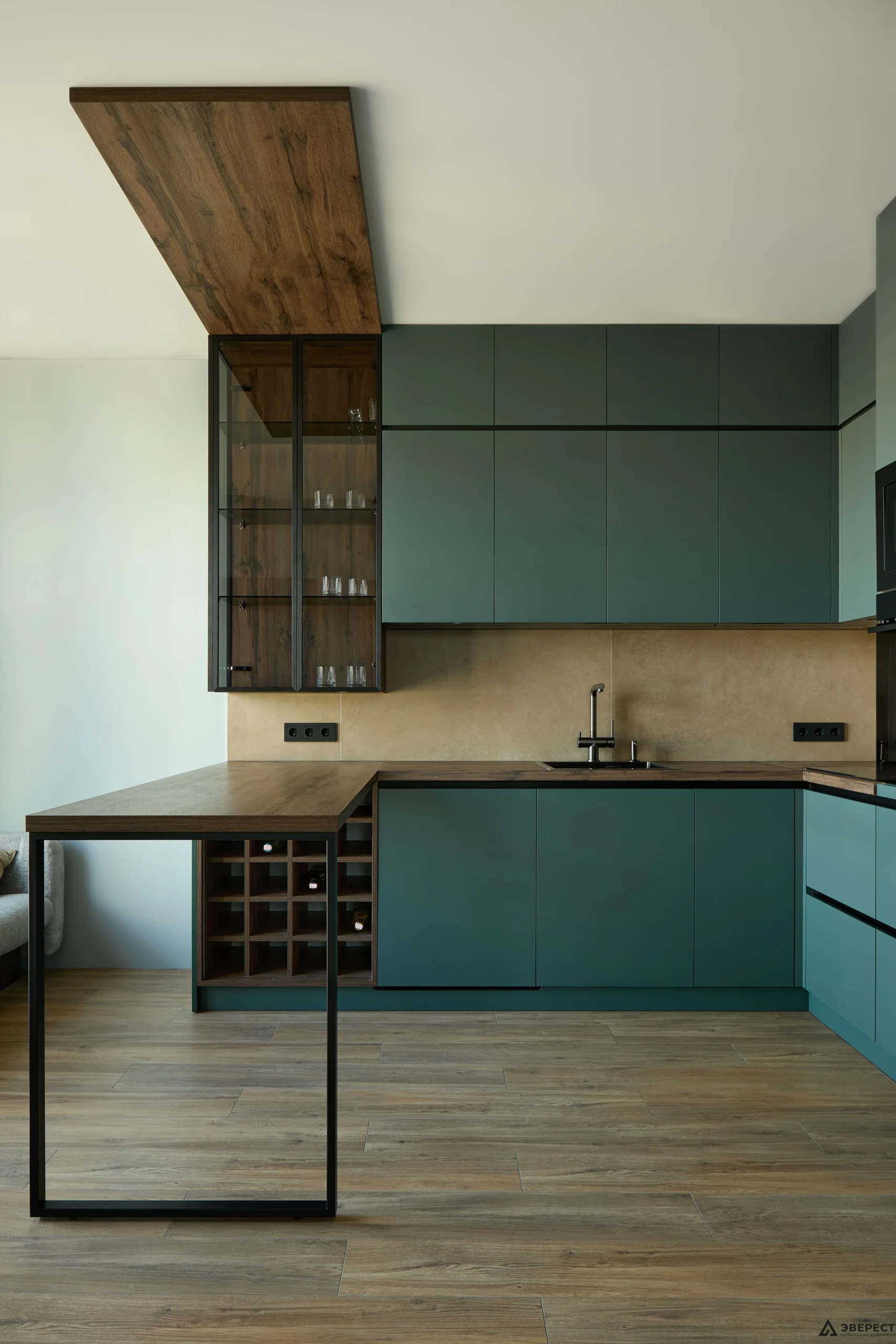 Основной тон задают фасады — сдержанный, глубокий и благородный цвет. Их матовая, тактильно приятная поверхность создает спокойный фон. Этот лаконизм мастерски оттеняет выразительная древесная эстетика.