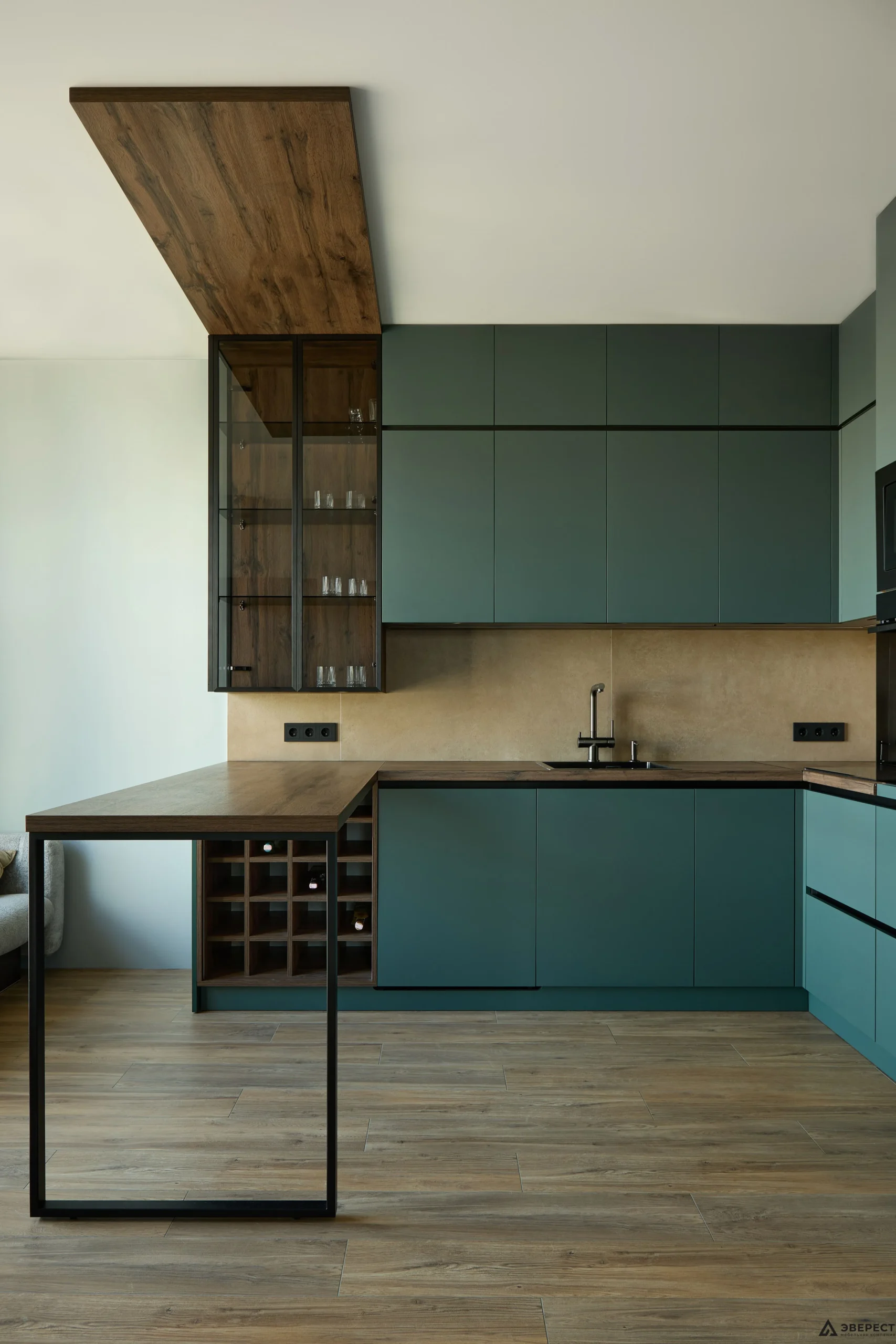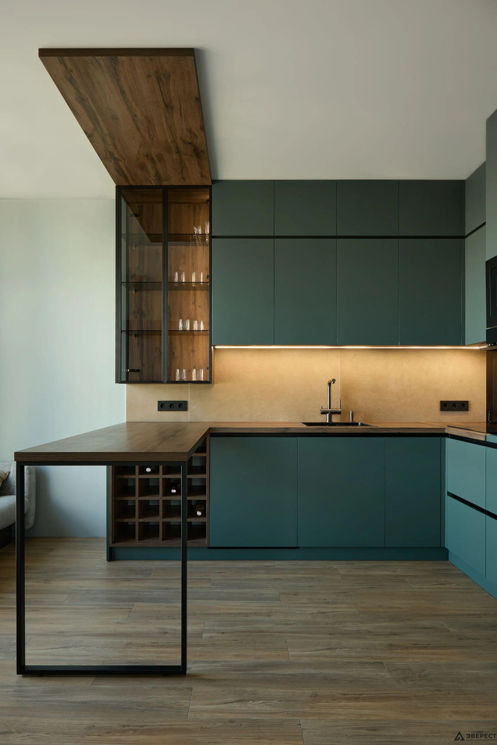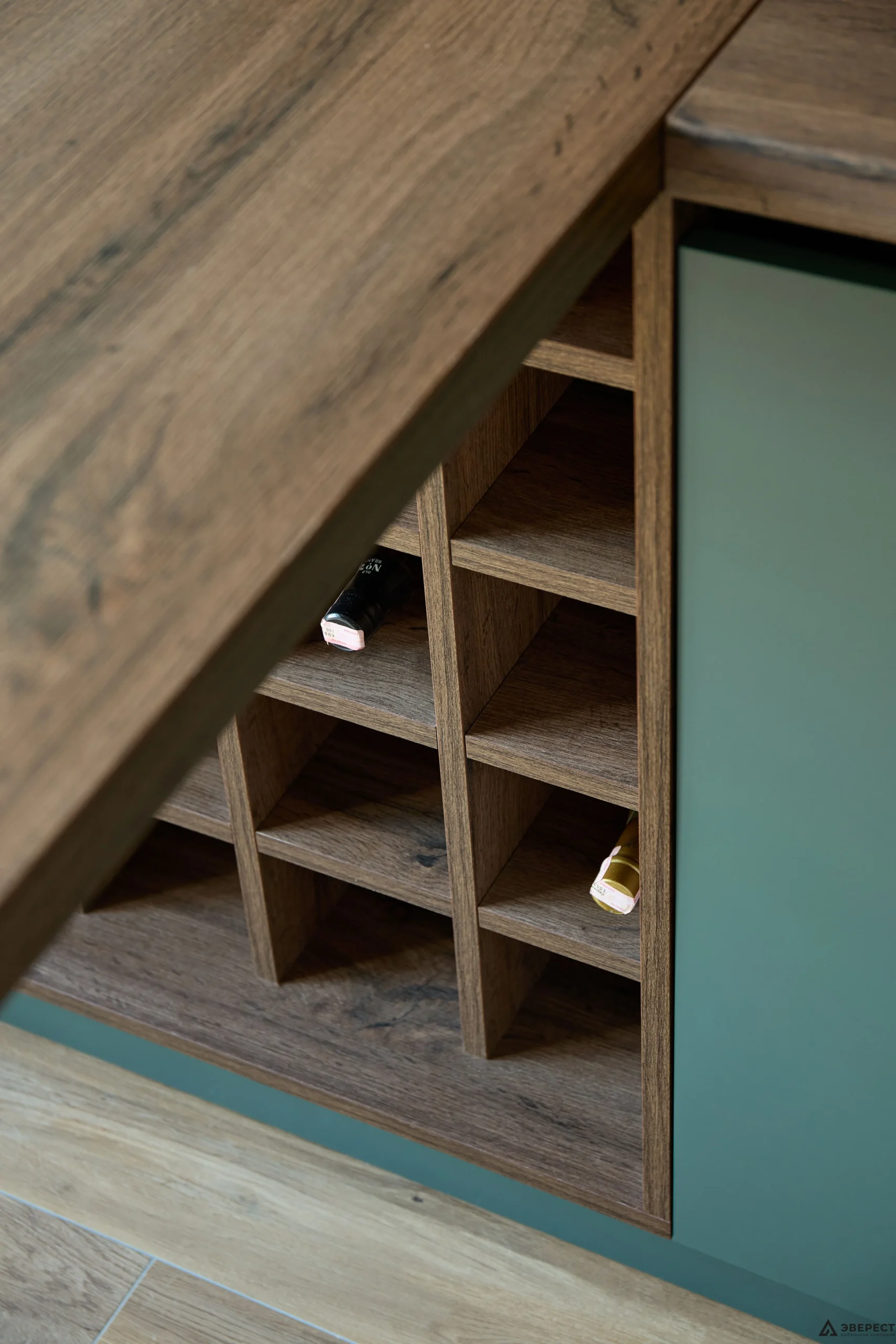 Особую атмосферу создает скрытая фрезерованная подсветка в бутылочнице под барной стойкой.