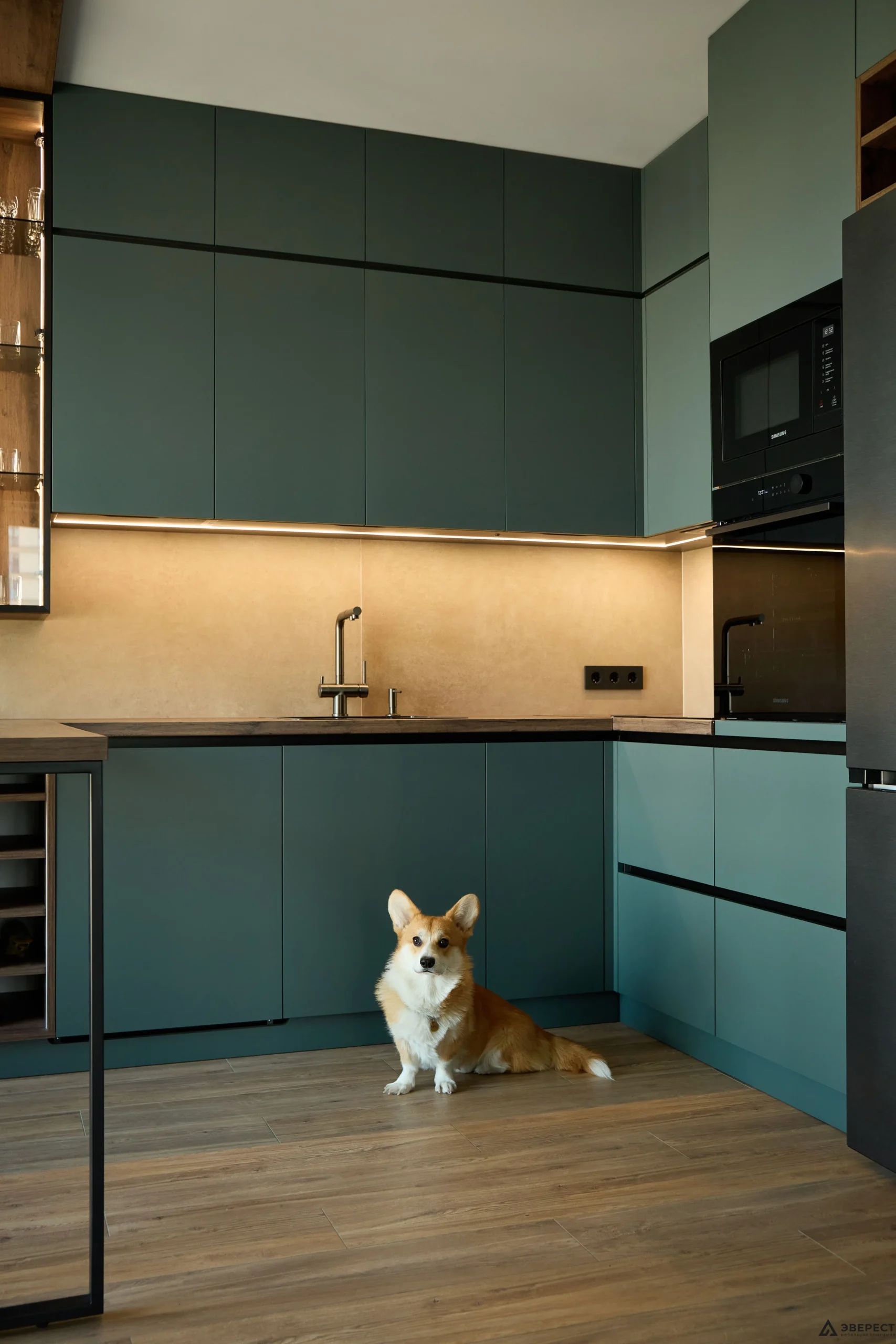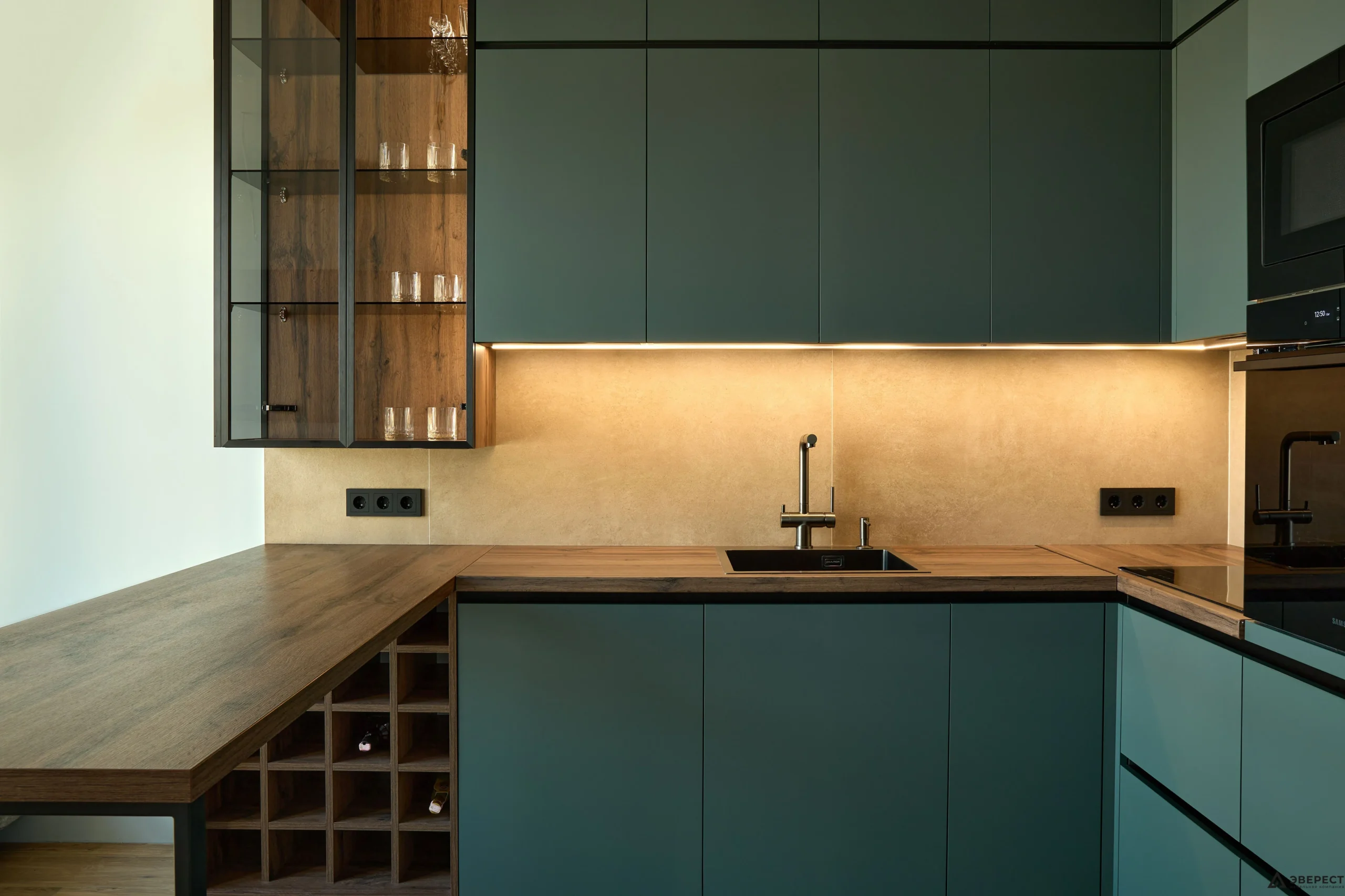 С наступлением сумерек кухня преображается, раскрывая свою вторую суть. Встроенная нейтральная подсветка с сенсорным управлением заливает столешницу идеальным для работы светом, а витрины начинают мягко светиться изнутри, превращаясь в экспозиционные ниши.
