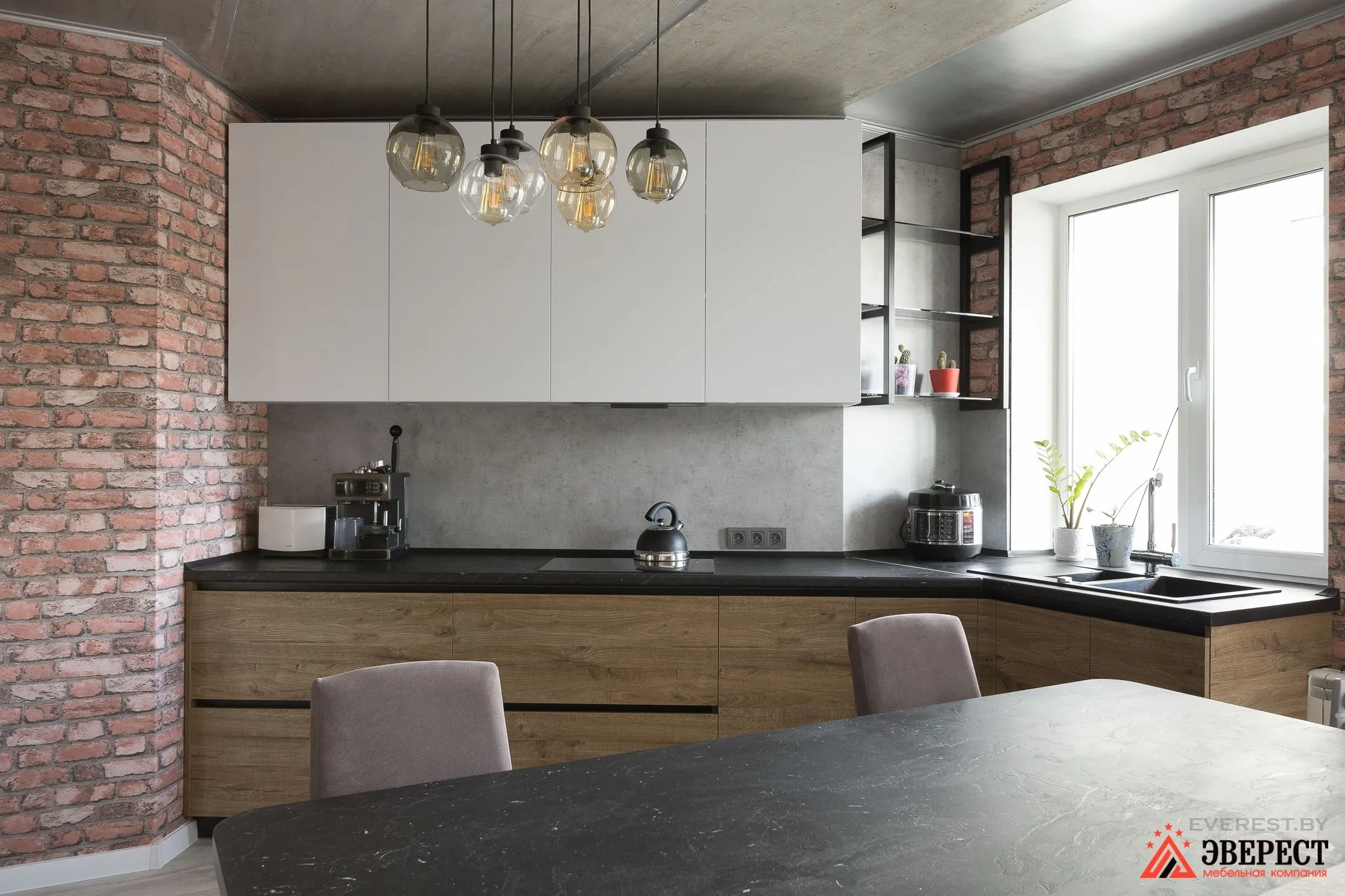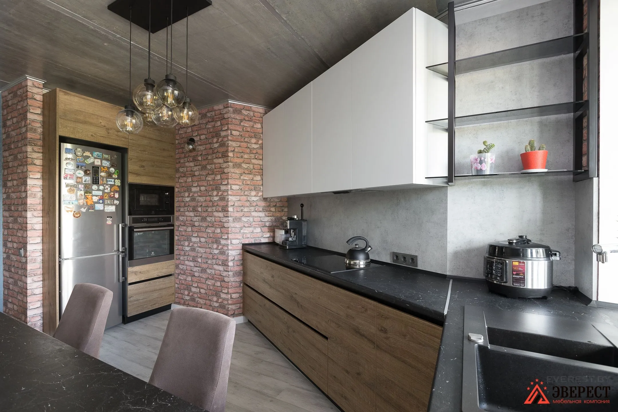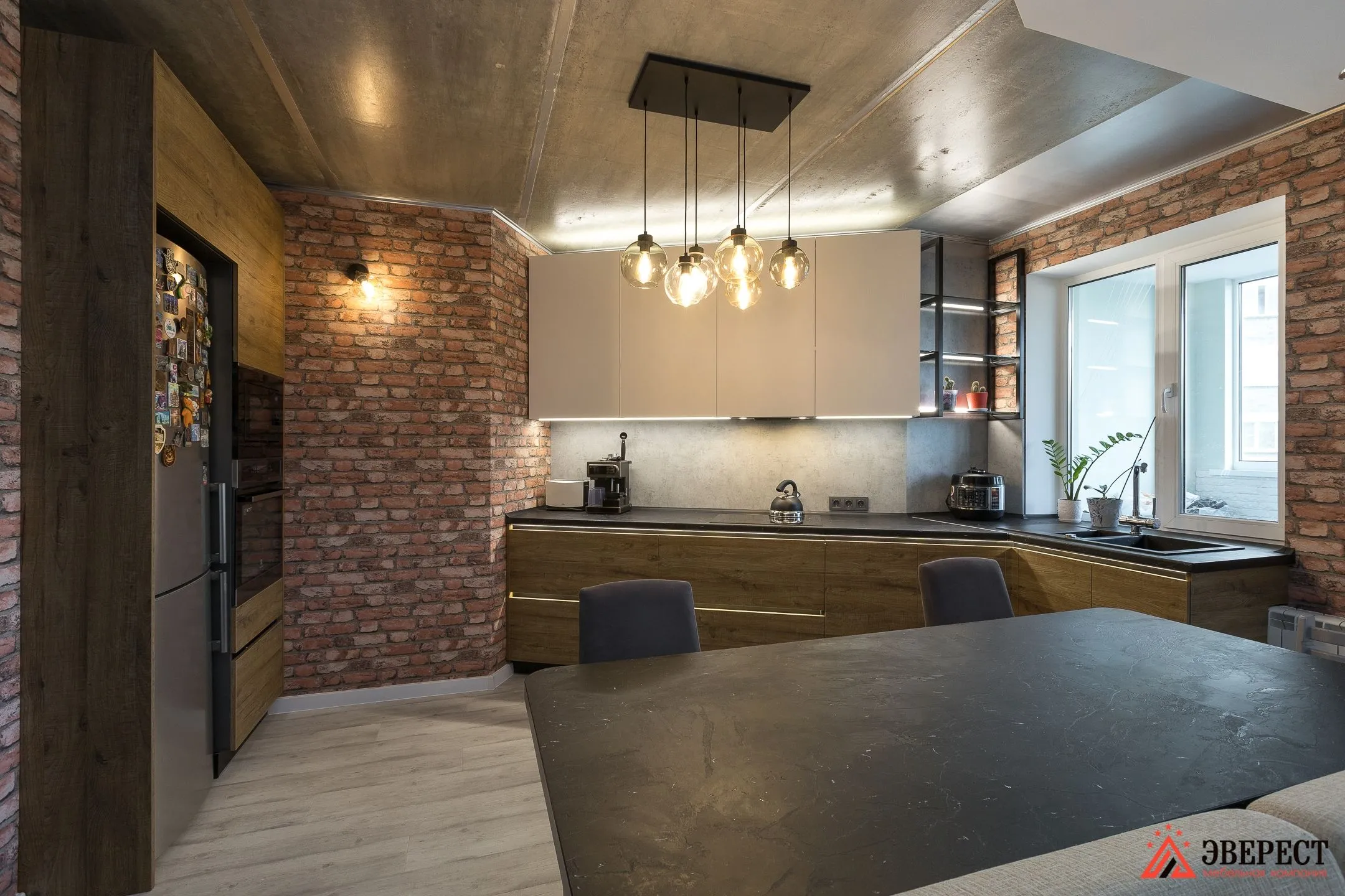 Можно заметить, как кирпичная кладка задает общий тон помещению. Деревянные фасады кухни — это первое, что приходит на ум.