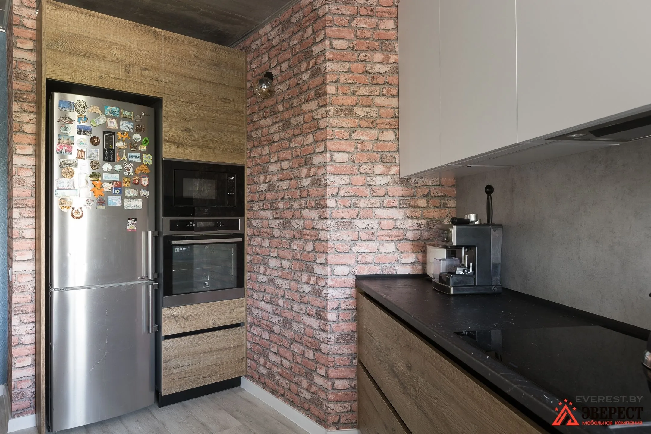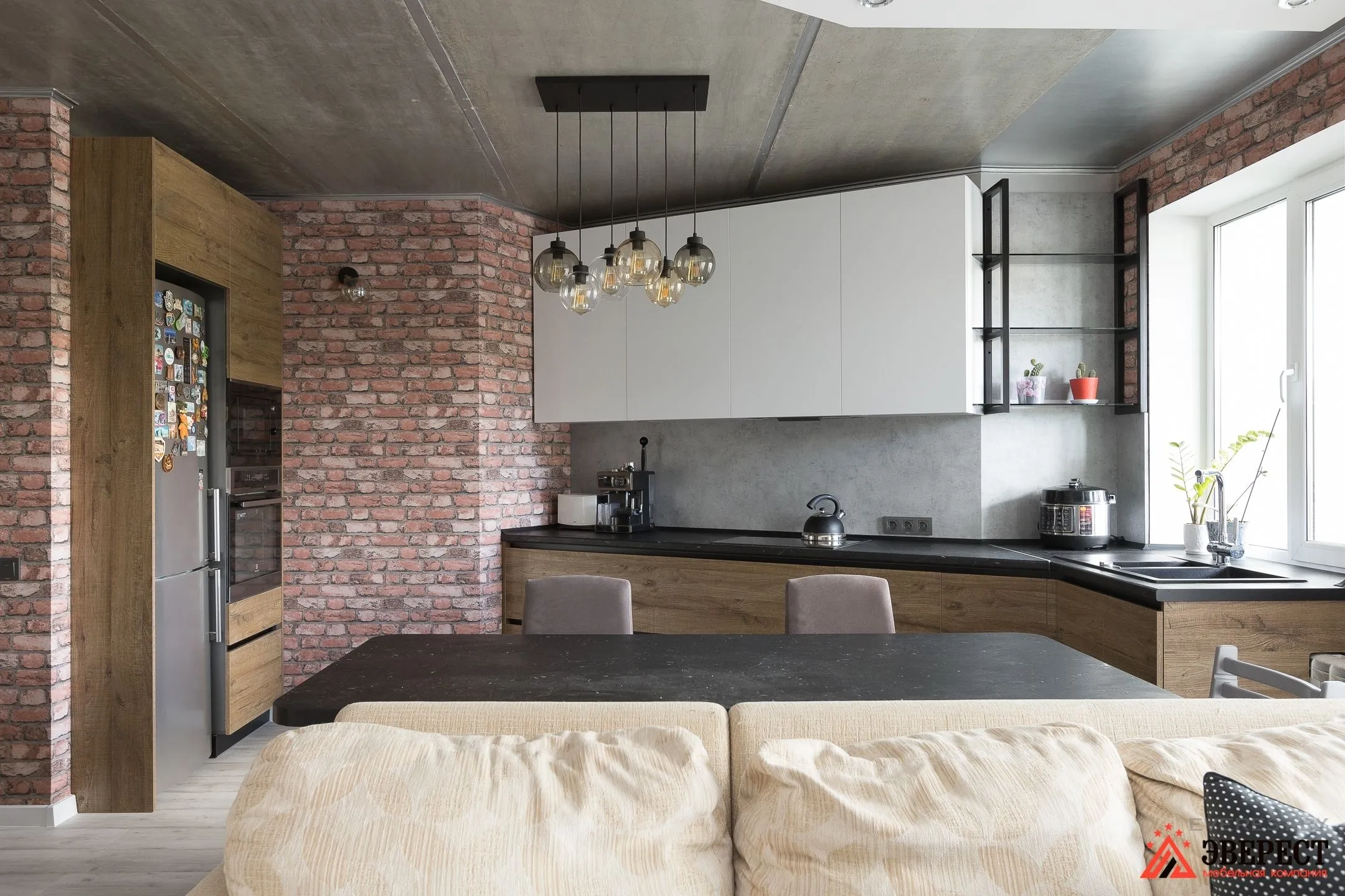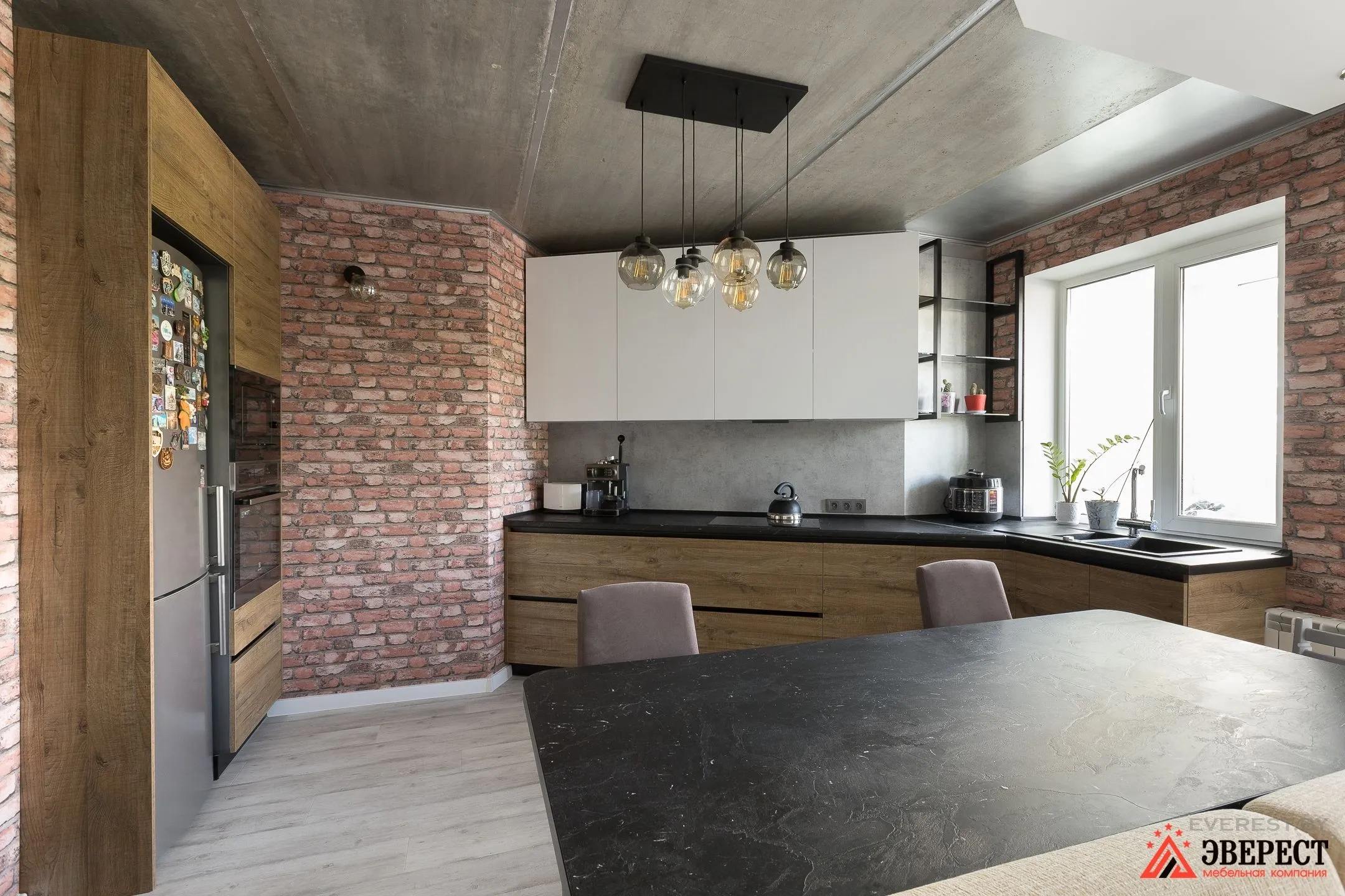 Можно заметить, как кирпичная кладка задает общий тон помещению. Деревянные фасады кухни — это первое, что приходит на ум.