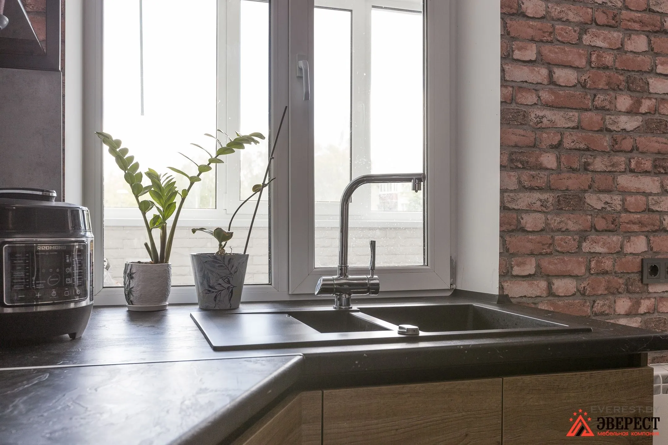 Нижние шкафы дизайнер решил поднять до 91 см от пола до уровня подоконника. Так у нас получилась целостная картинка без зазоров, стыков и прочей лишней мелочи.