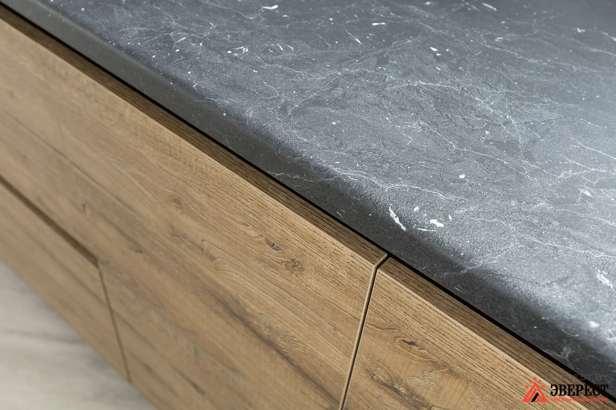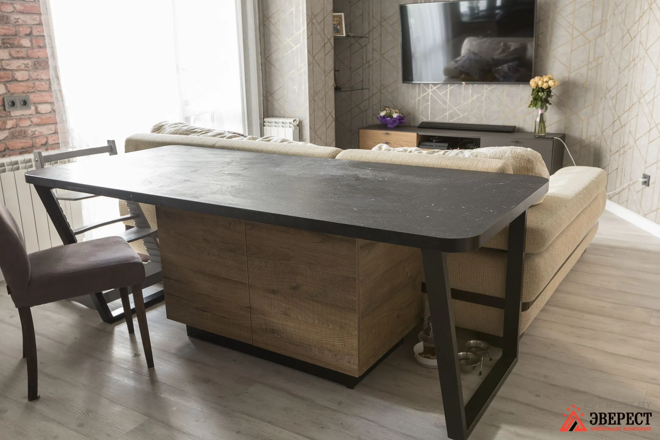 Планировка помещения изначально сложная. Поэтому нашей задачей было не только сделать красиво, но и продумать размещение всех элементов. Поэтому угол в столешнице дизайнер задал 149 градусов. И мы считаем, что так он прекрасно подчеркнул уникальность помещения.