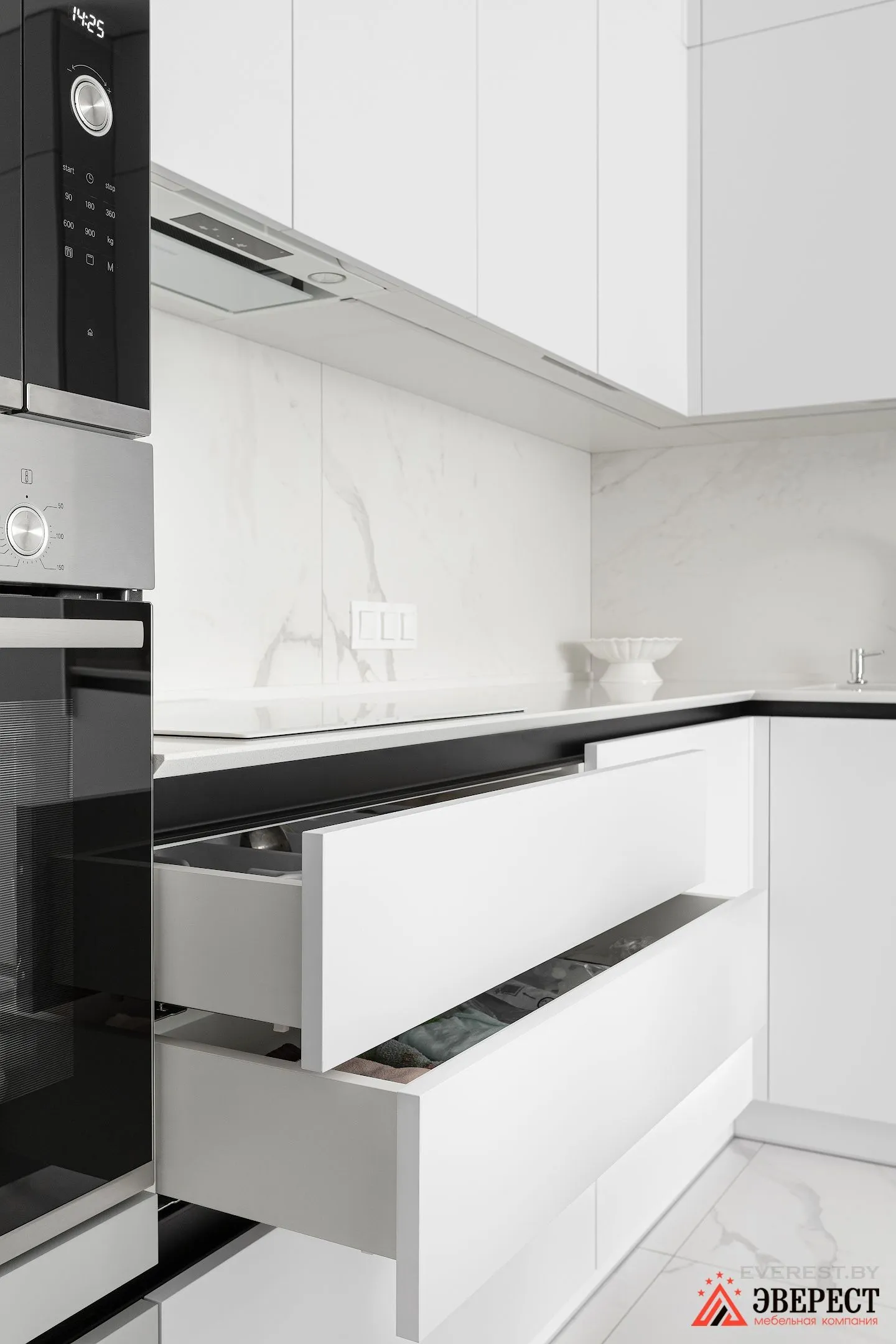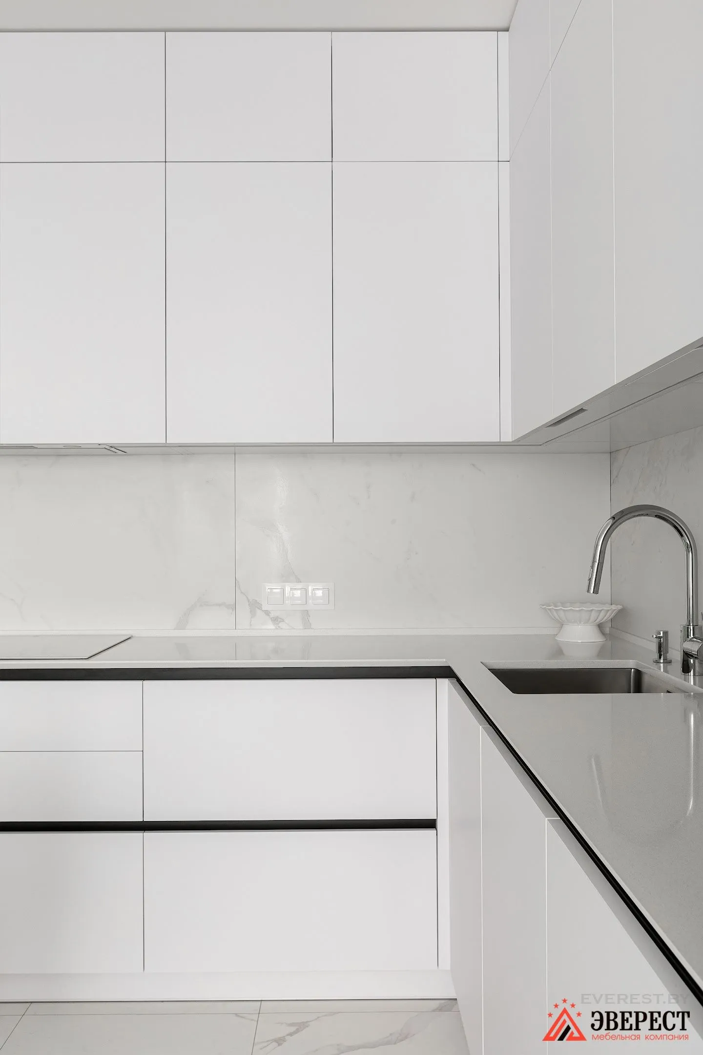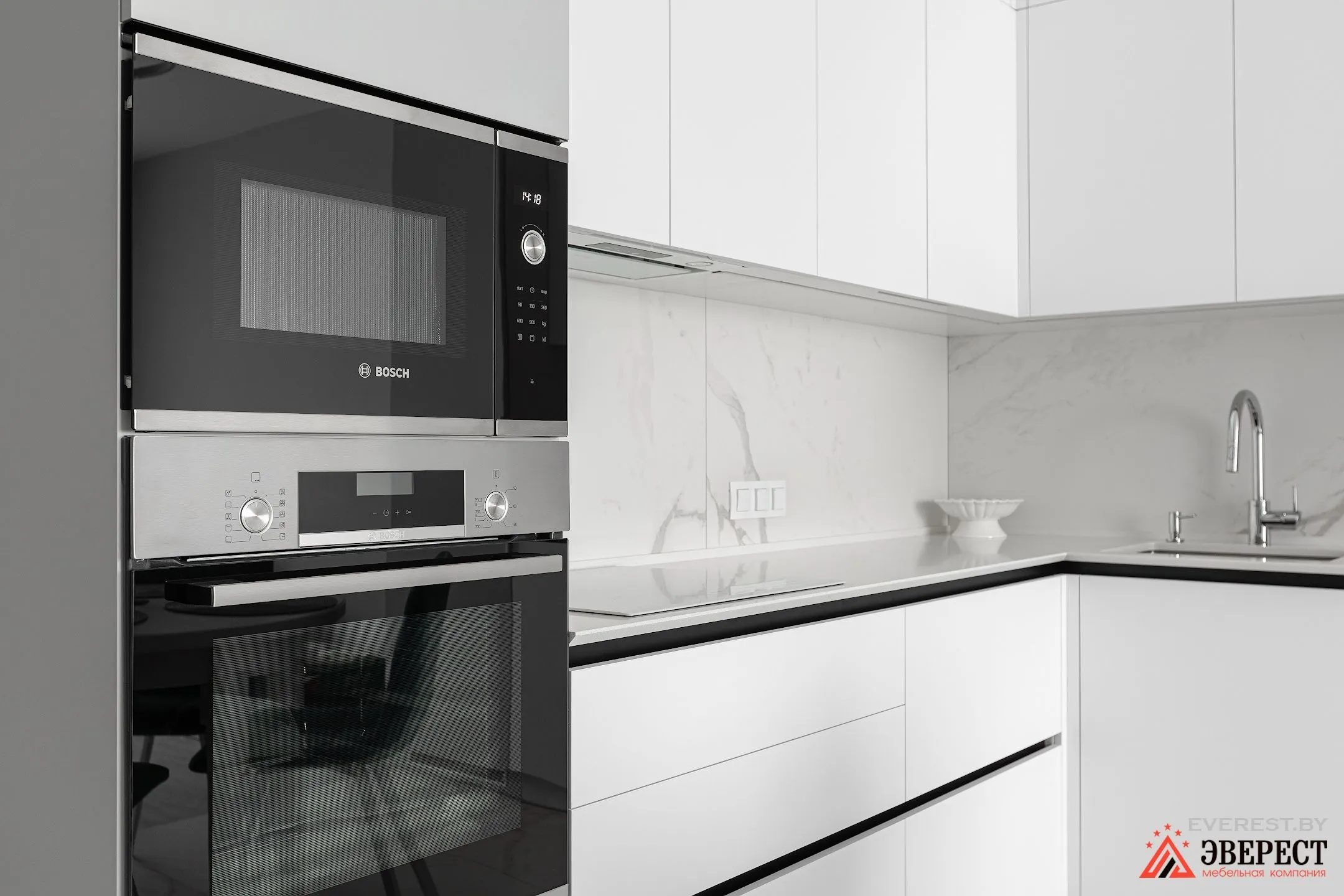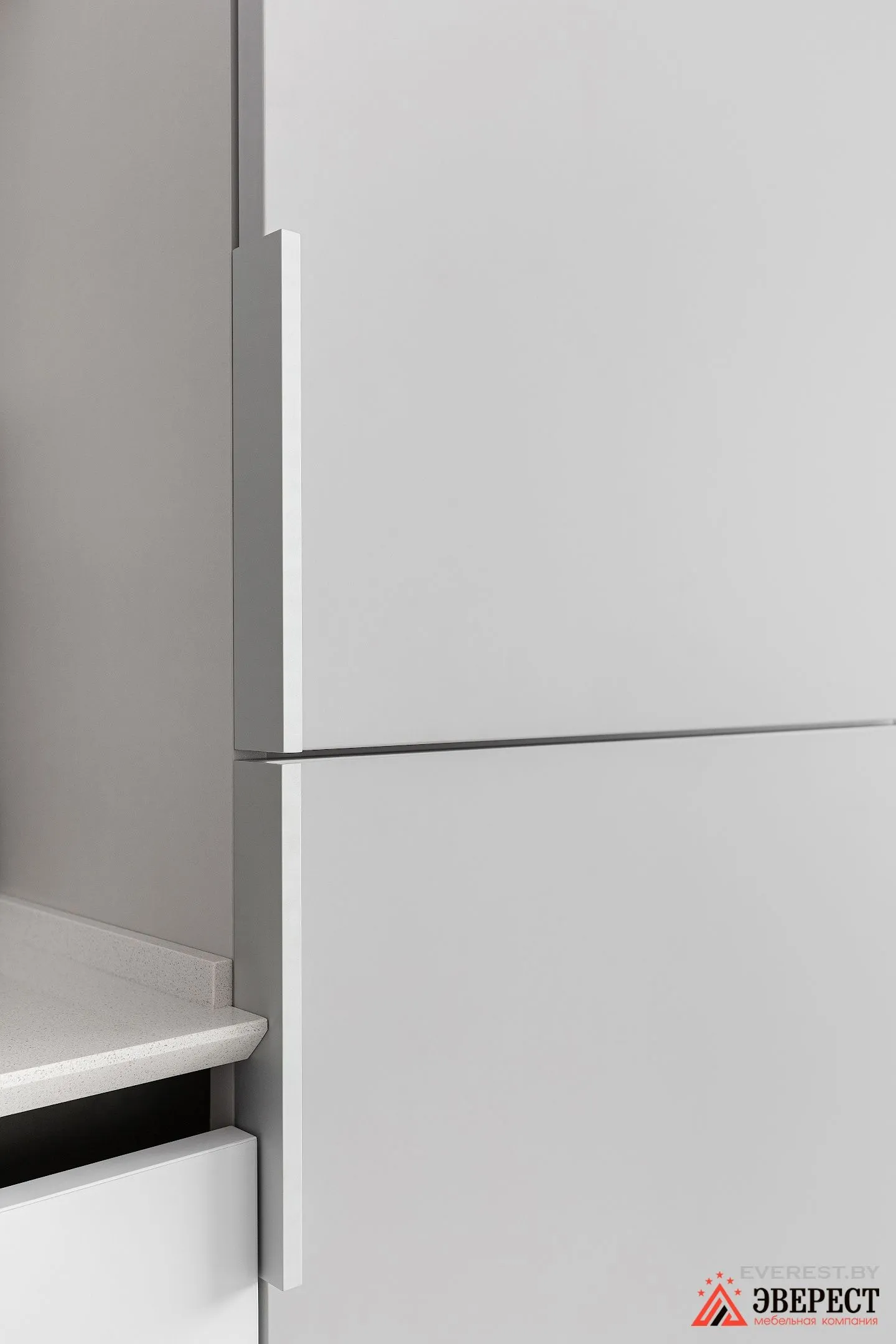 Фасады выполнены из Материала Fenix в 2 цветах: Белый 0030 и серый 0725