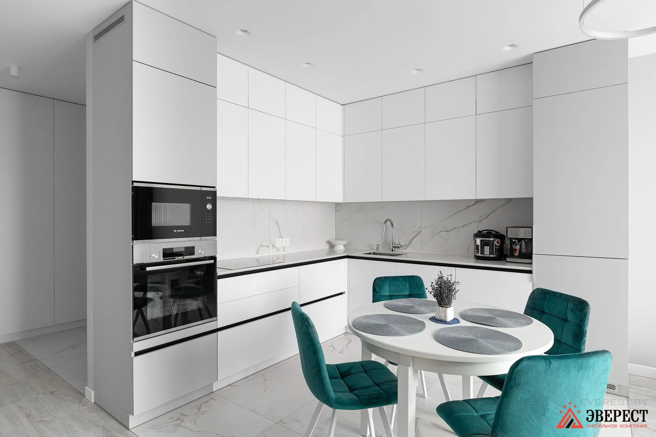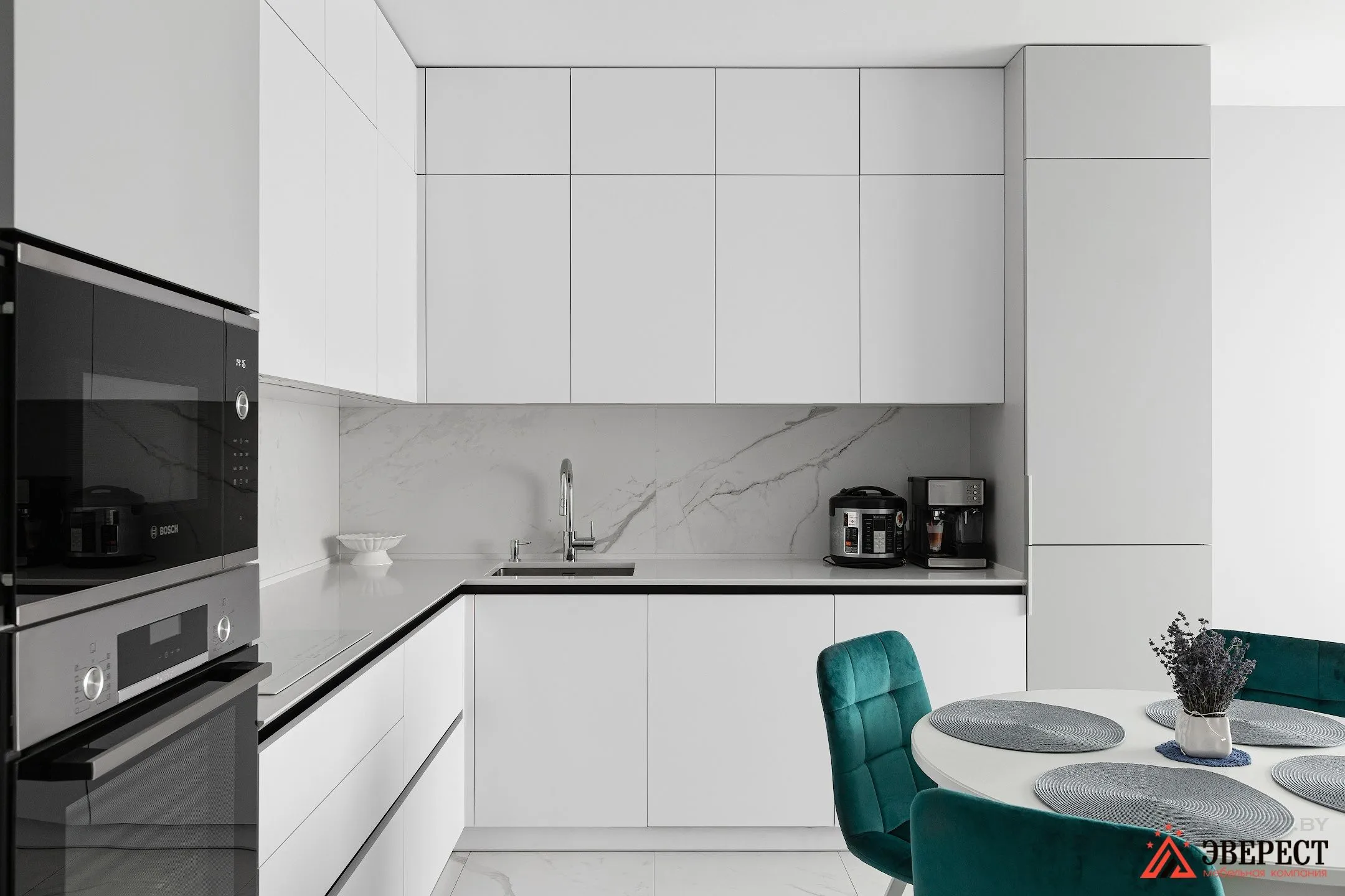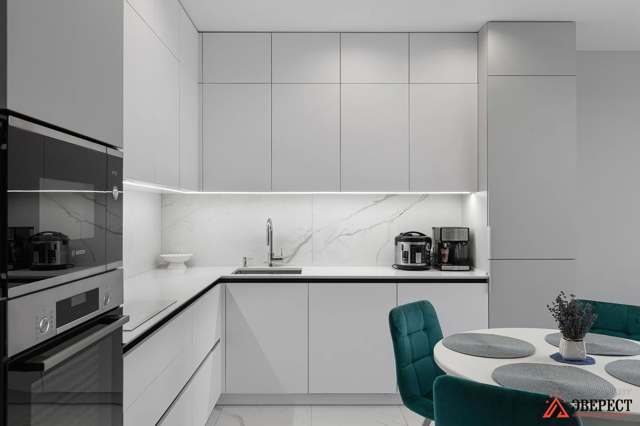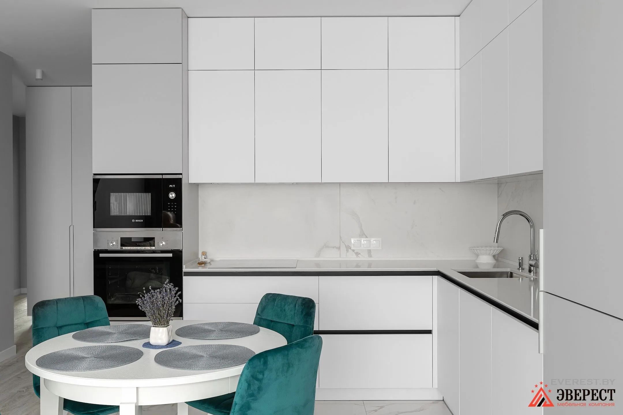 Фасады выполнены из Материала Fenix в 2 цветах: Белый 0030 и серый 0725