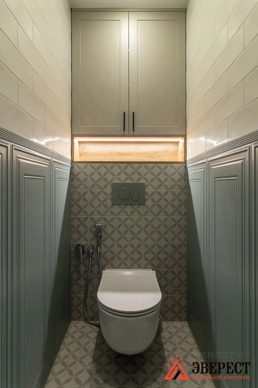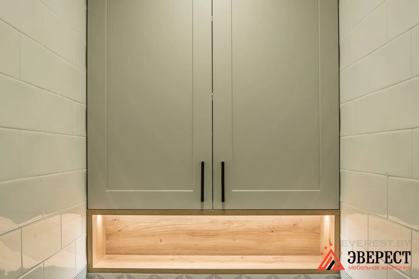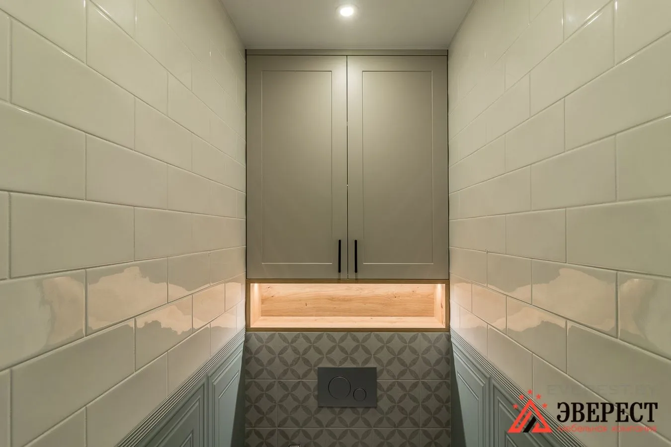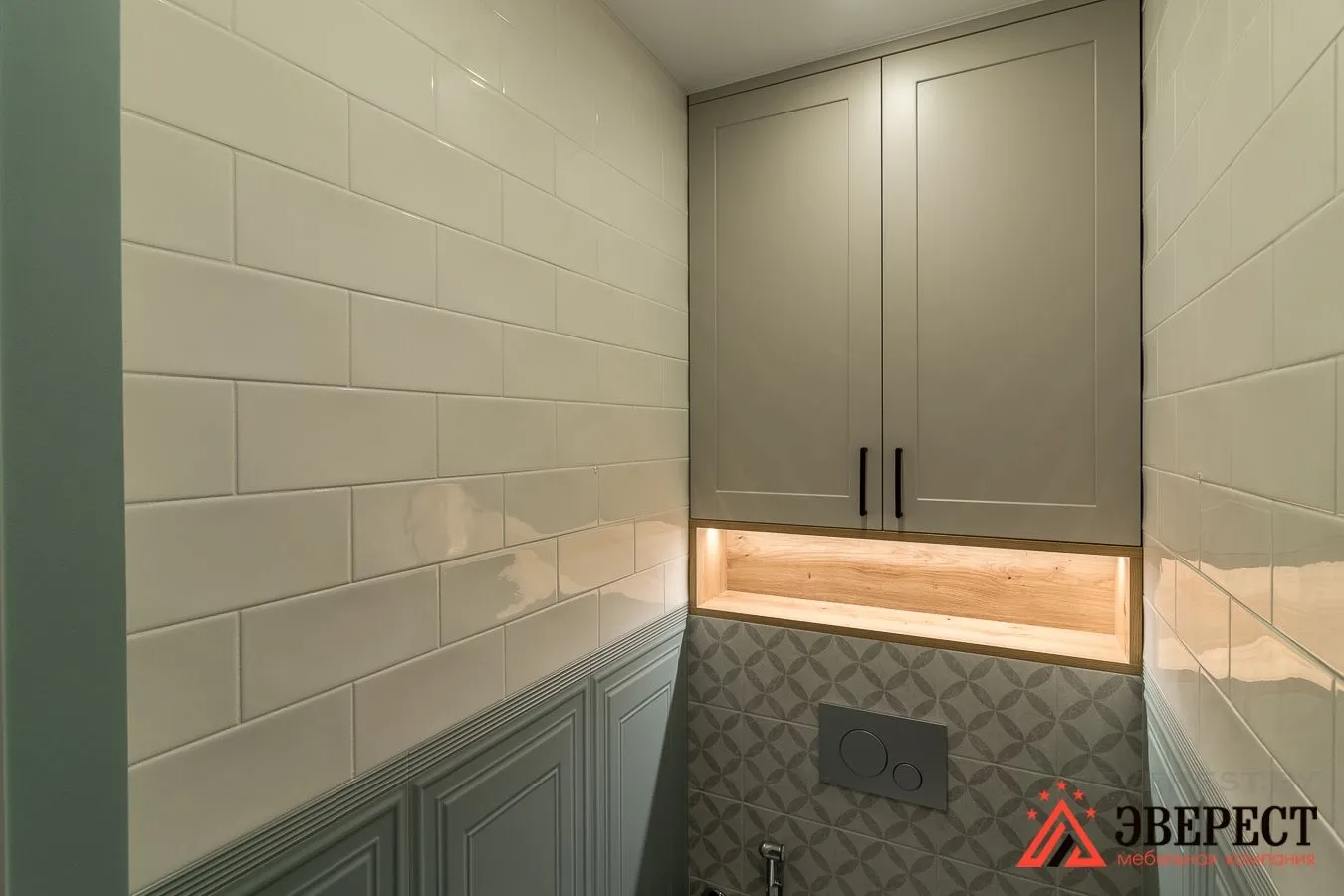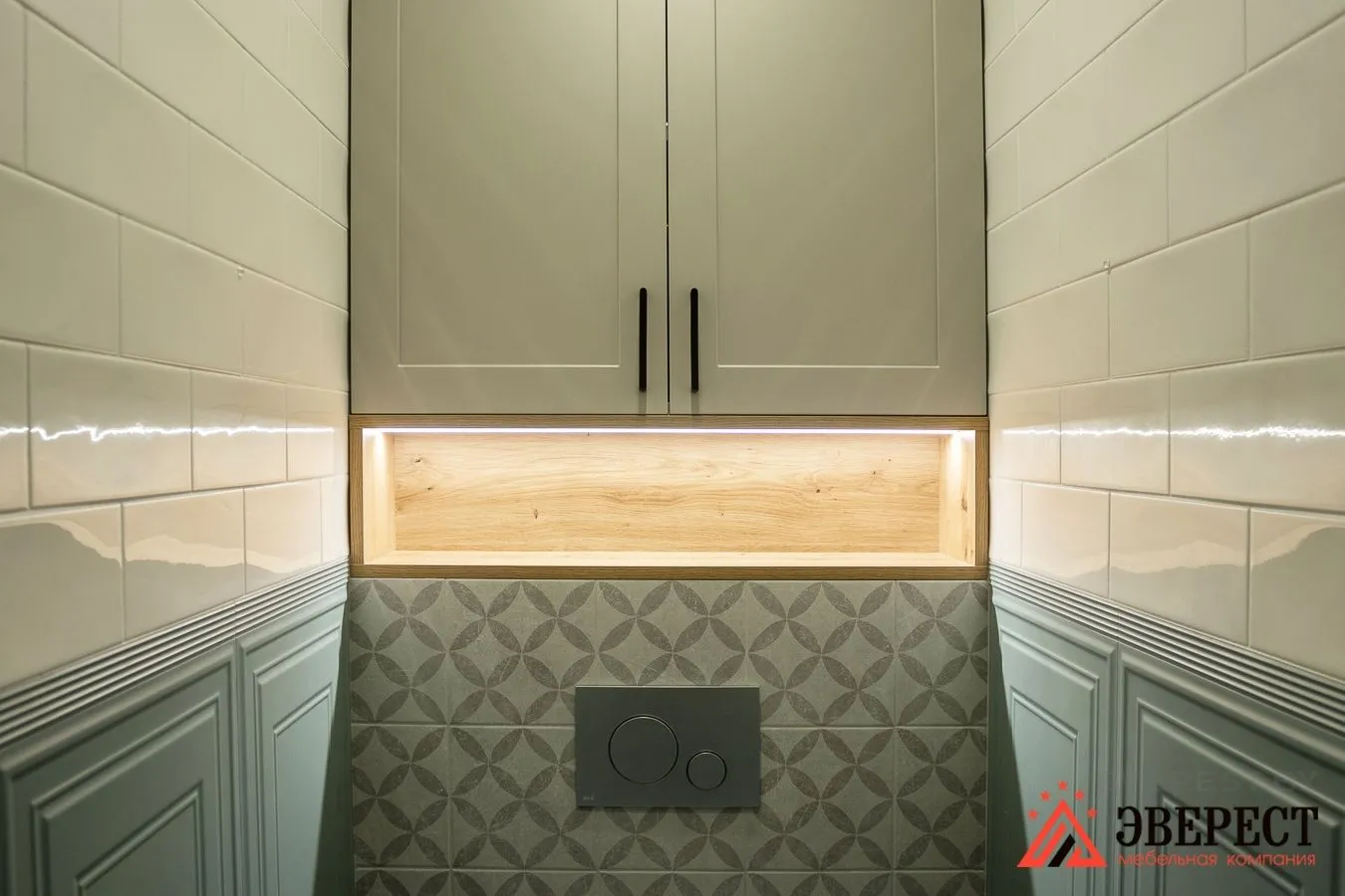 Для нашего заказчика в комплексе с основной покупкой: Кухни и детской, мы также изготовили мебель в сан узел. Скрыли коммуникации за красивыми фасадами из крашеного МДФ с фрезеровкой. В открытую полку из ламинированного дсп Egger цвет дикий дуб, добавили фрезерованную подсветку.