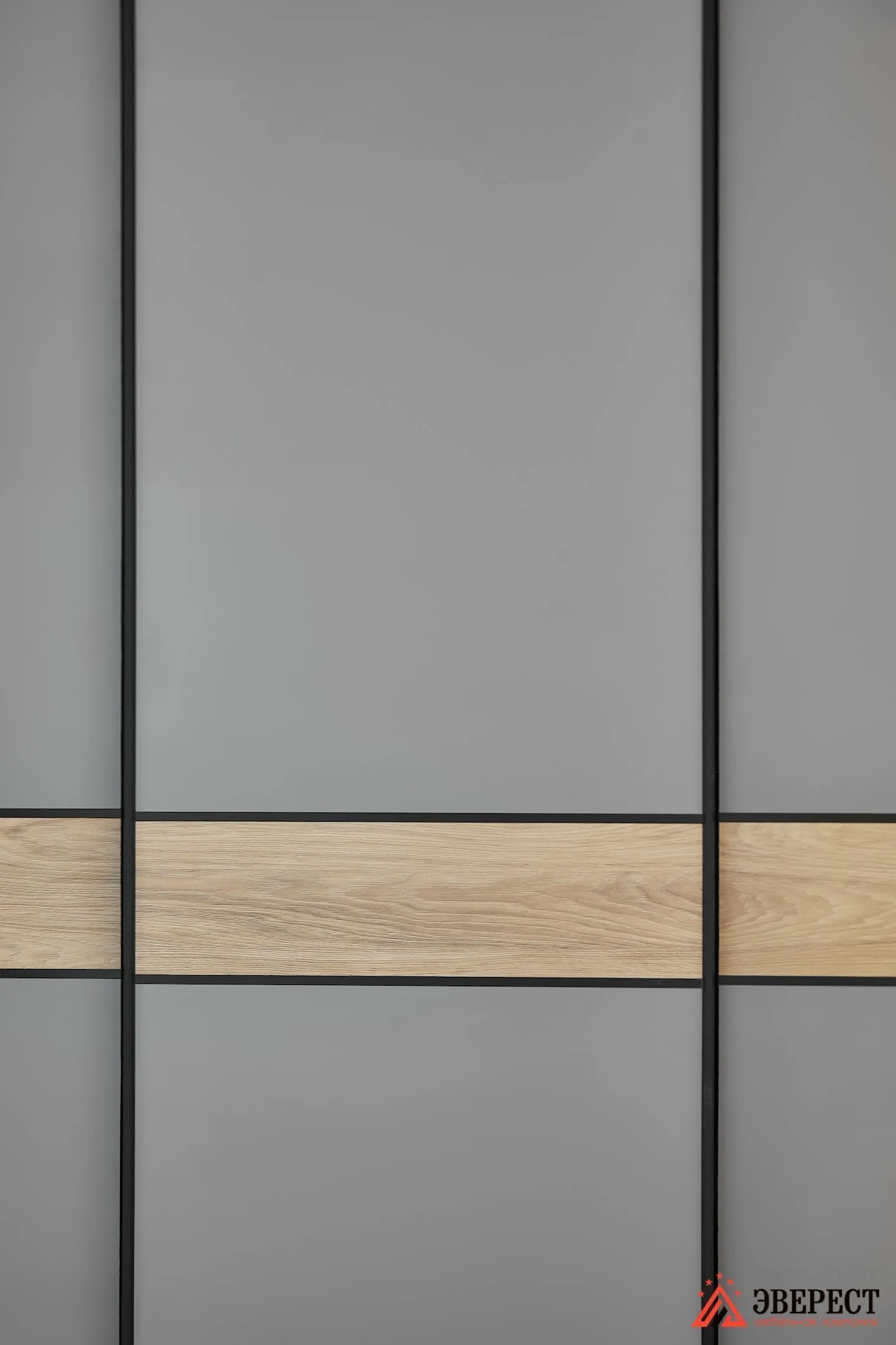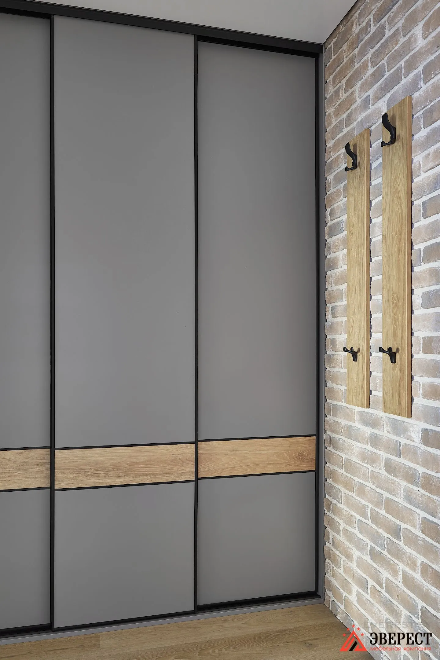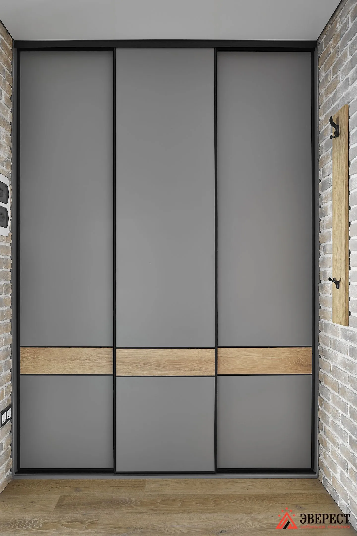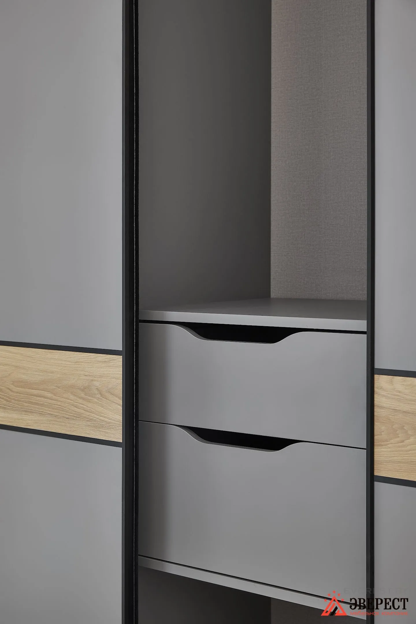 Открывается он с помощью дверей-купе. Выполнены они из ЛСПД EGGER в сером пыльном цвете, как и весь корпус шкафа. Чтобы объединить его с остальной мебелью, мы использовали вставки. Сделаны они из ЛДСП EGGER Дуб.