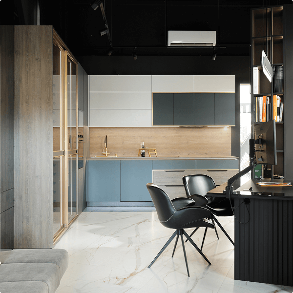 Наш салон — это открытая зона для встреч с заказчиками, где вы можете не спеша обсудить проект, потрогать материалы, увидеть реализованные решения и почувствовать атмосферу будущего дома.