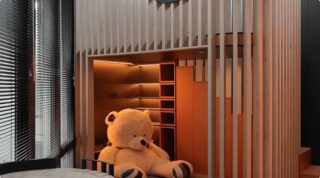 Особое внимание мы уделили семьям: в салоне создана уютная детская комната, полностью обставленная нашей мебелью. Пока вы вместе с дизайнером разрабатываете проект своей будущей мебели, ваши дети могут спокойно играть в комфортной и безопасной зоне — без суеты и отвлечений.